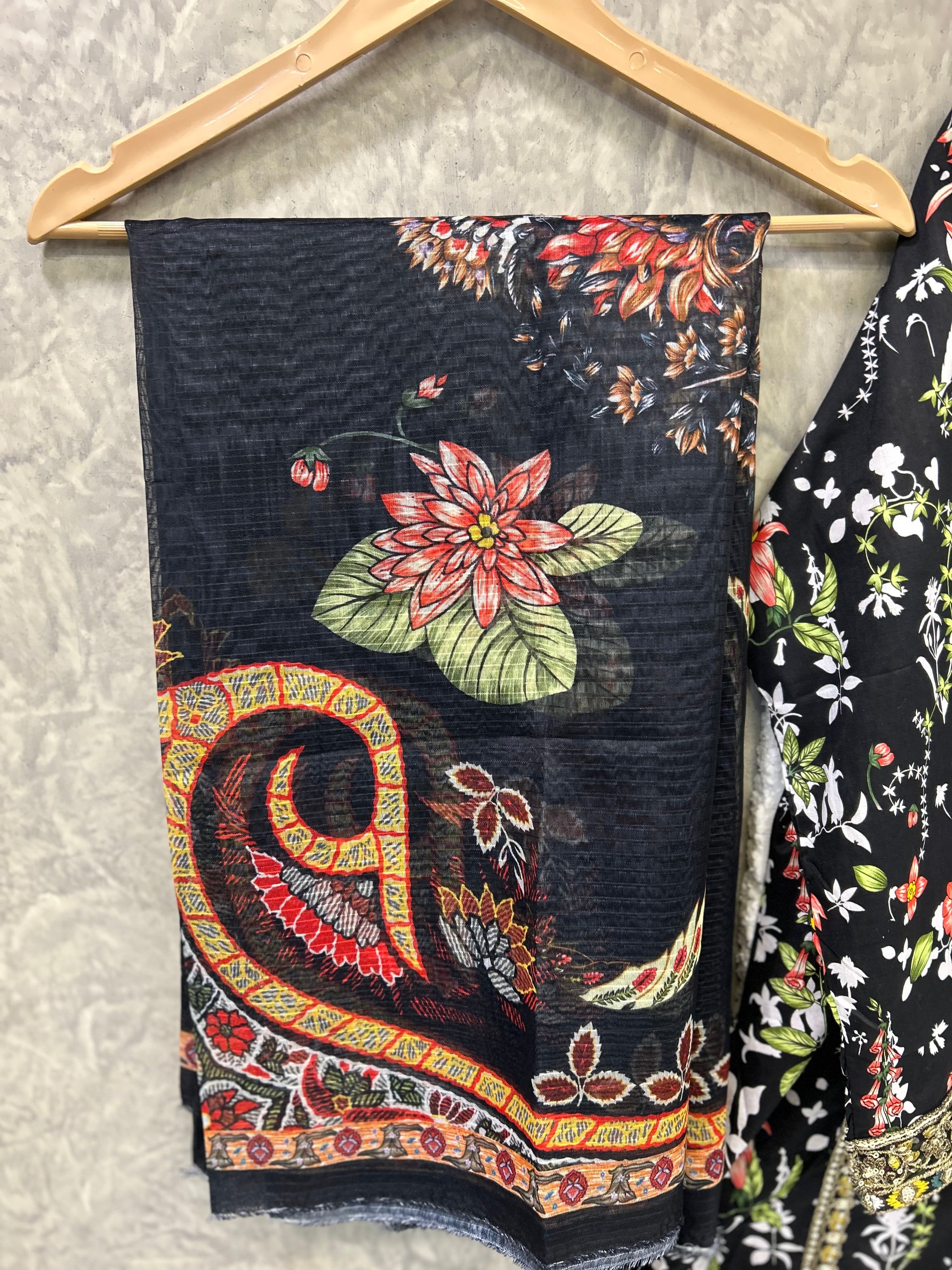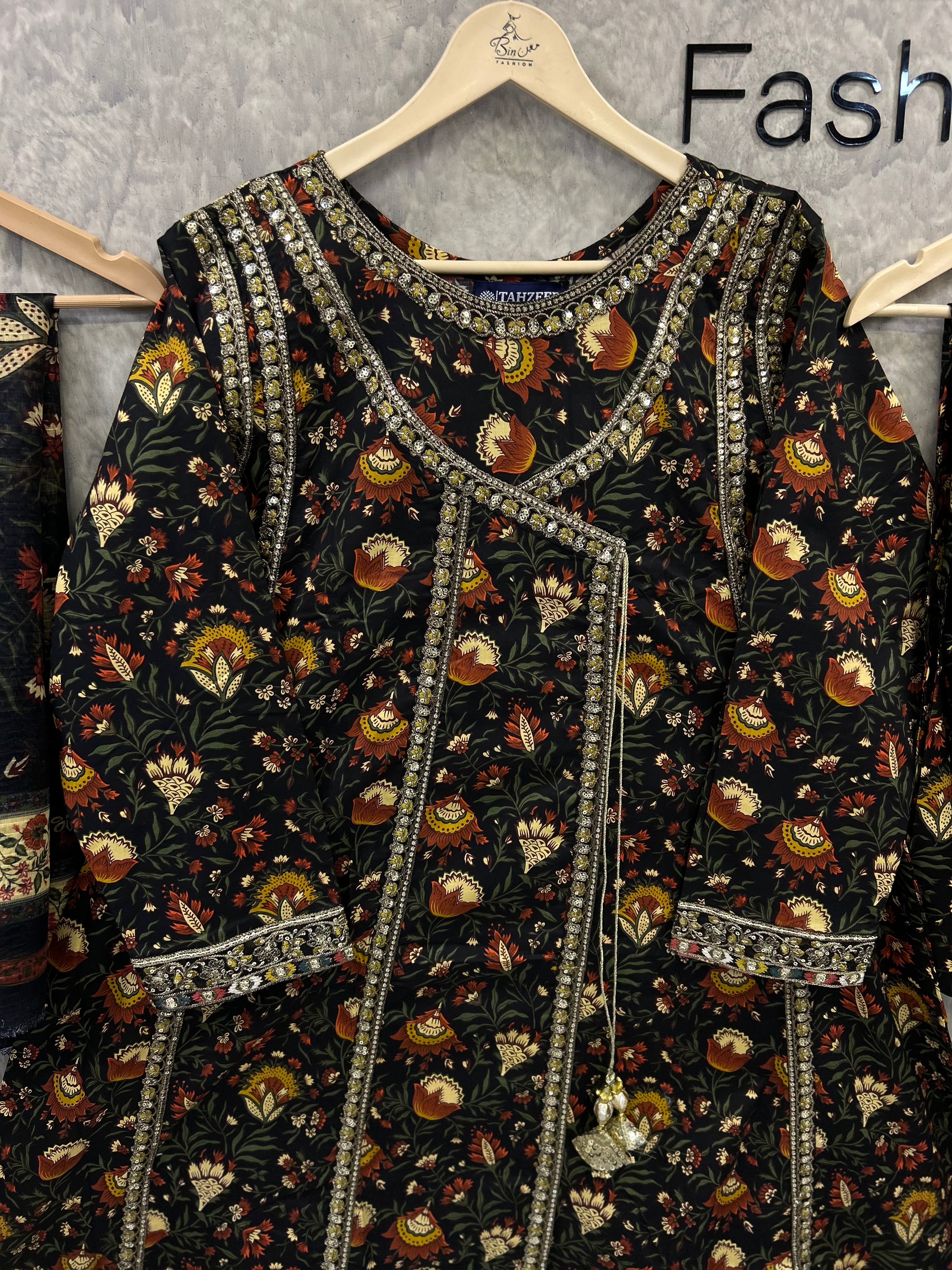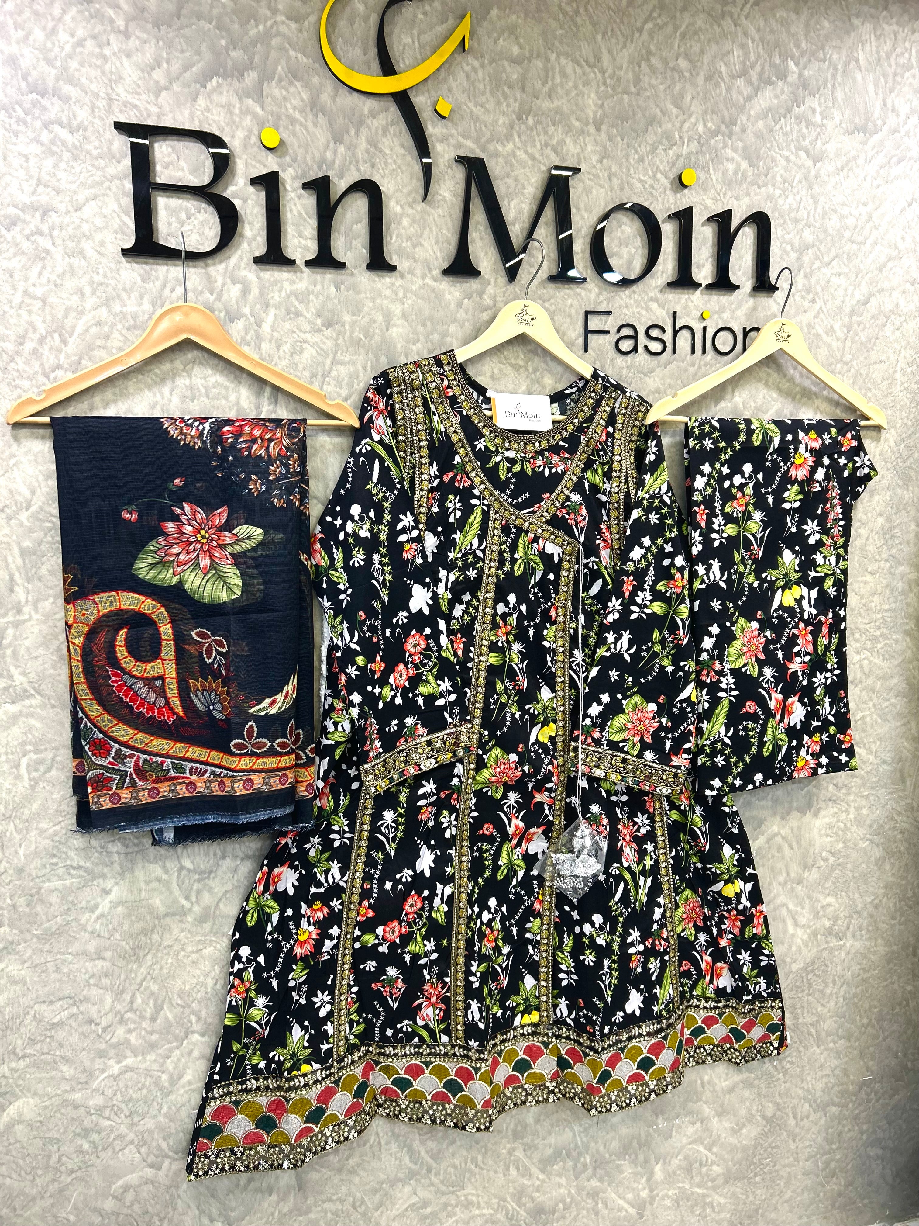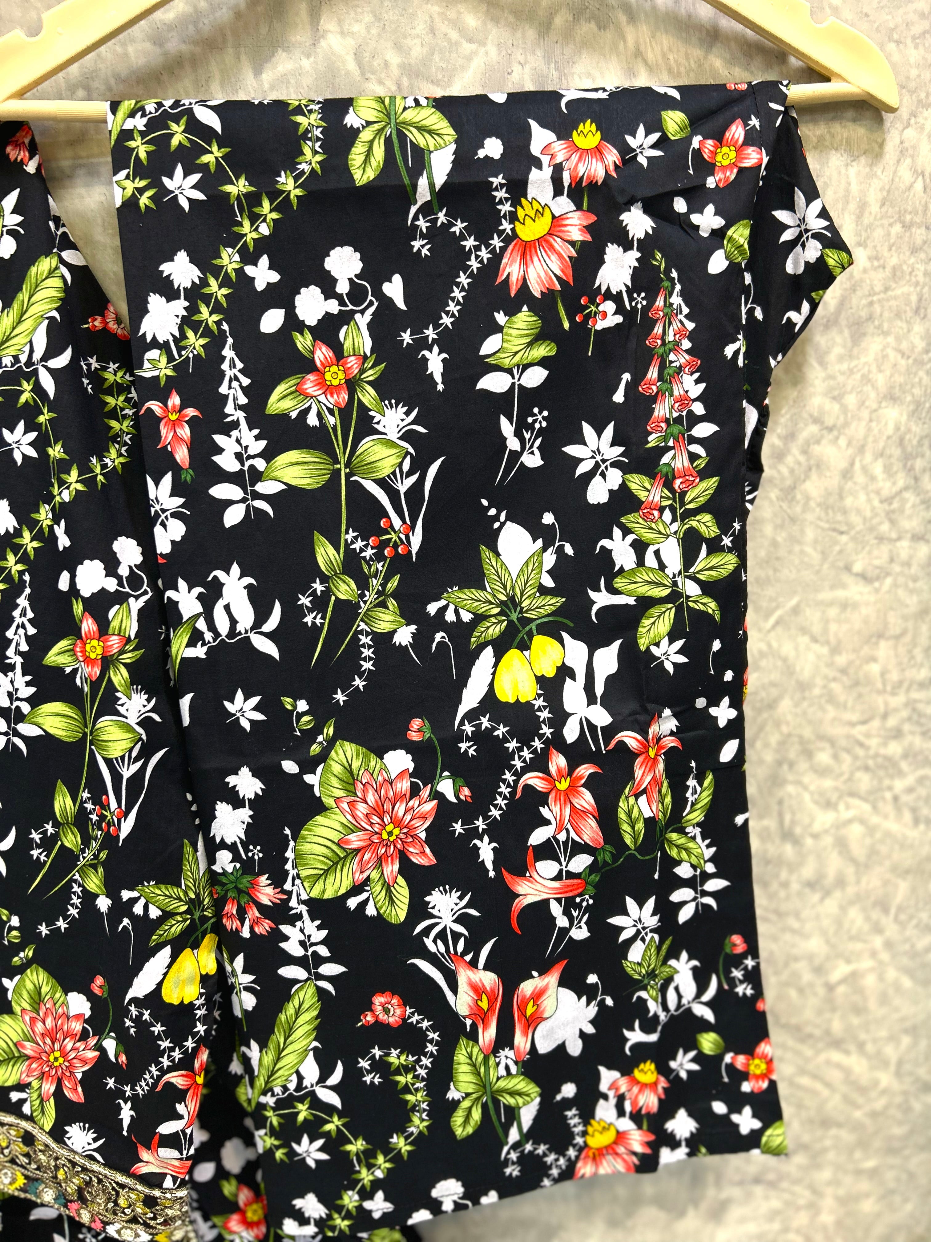 Obsidian Bloom is a timeless lawn outfit designed for women who love elegance with comfort. Crafted from breathable premium lawn fabric, this dress features a rich black base adorned with intricate floral prints in warm earthy tones. The kurta is beautifully detailed with a printed neckline and border accents, giving it a refined and graceful look. Paired with a matching printed trouser and a complementing dupatta, this ensemble is perfect for daily wear, casual gatherings, and summer outings. Lightweight, stylish, and effortlessly classy — a must-have for your seasonal wardrobe.