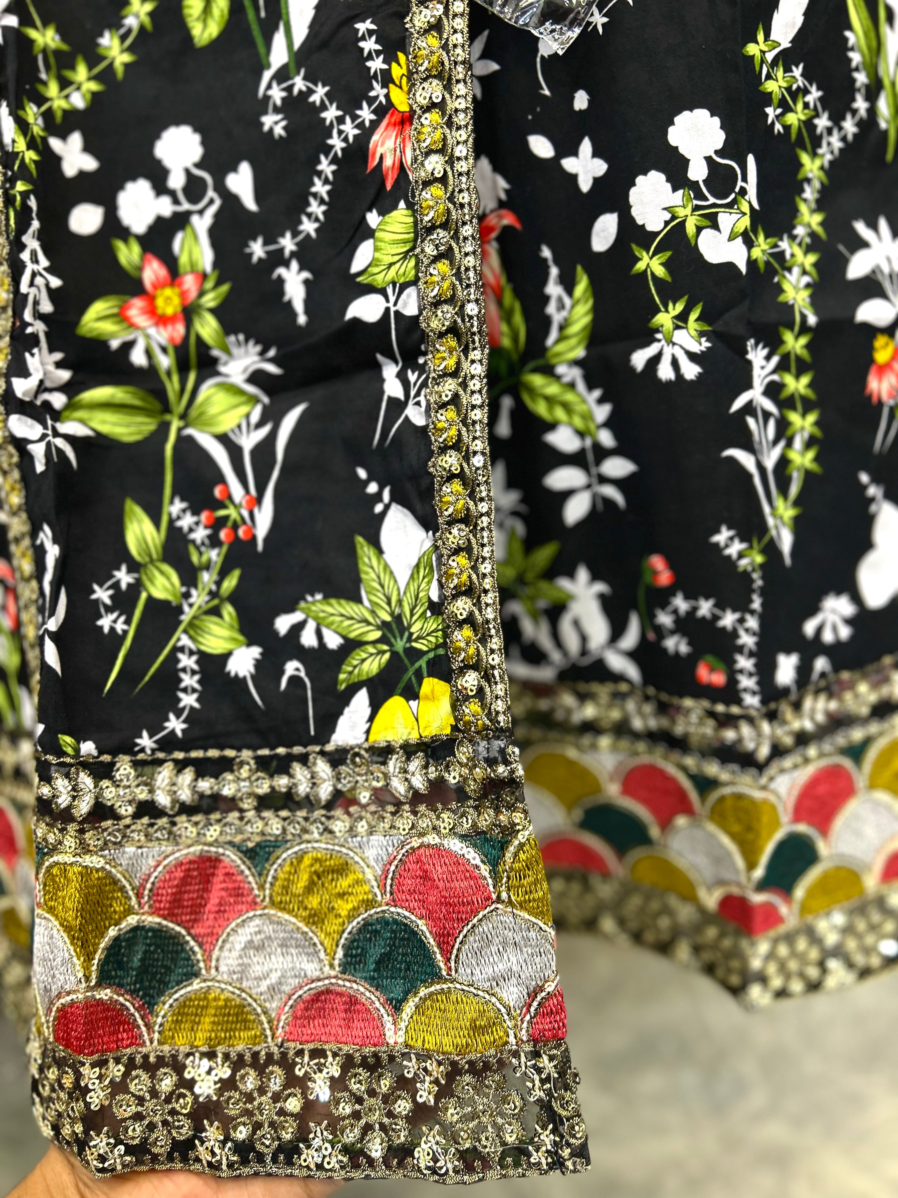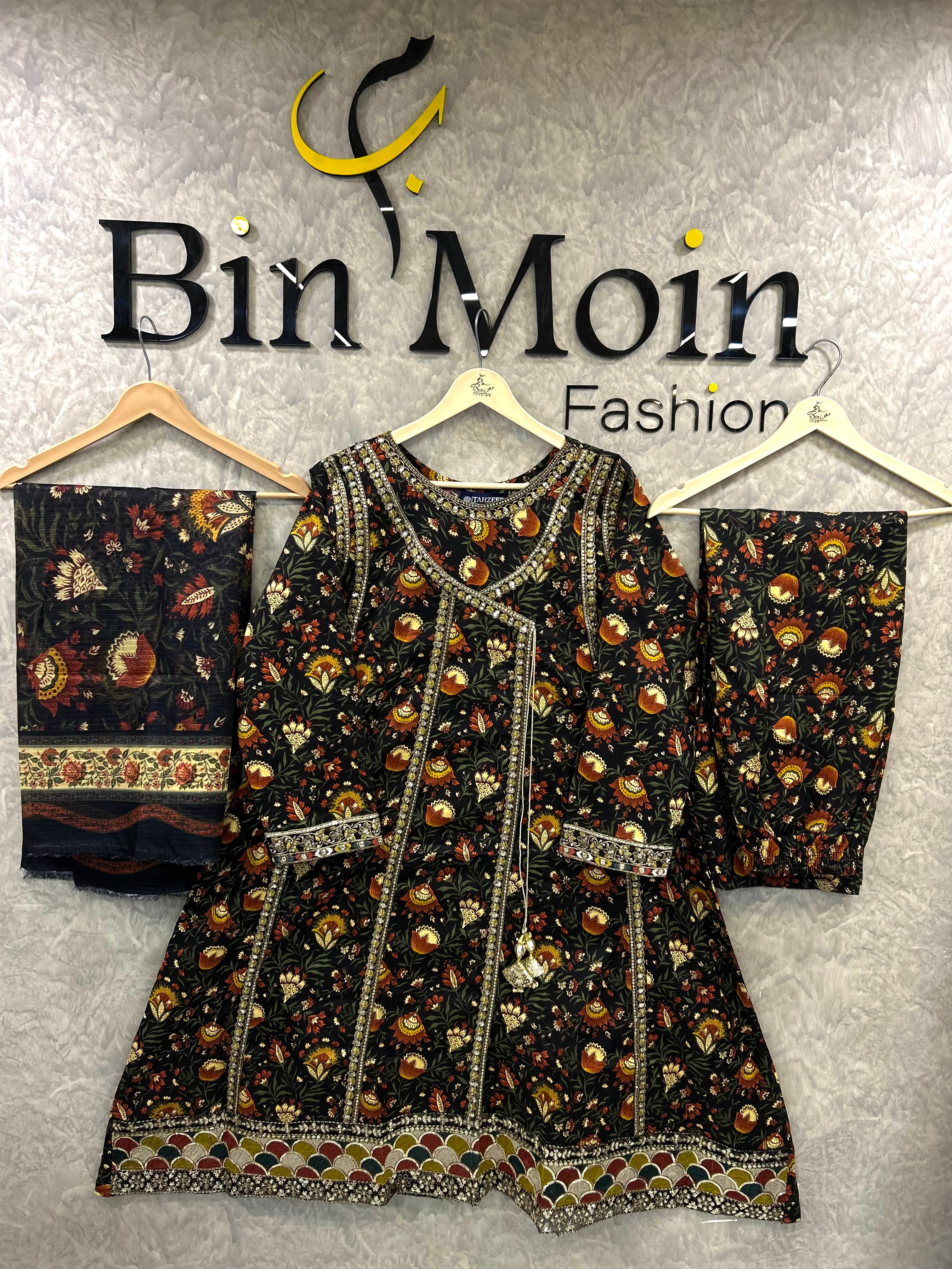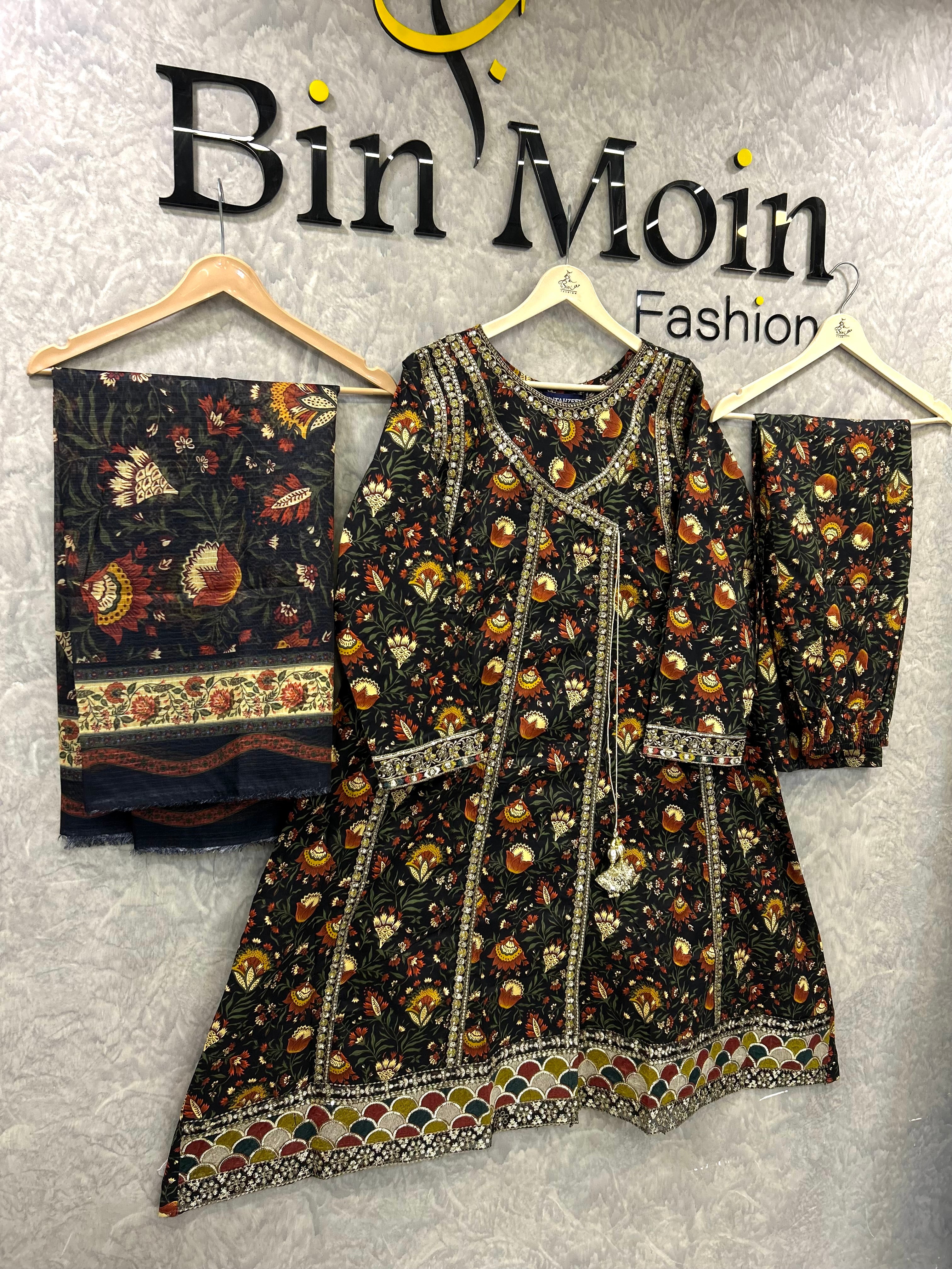 Obsidian Bloom is a timeless lawn outfit designed for women who love elegance with comfort. Crafted from breathable premium lawn fabric, this dress features a rich black base adorned with intricate floral prints in warm earthy tones. The kurta is beautifully detailed with a printed neckline and border accents, giving it a refined and graceful look. Paired with a matching printed trouser and a complementing dupatta, this ensemble is perfect for daily wear, casual gatherings, and summer outings. Lightweight, stylish, and effortlessly classy — a must-have for your seasonal wardrobe.