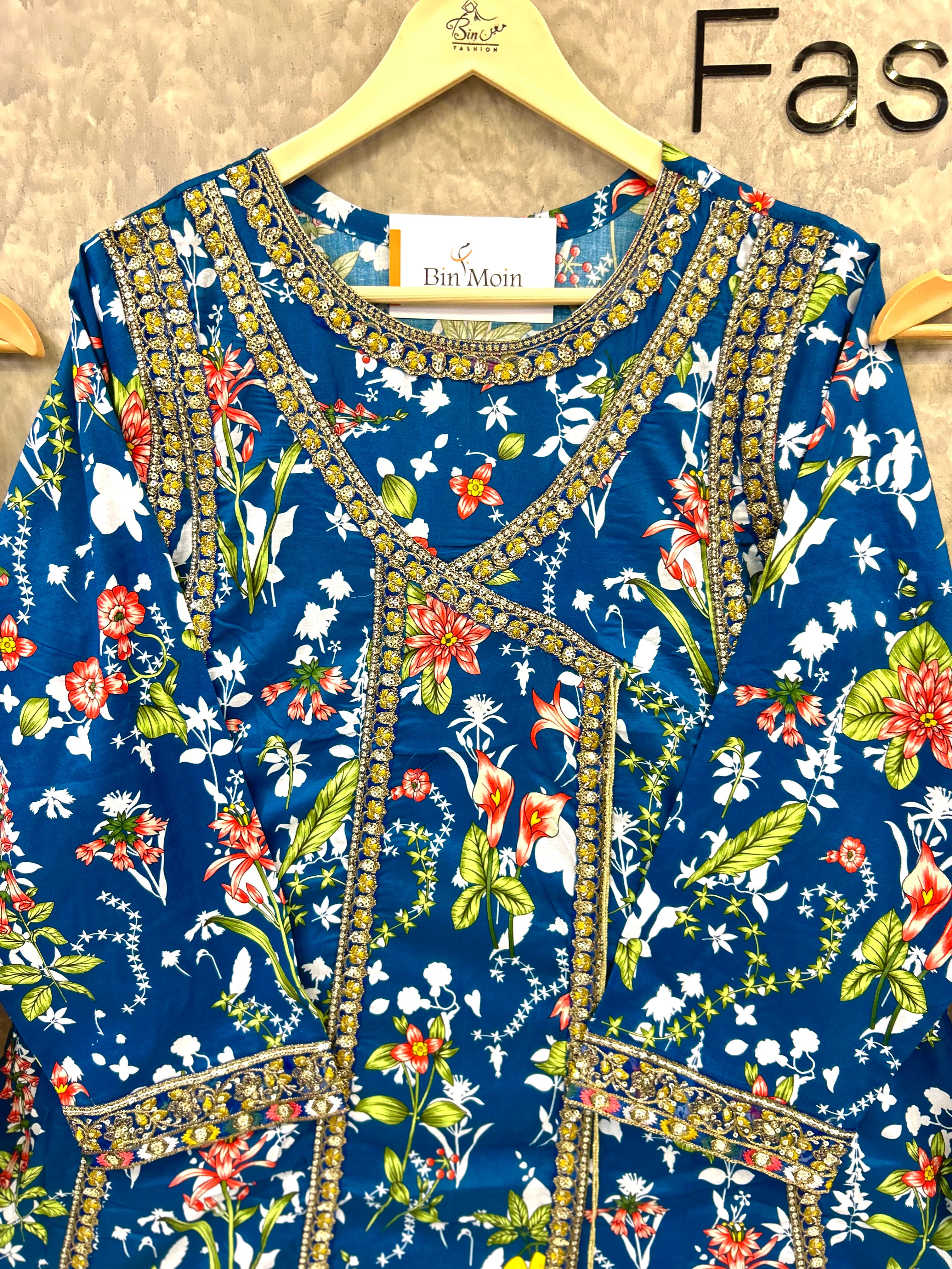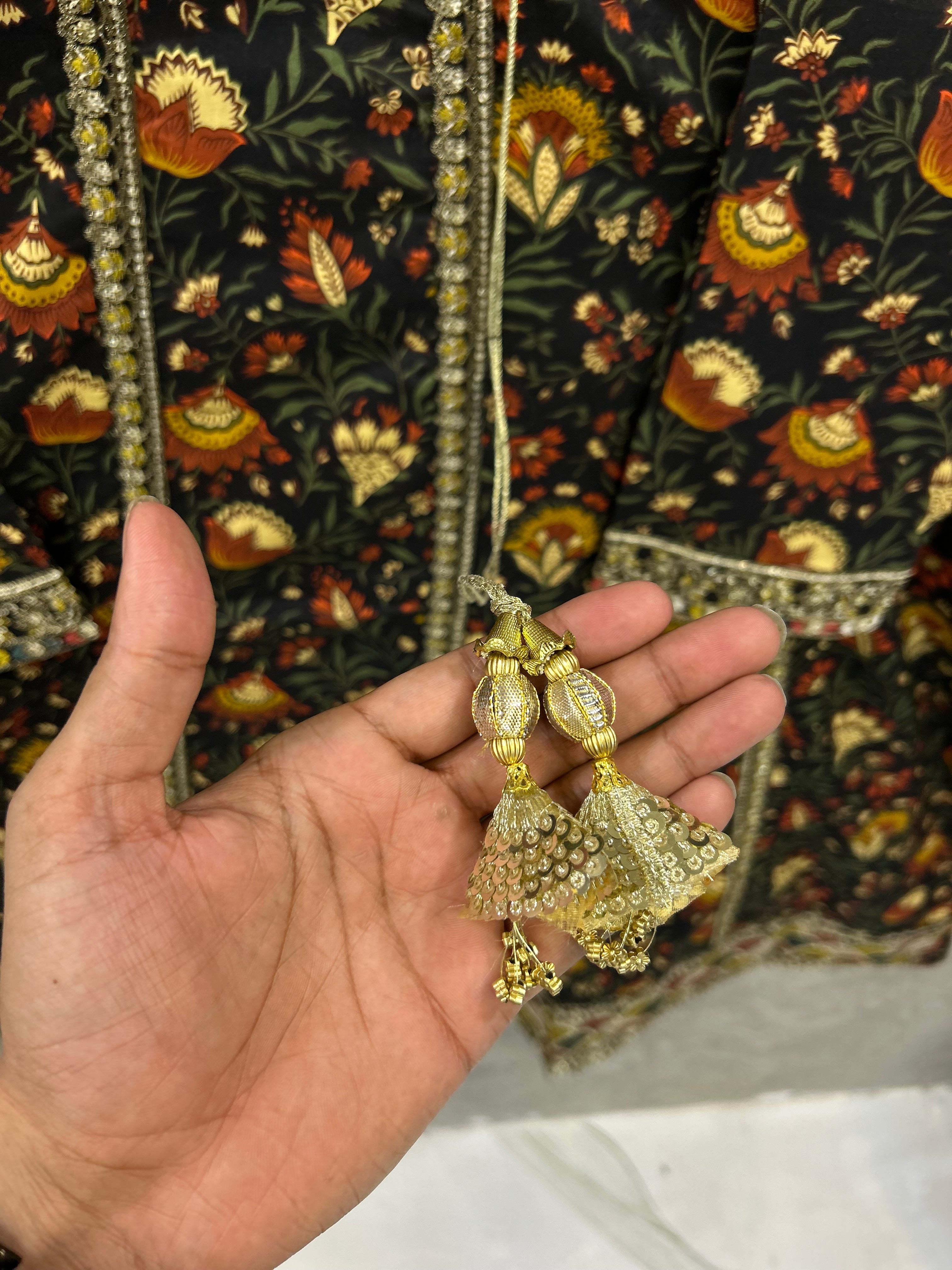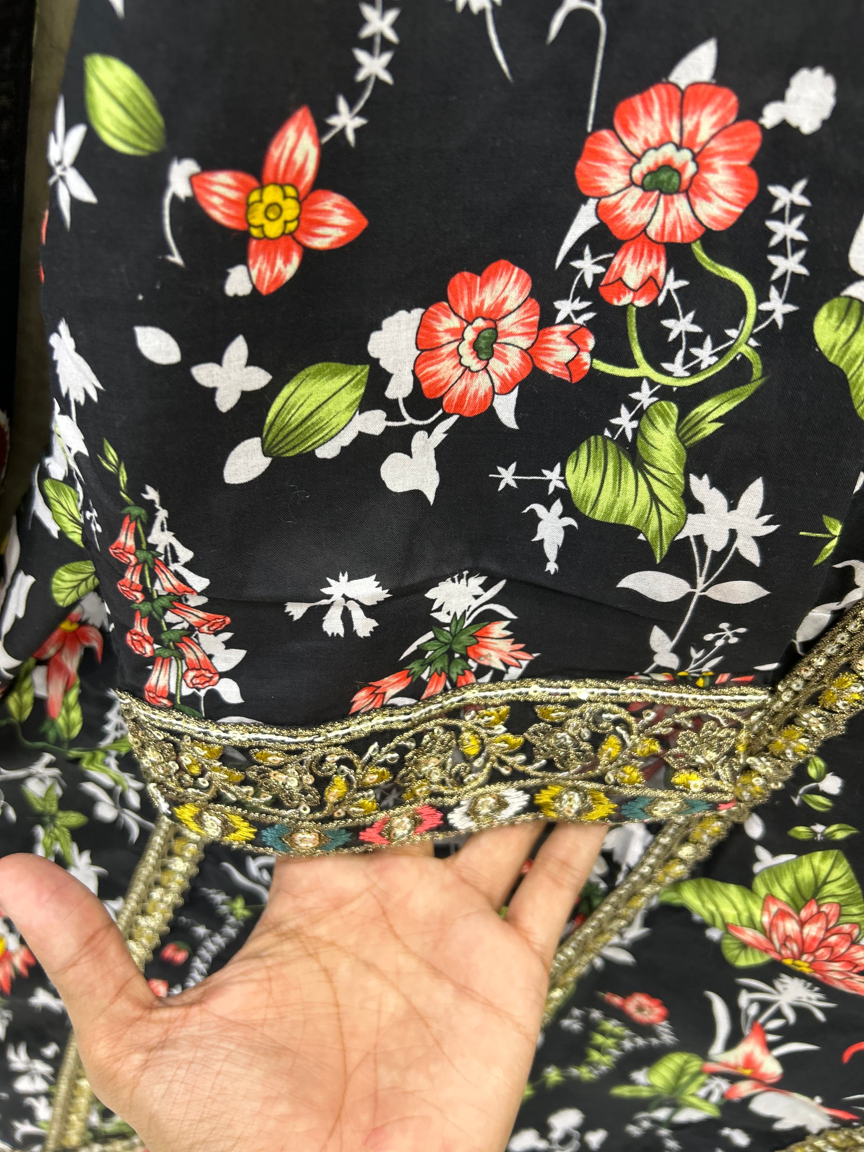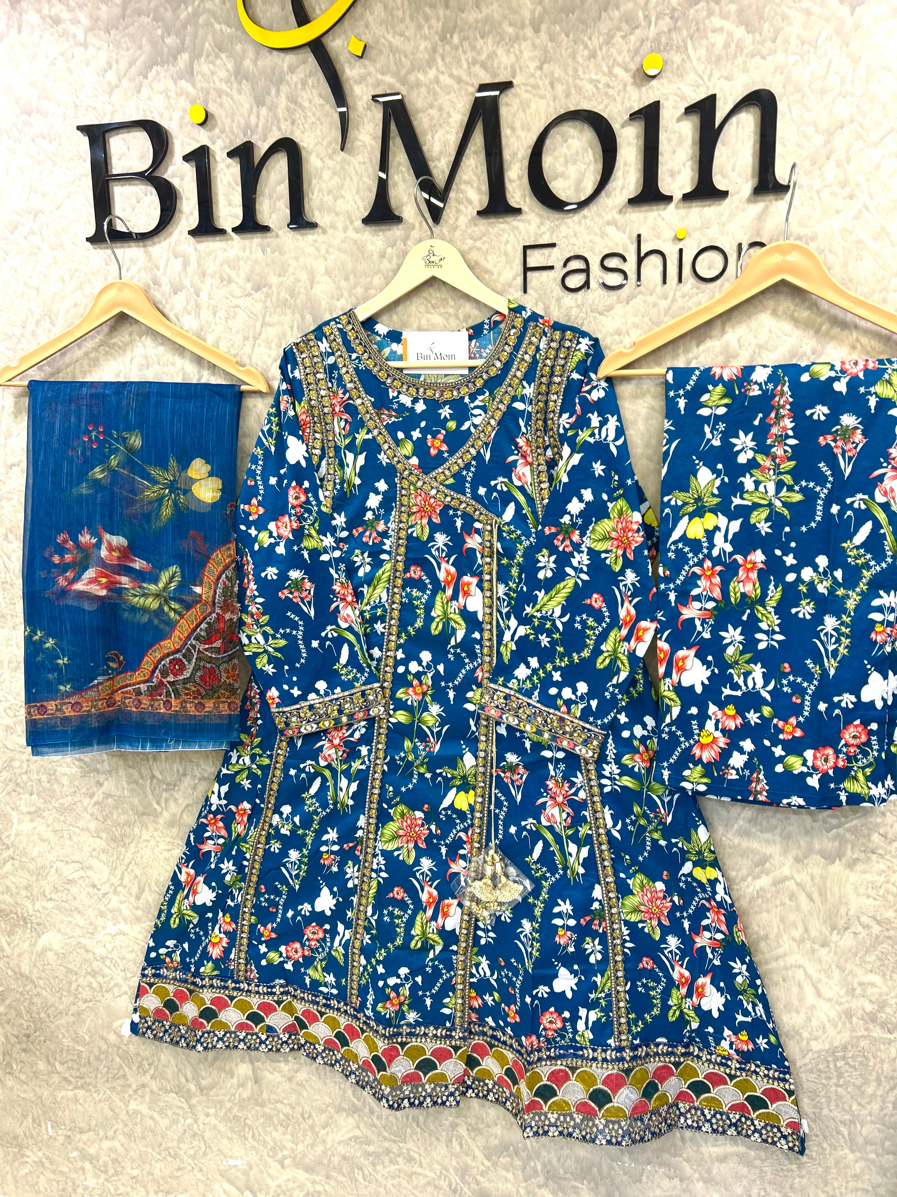 Obsidian Bloom is a timeless lawn outfit designed for women who love elegance with comfort. Crafted from breathable premium lawn fabric, this dress features a rich black base adorned with intricate floral prints in warm earthy tones. The kurta is beautifully detailed with a printed neckline and border accents, giving it a refined and graceful look. Paired with a matching printed trouser and a complementing dupatta, this ensemble is perfect for daily wear, casual gatherings, and summer outings. Lightweight, stylish, and effortlessly classy — a must-have for your seasonal wardrobe.