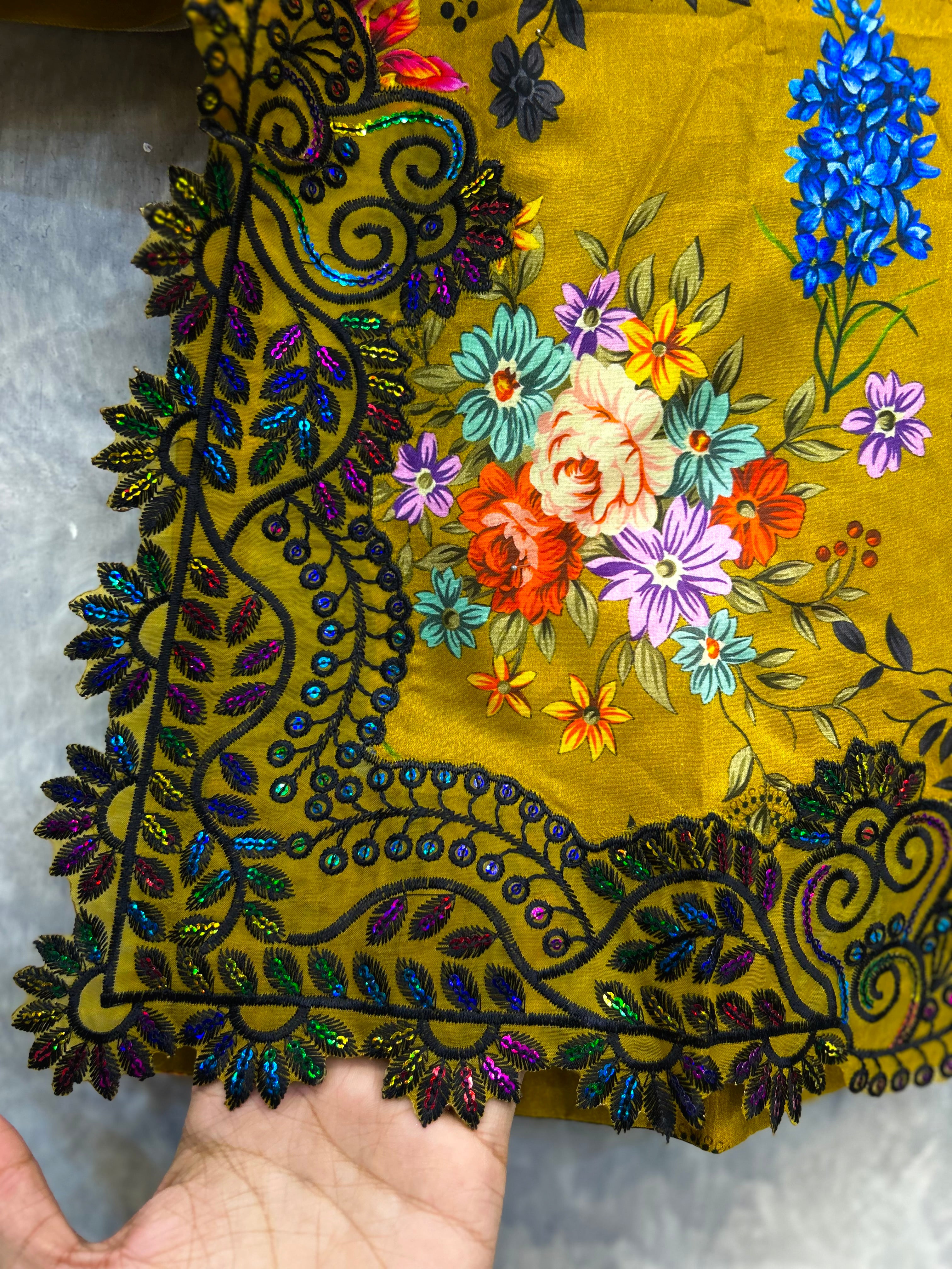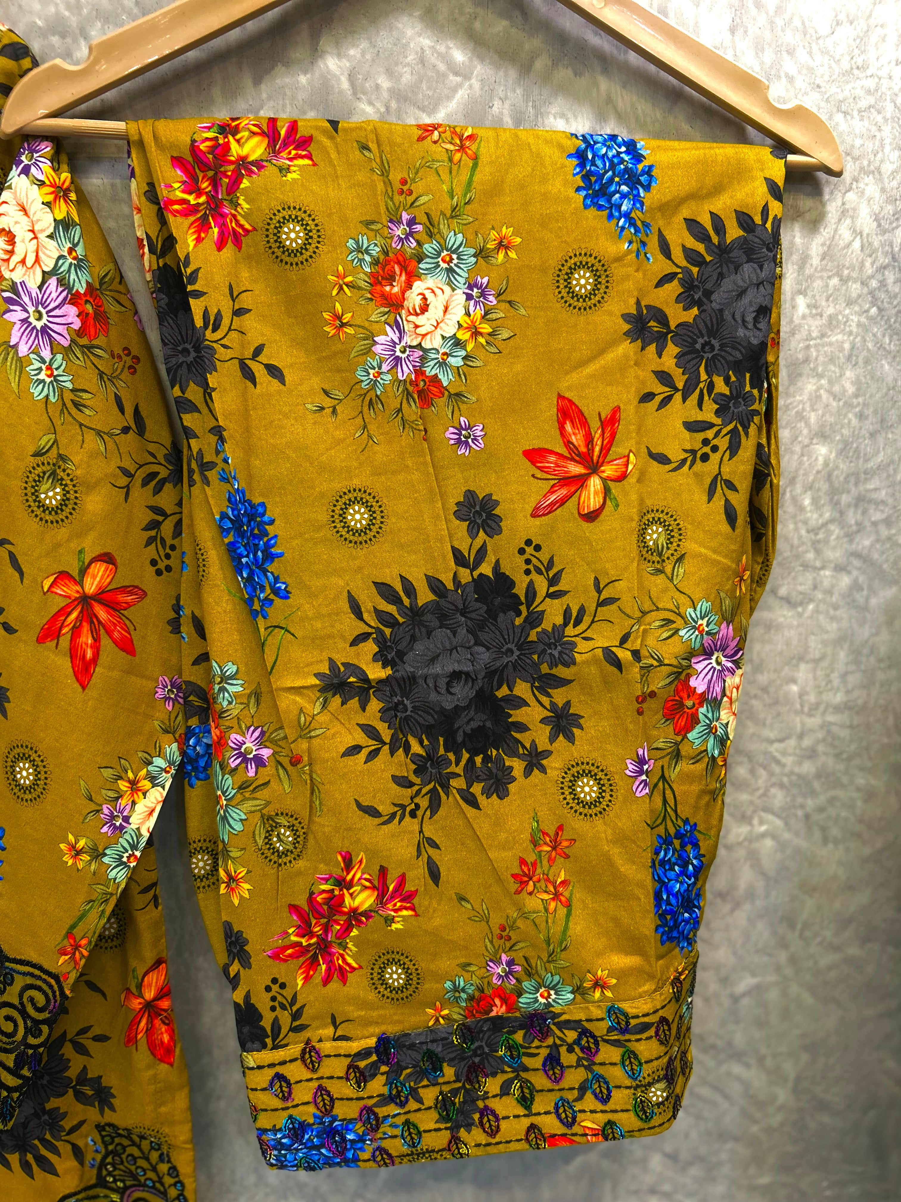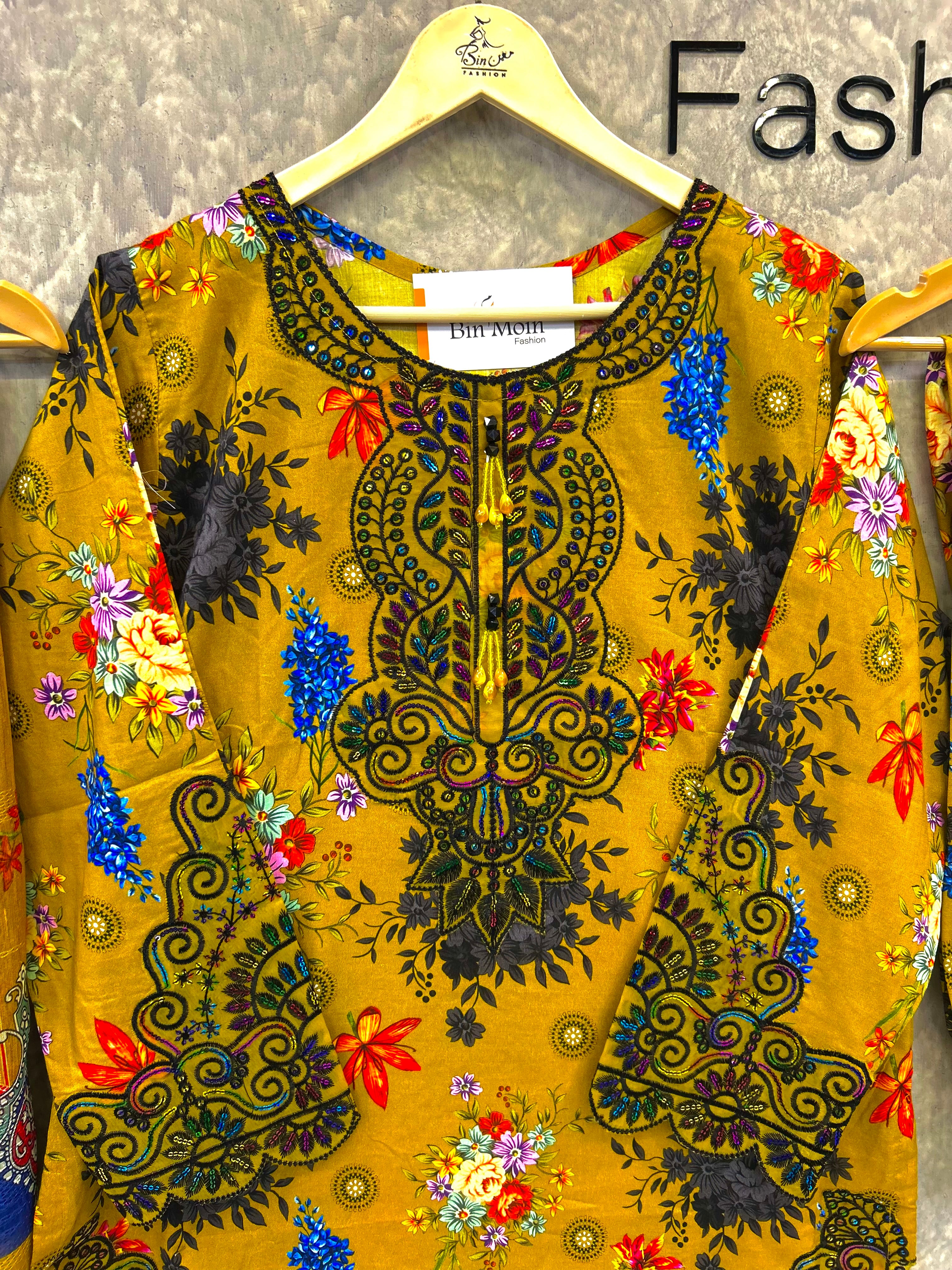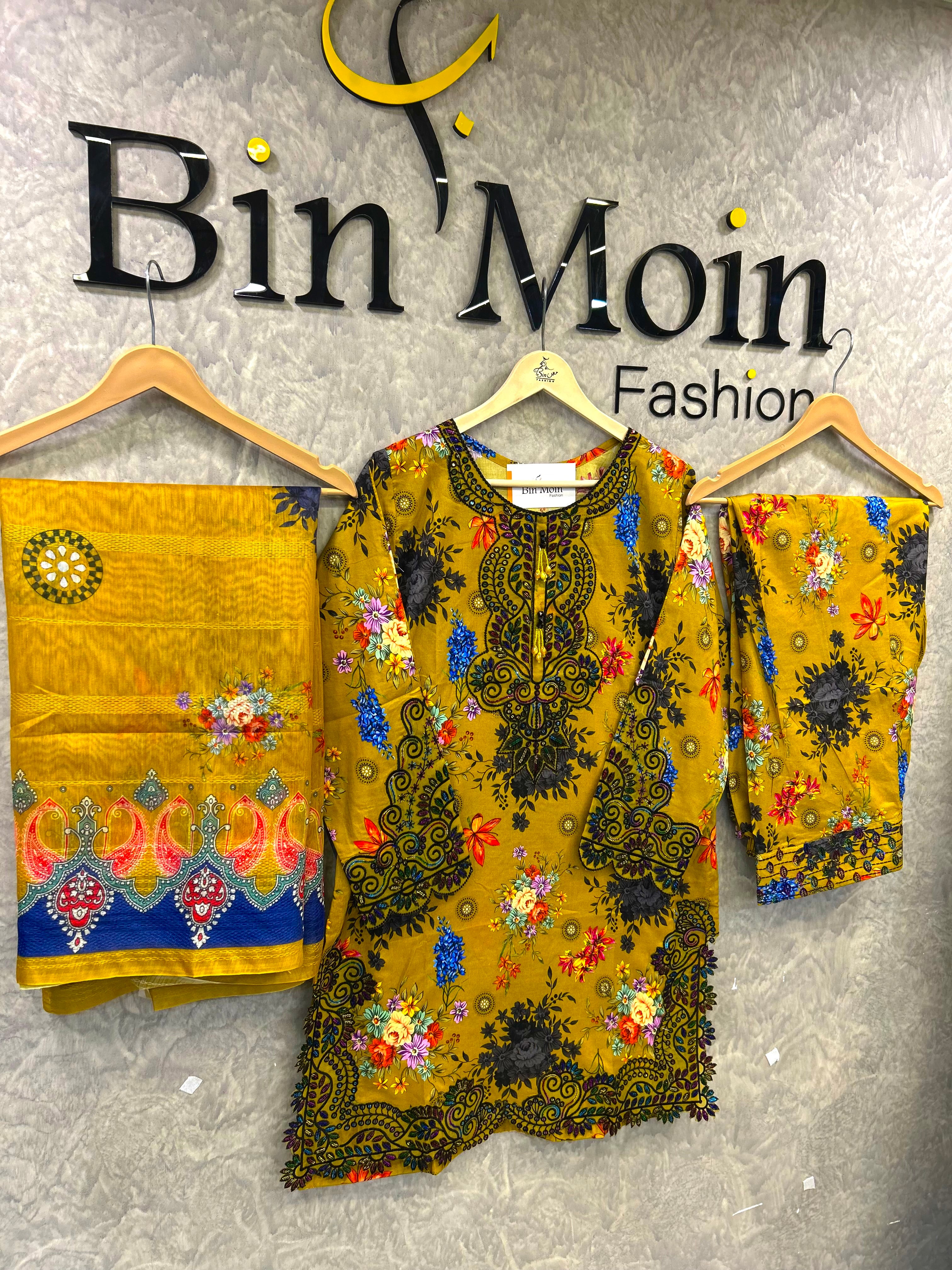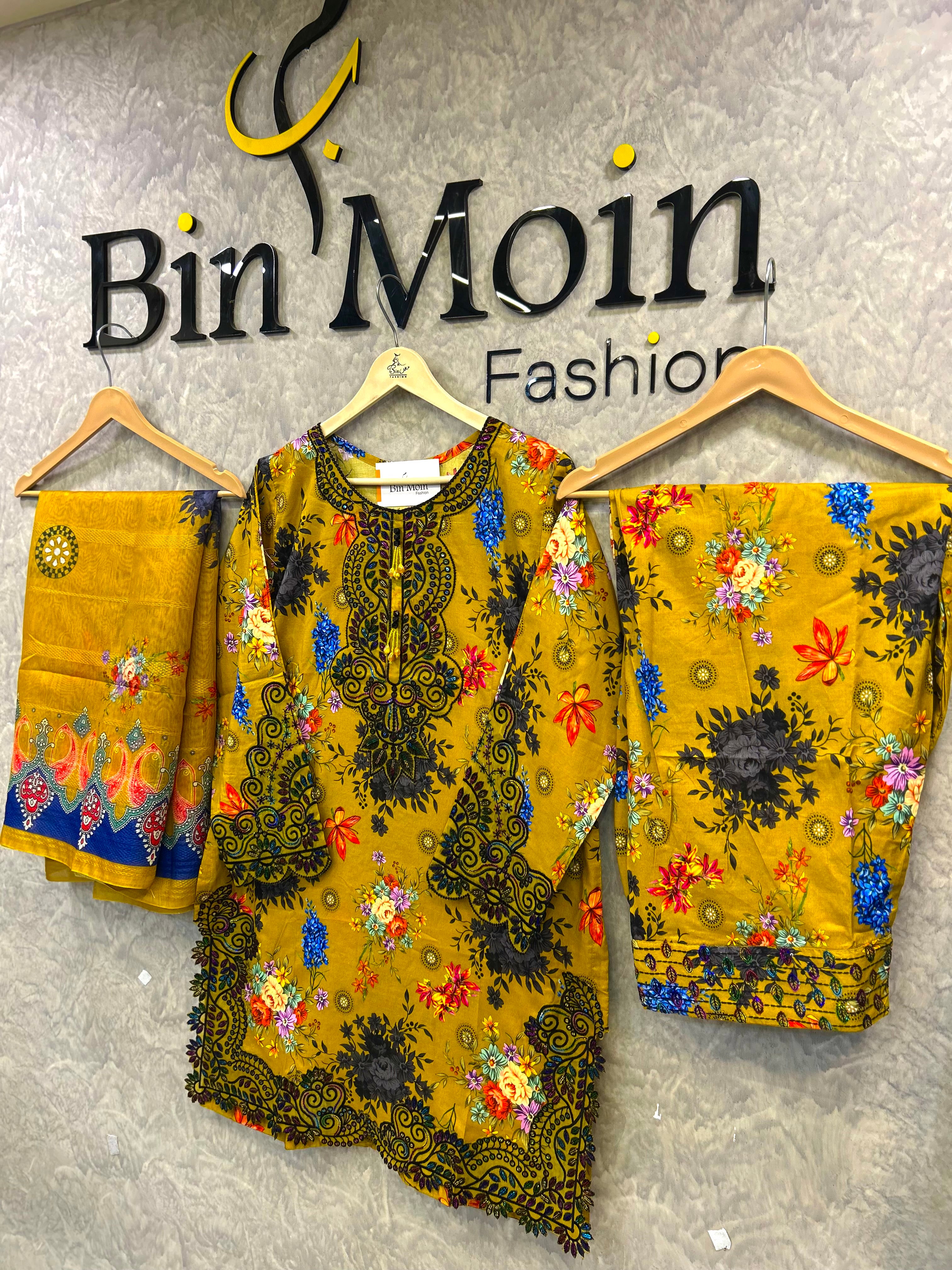 Refresh your summer style with this elegant 3-piece embroidered lawn suit, featuring a vibrant mustard lawn shirt adorned with delicate embroidery and floral prints, paired with a matching printed cotton trouser and a coordinated lawn dupatta. Lightweight, breathable, and perfect for daywear and festive gatherings.