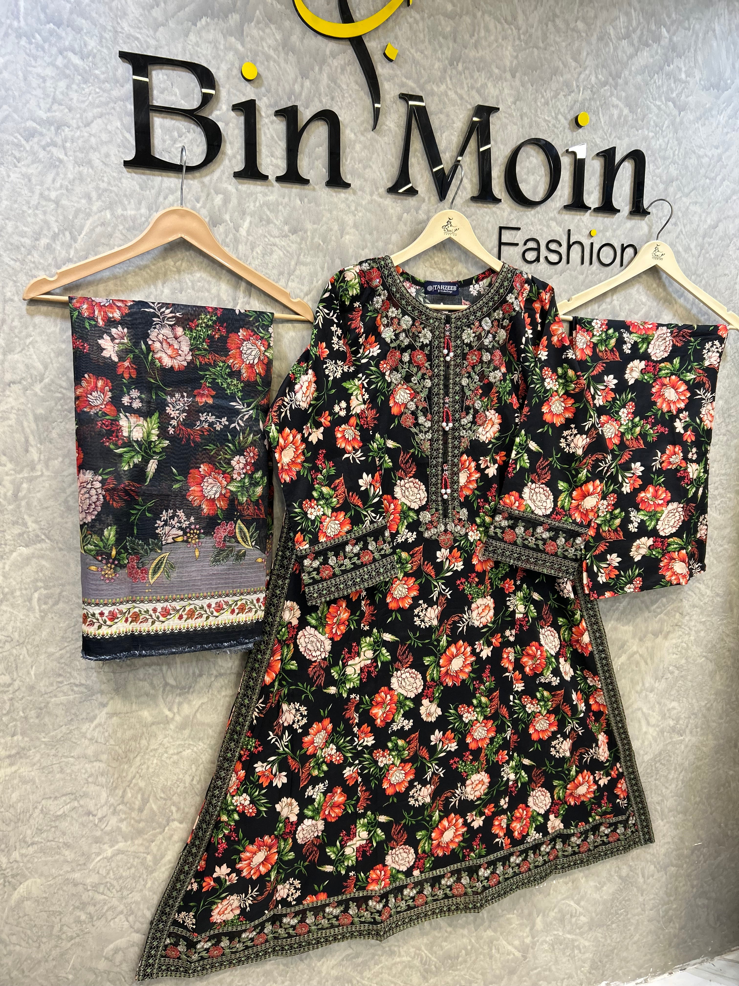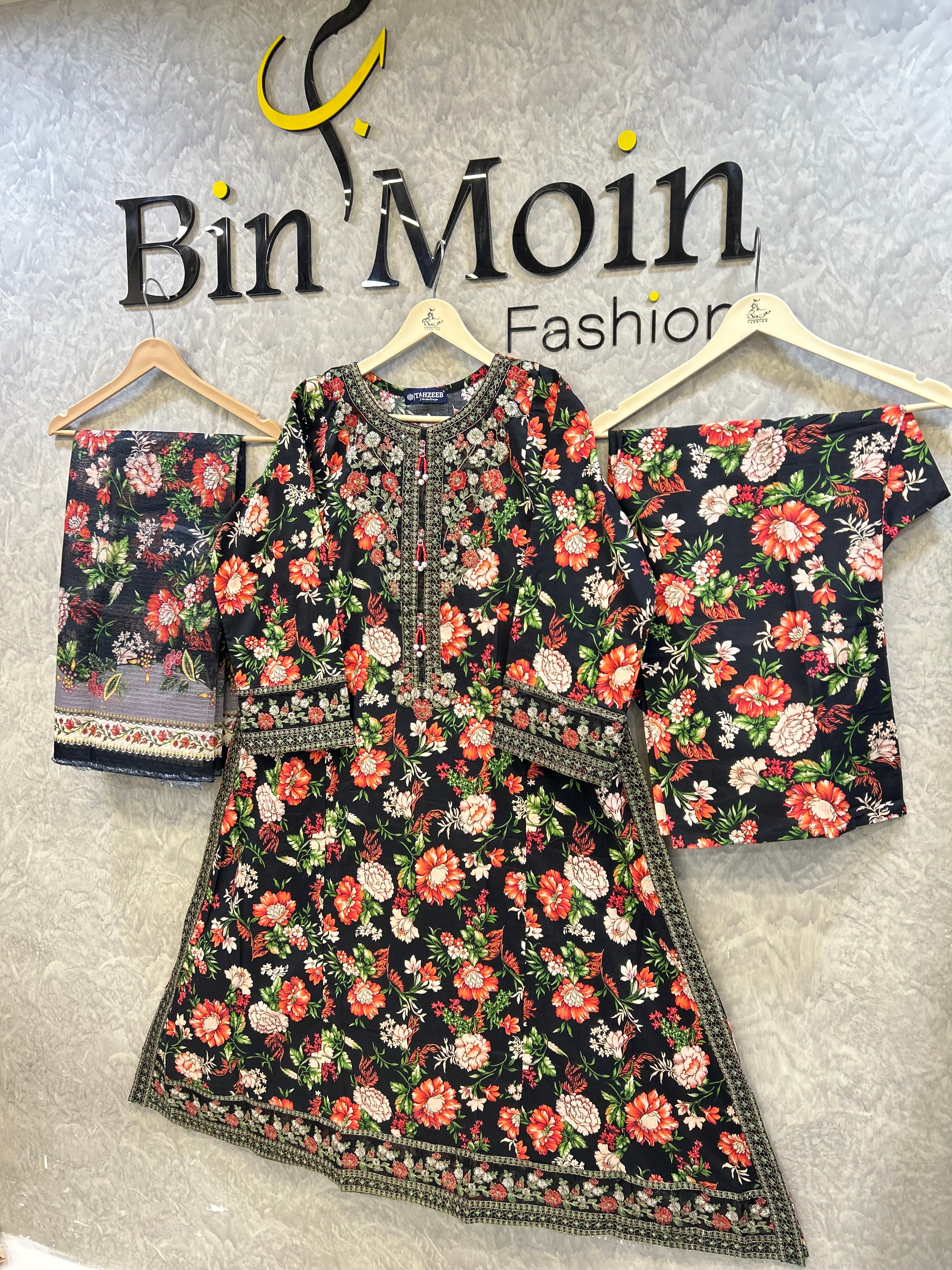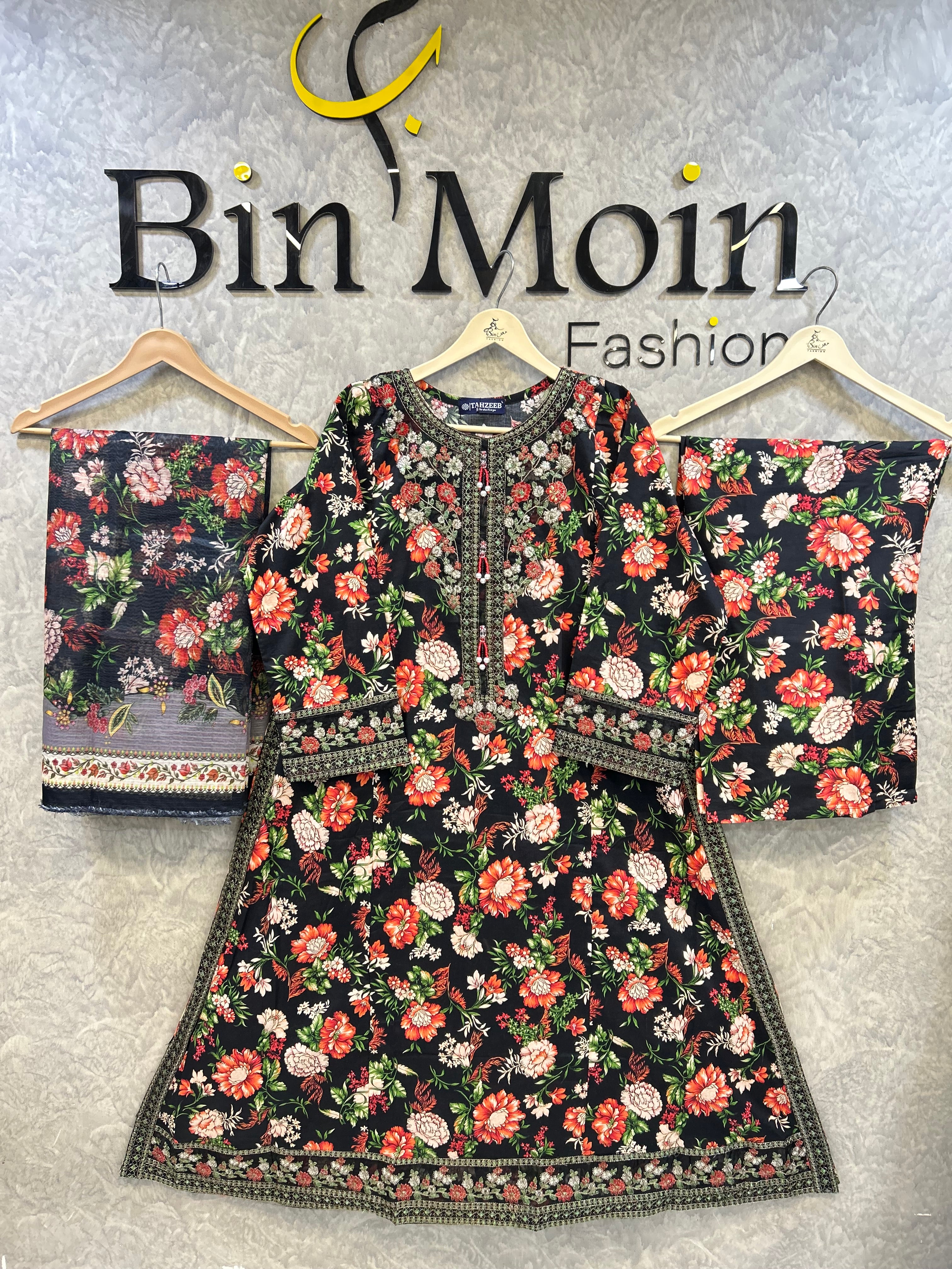 Make a bold and unforgettable statement with this striking 3-piece floral ensemble by Bin Moin Fashion. Set against a deep, dramatic black canvas, this outfit features a breathtakingly vibrant floral print blooming in rich shades of red, coral, and green. The high-contrast design makes it an absolute showstopper, perfect for evening wear, festive gatherings, or anytime you want to stand out with effortless elegance.