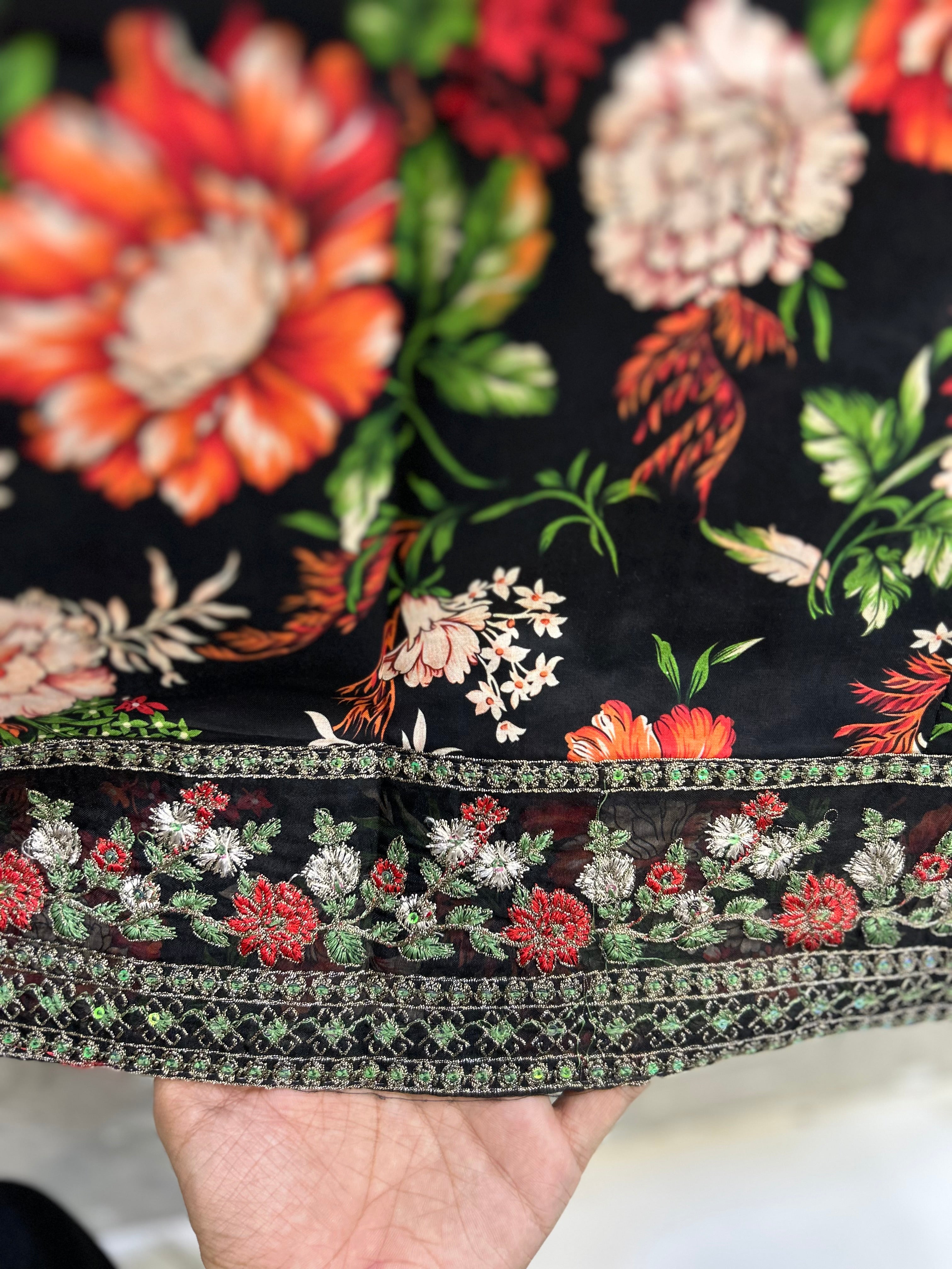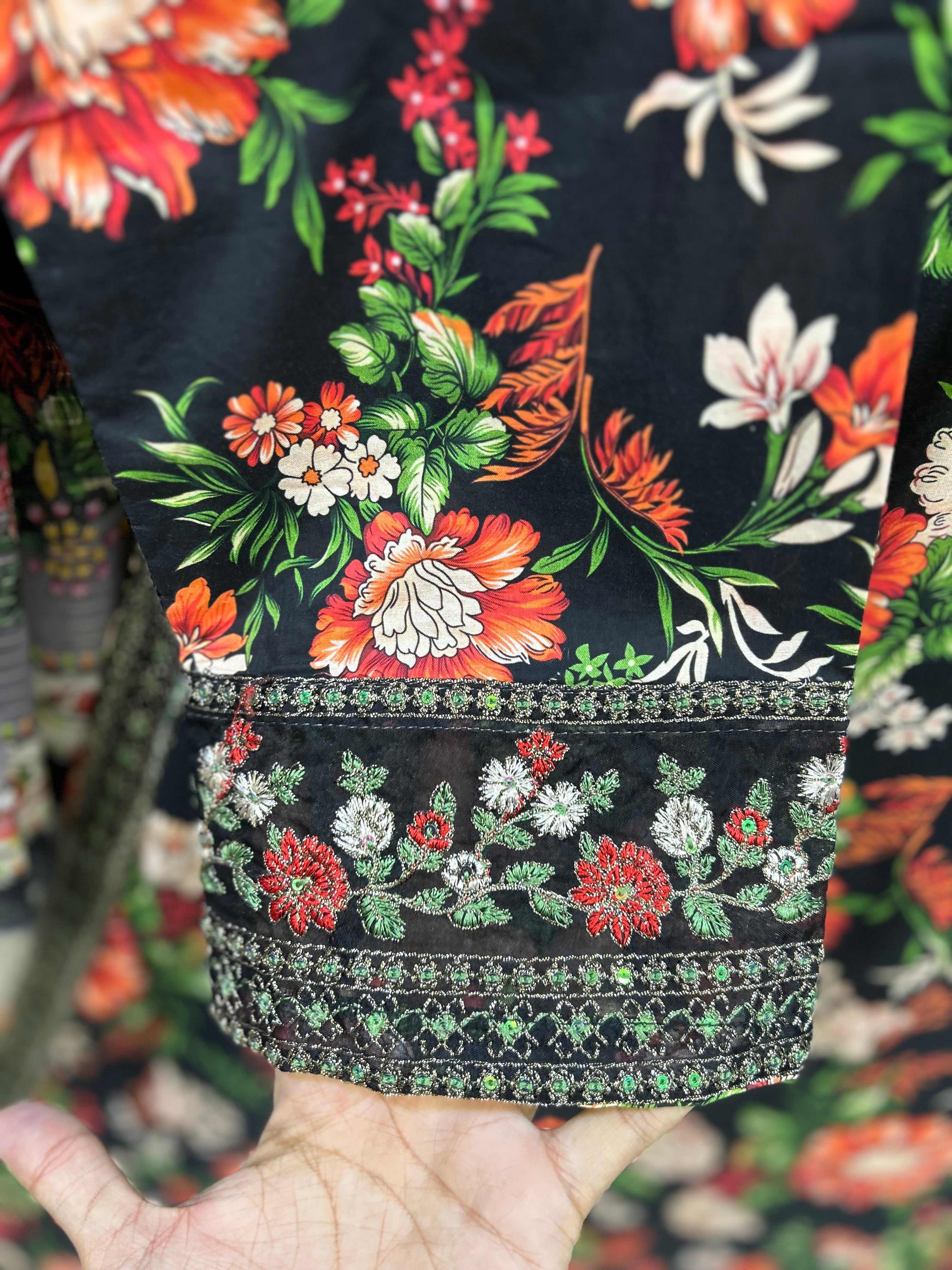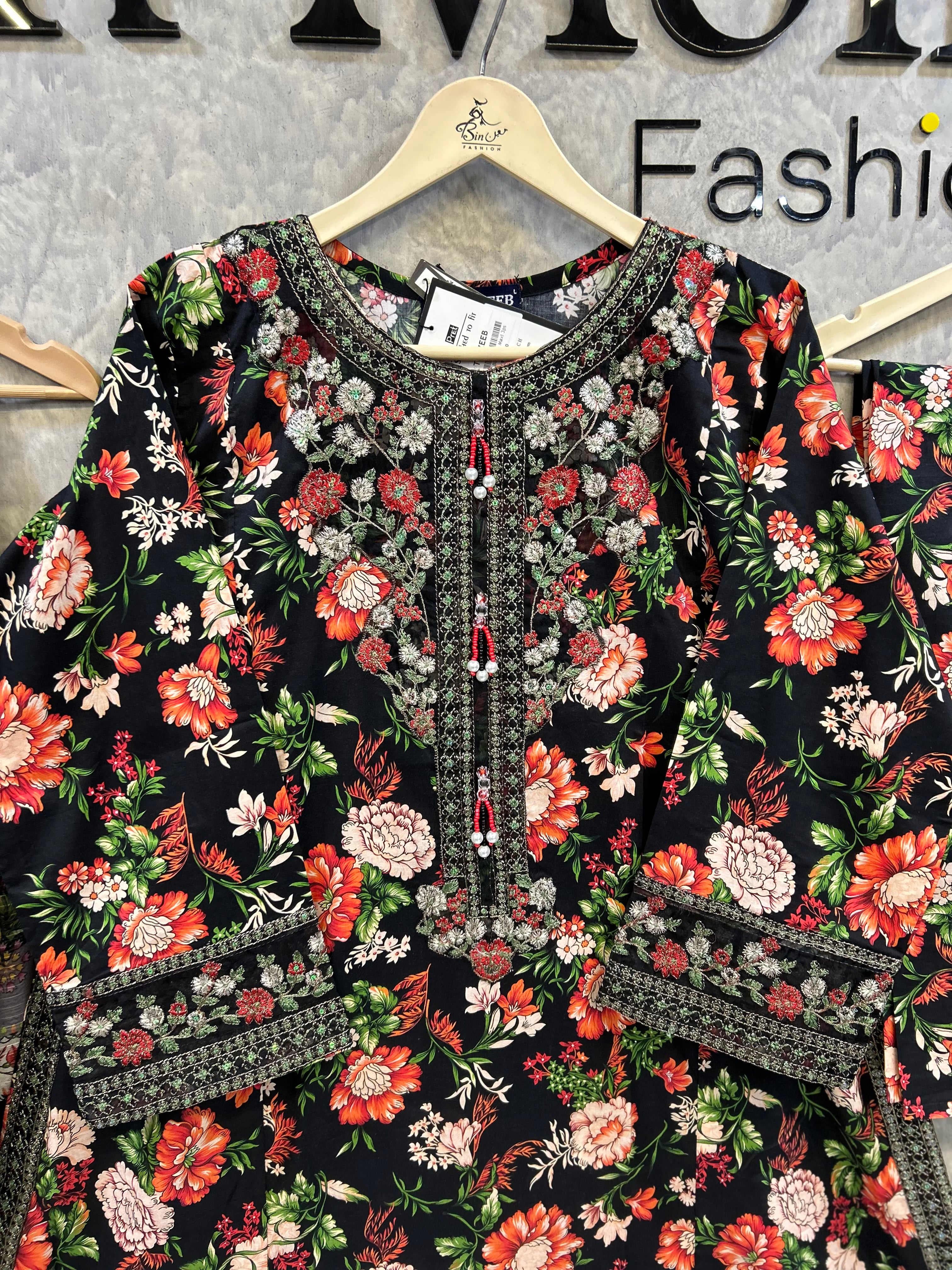Make a bold and unforgettable statement with this striking 3-piece floral ensemble by Bin Moin Fashion. Set against a deep, dramatic black canvas, this outfit features a breathtakingly vibrant floral print blooming in rich shades of red, coral, and green. The high-contrast design makes it an absolute showstopper, perfect for evening wear, festive gatherings, or anytime you want to stand out with effortless elegance.