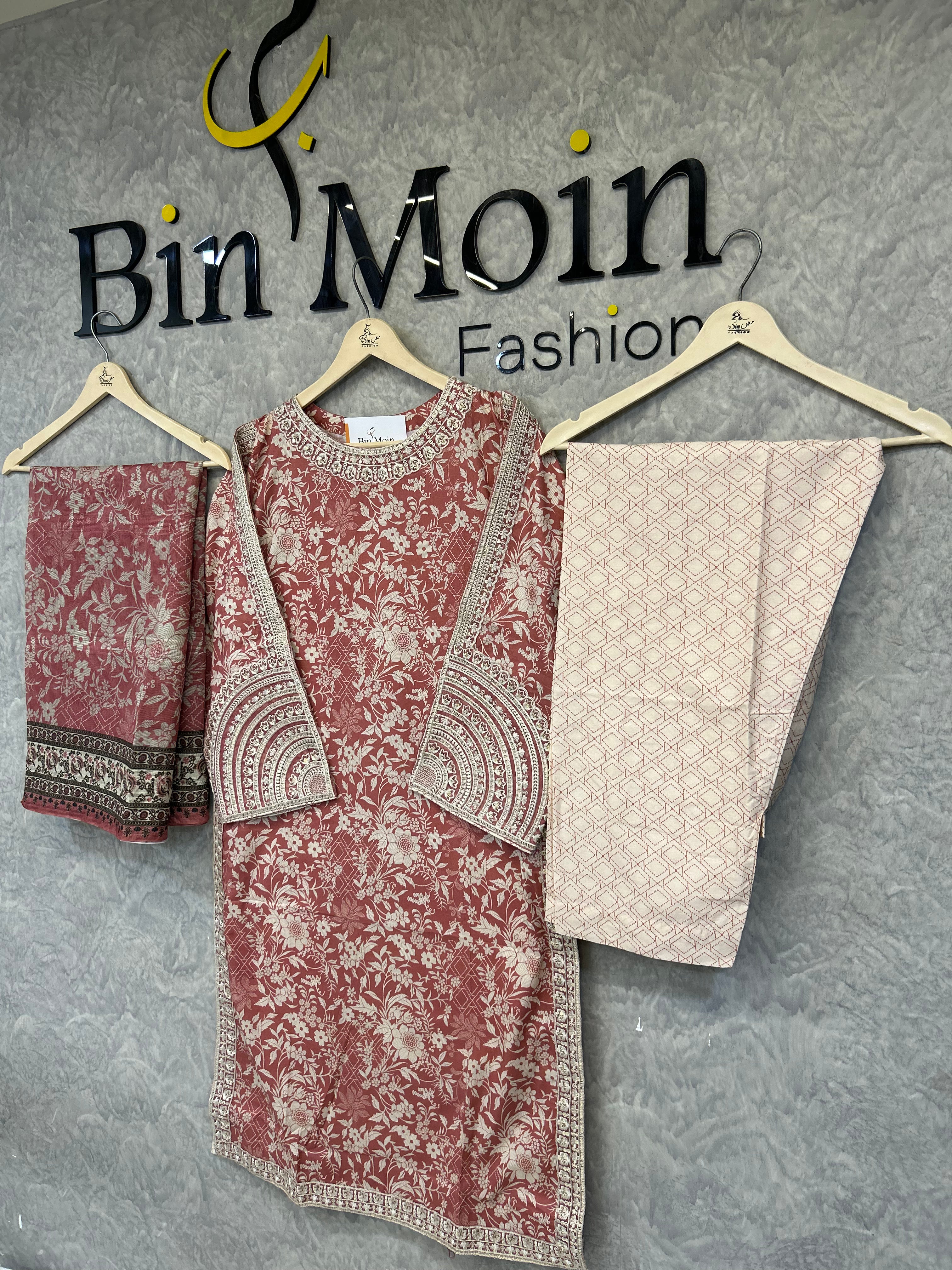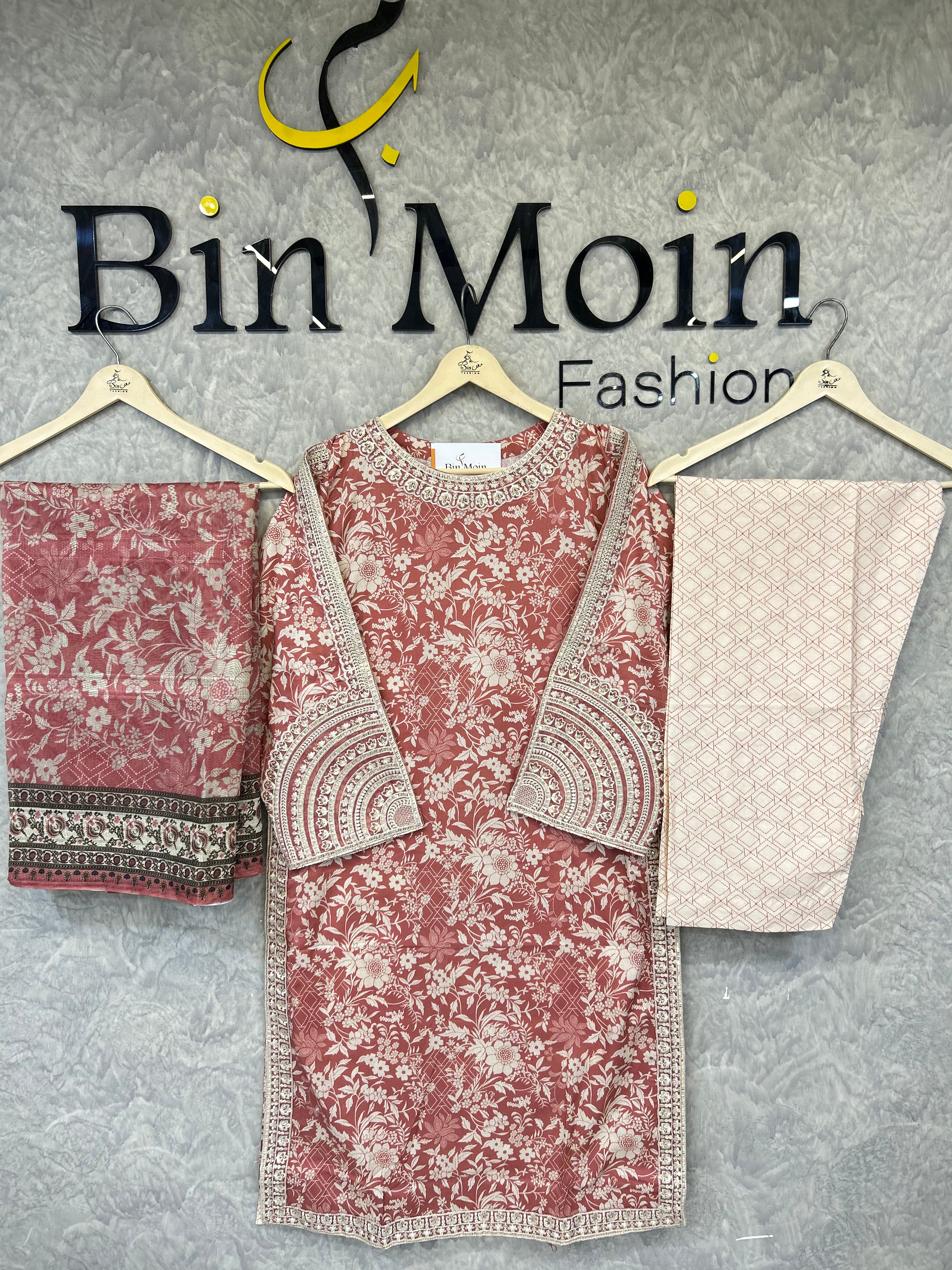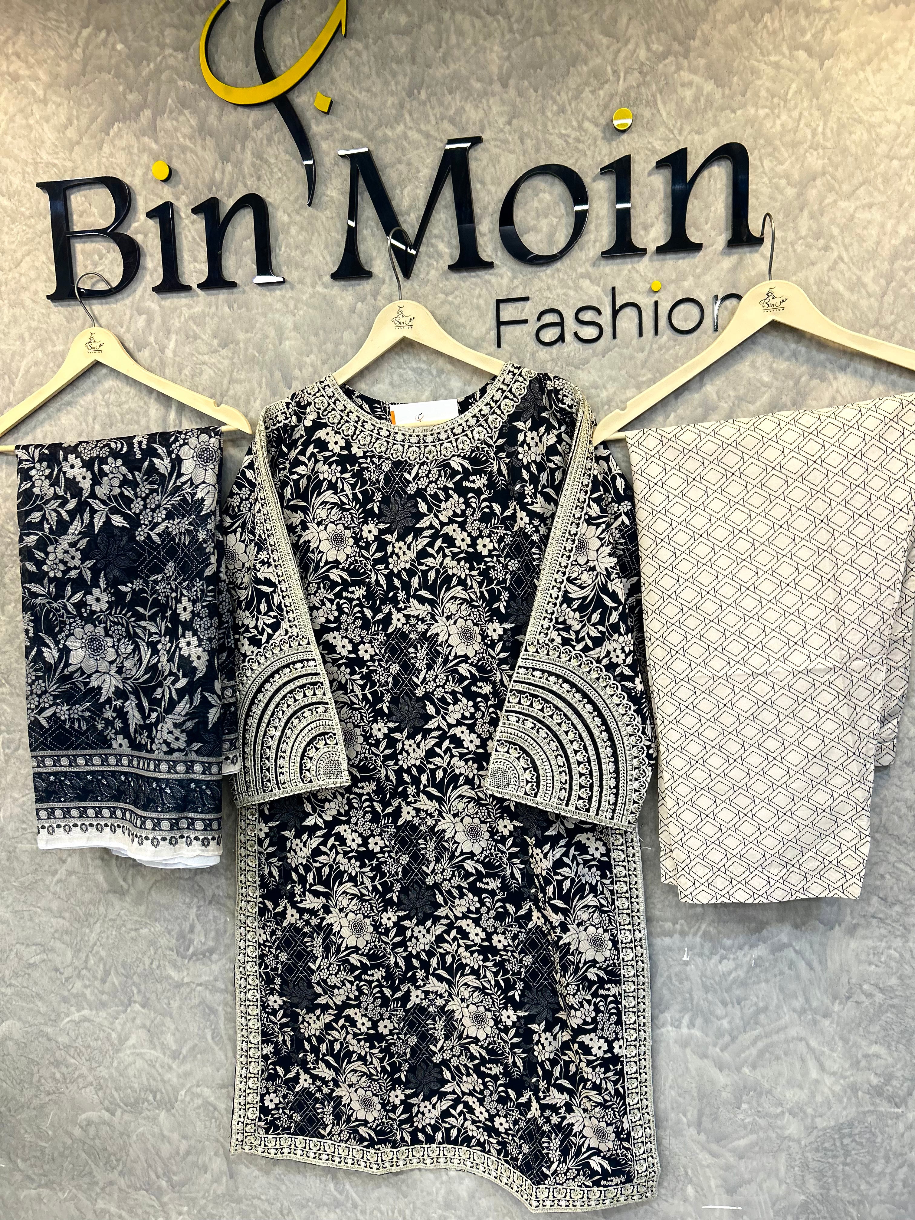 Embrace the allure of the night with the "Midnight Rose" ensemble. This sophisticated 3-piece suit is meticulously crafted from premium, breathable Lawn fabric, offering a perfect blend of airy comfort and high-end style. The charcoal-black base serves as a dramatic canvas for the intricate pink and white embroidered neckline, which is beautifully accented by traditional hanging tassels for a touch of movement and grace. Finished with delicate floral borders and paired with fully printed trousers, this outfit is designed for the woman who carries an air of timeless mystery and effortless sophistication.