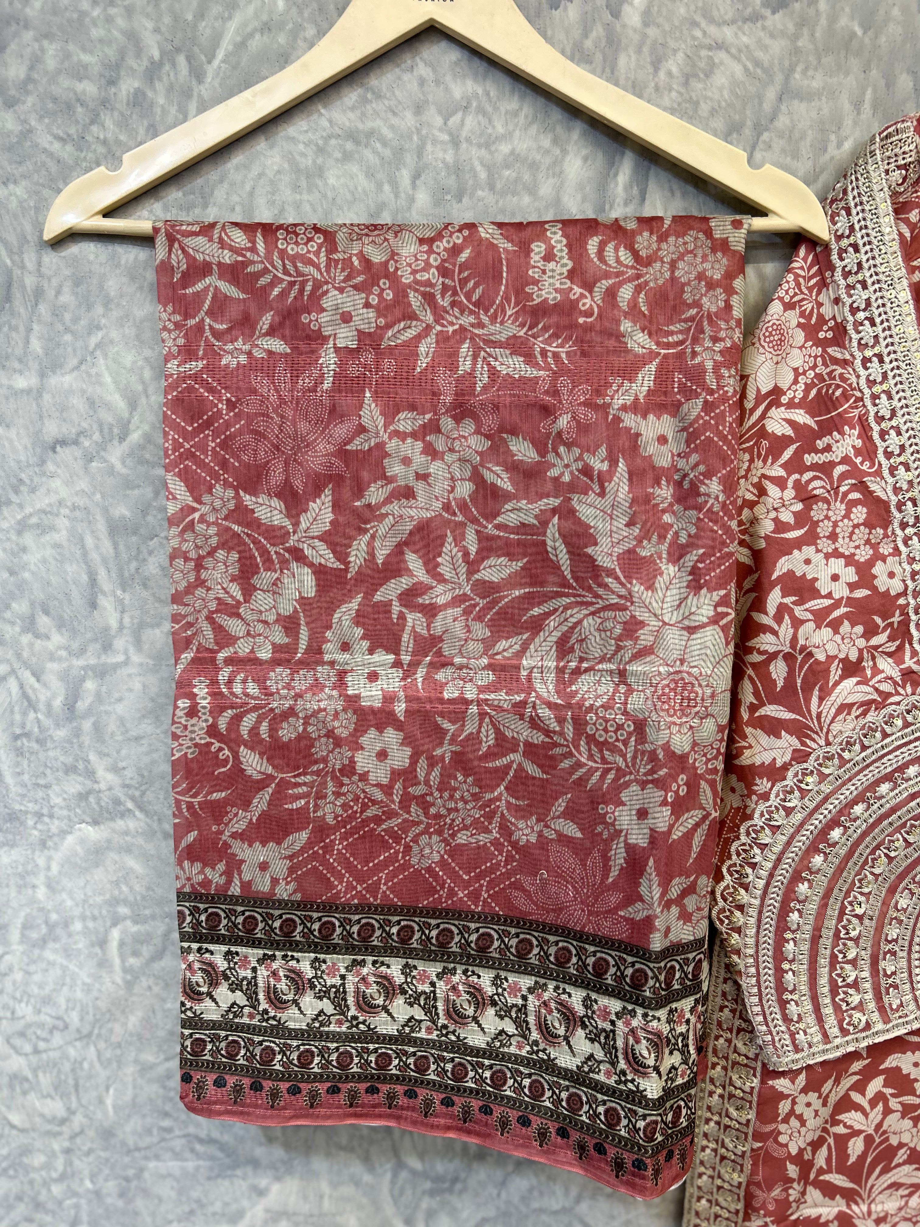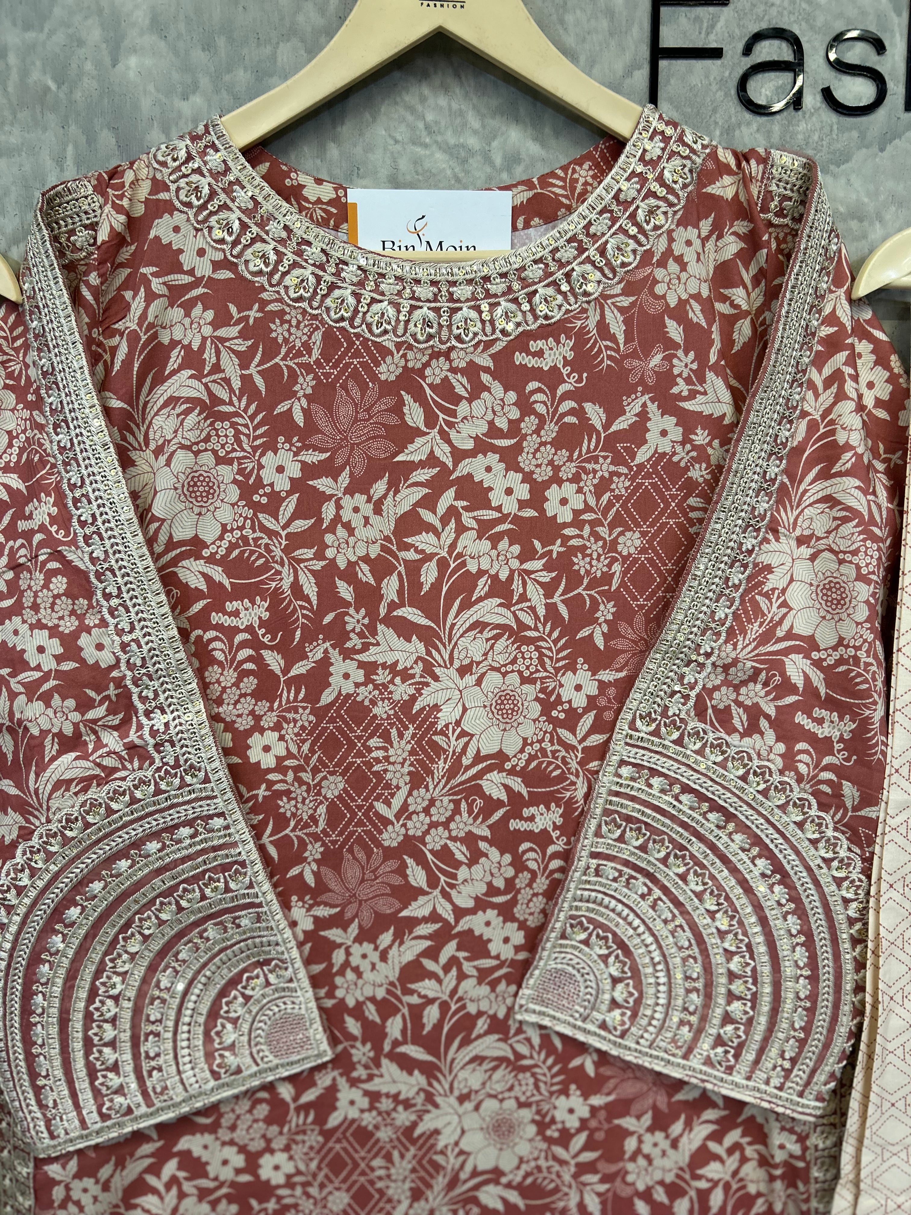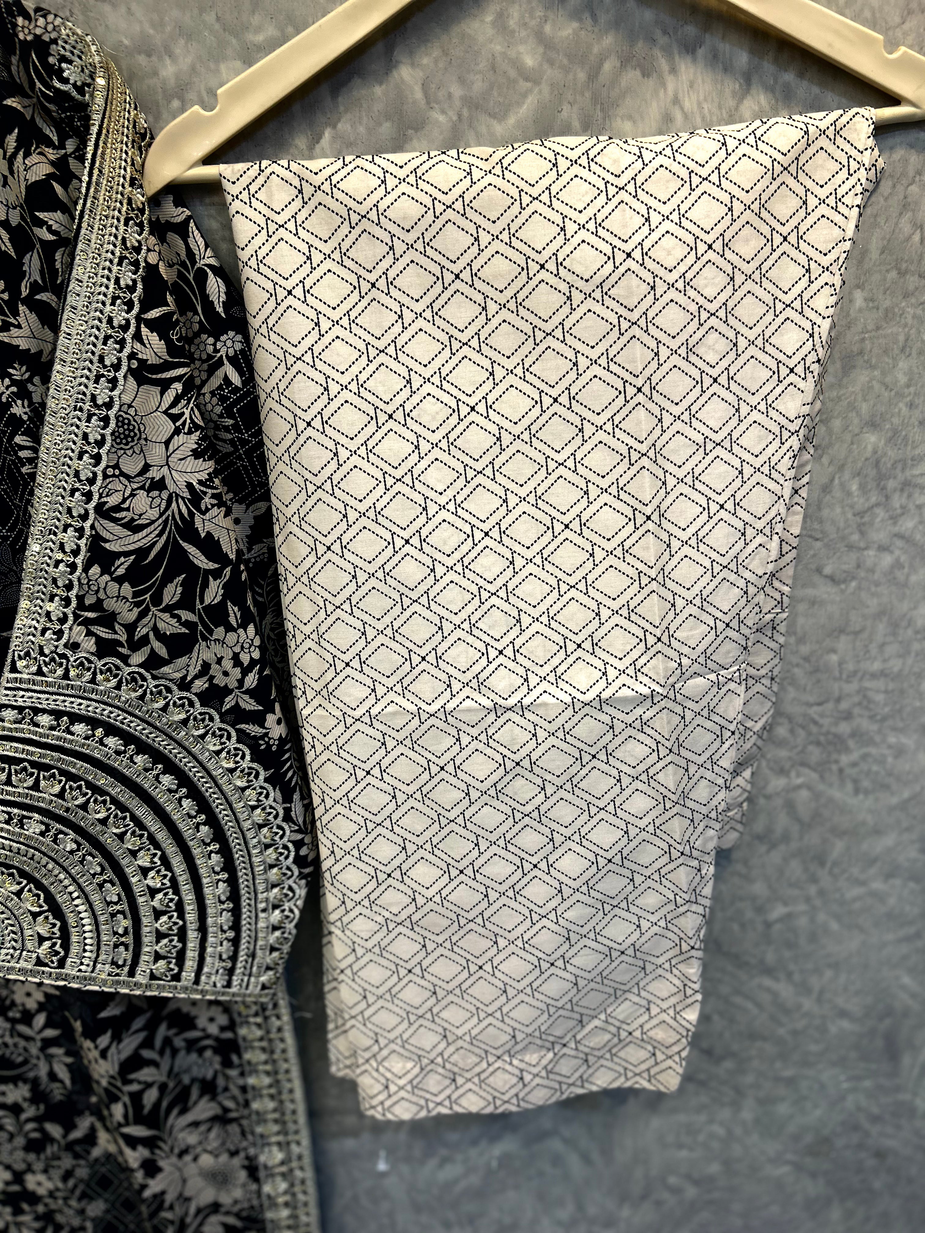 Embrace the allure of the night with the "Midnight Rose" ensemble. This sophisticated 3-piece suit is meticulously crafted from premium, breathable Lawn fabric, offering a perfect blend of airy comfort and high-end style. The charcoal-black base serves as a dramatic canvas for the intricate pink and white embroidered neckline, which is beautifully accented by traditional hanging tassels for a touch of movement and grace. Finished with delicate floral borders and paired with fully printed trousers, this outfit is designed for the woman who carries an air of timeless mystery and effortless sophistication.