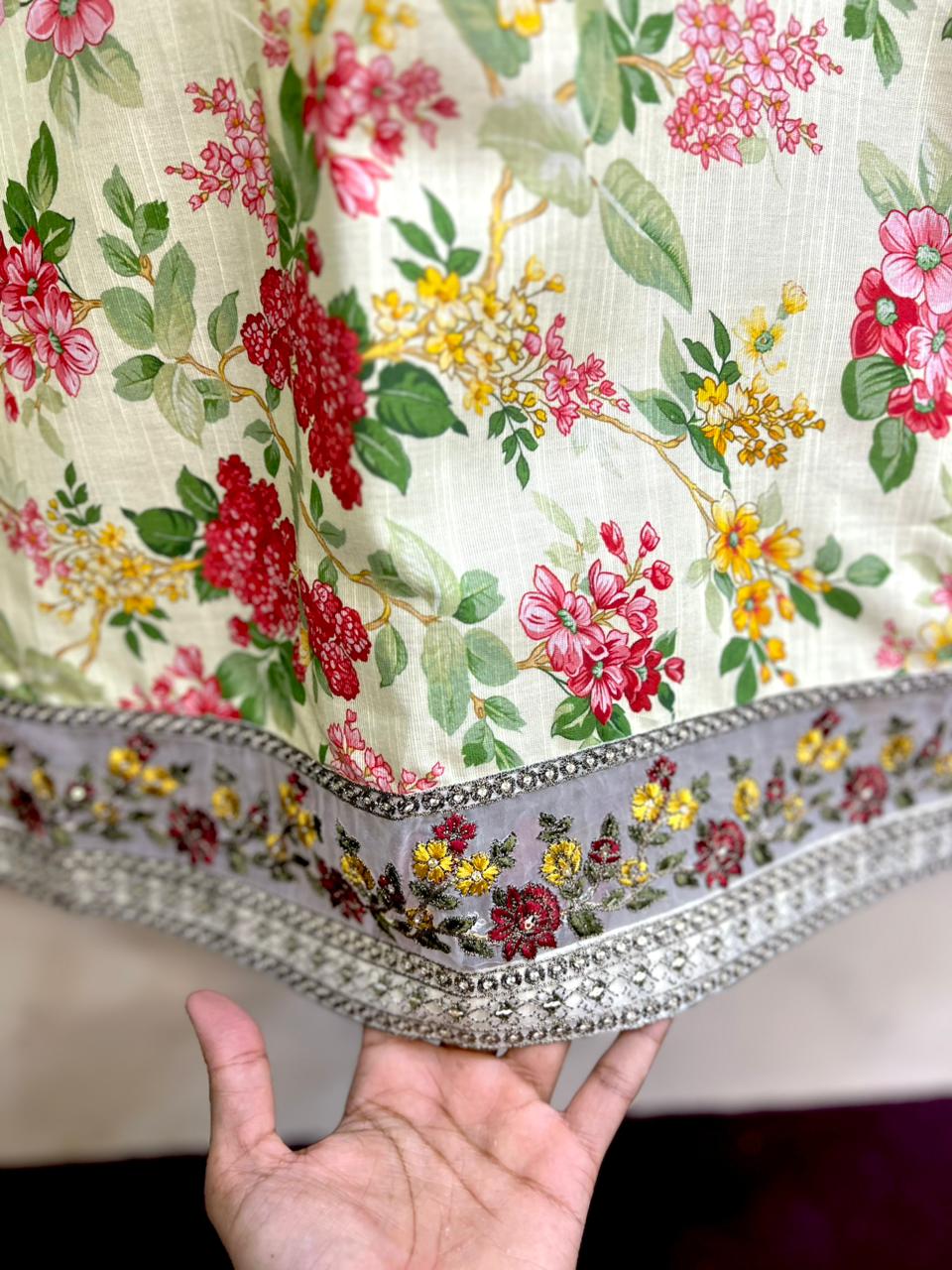 This stunning piece is crafted from breathable Khaddar Fabric, featuring a fresh off-white base vibrantly adorned with cheerful pink, yellow, and green floral prints.