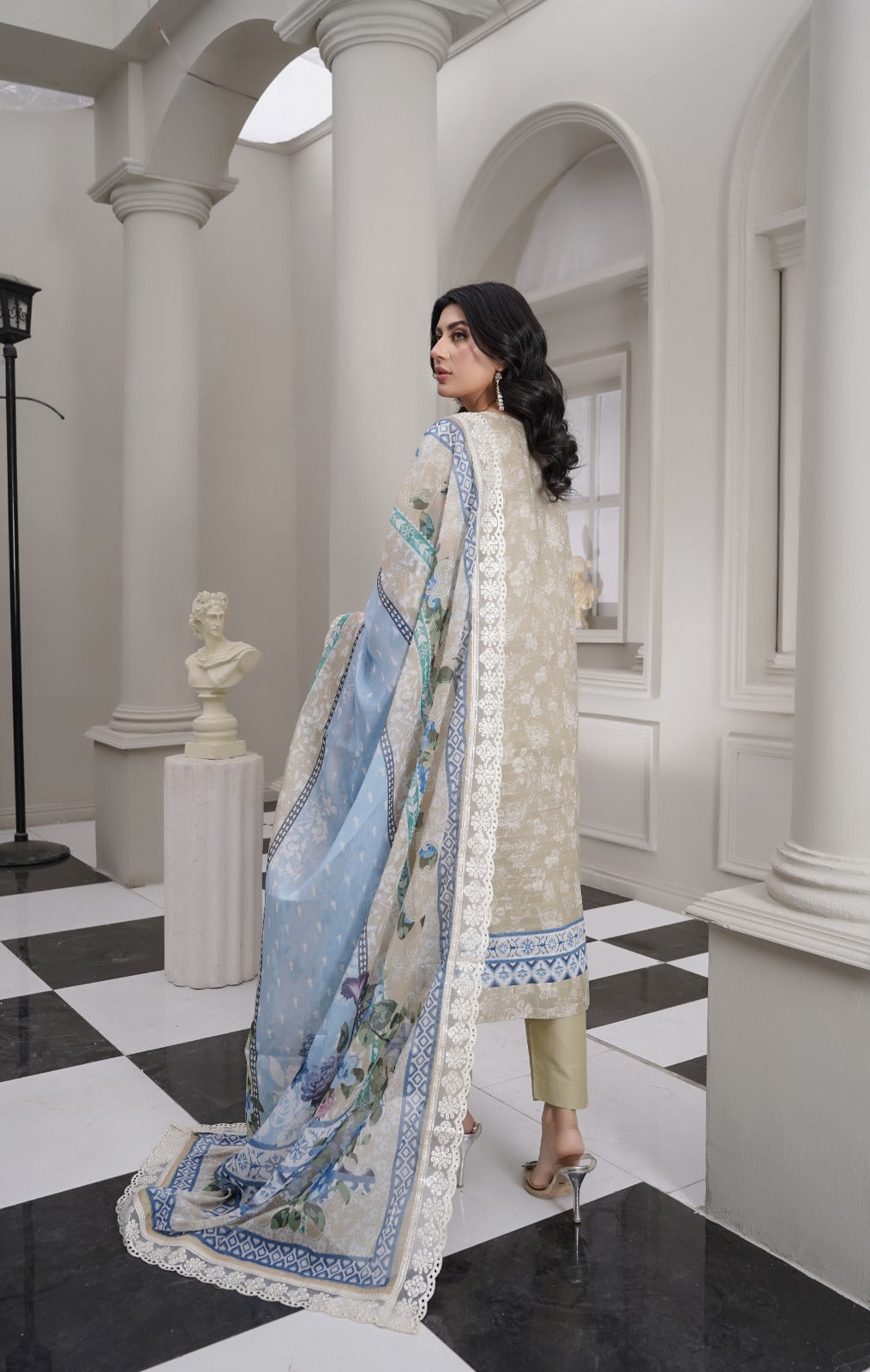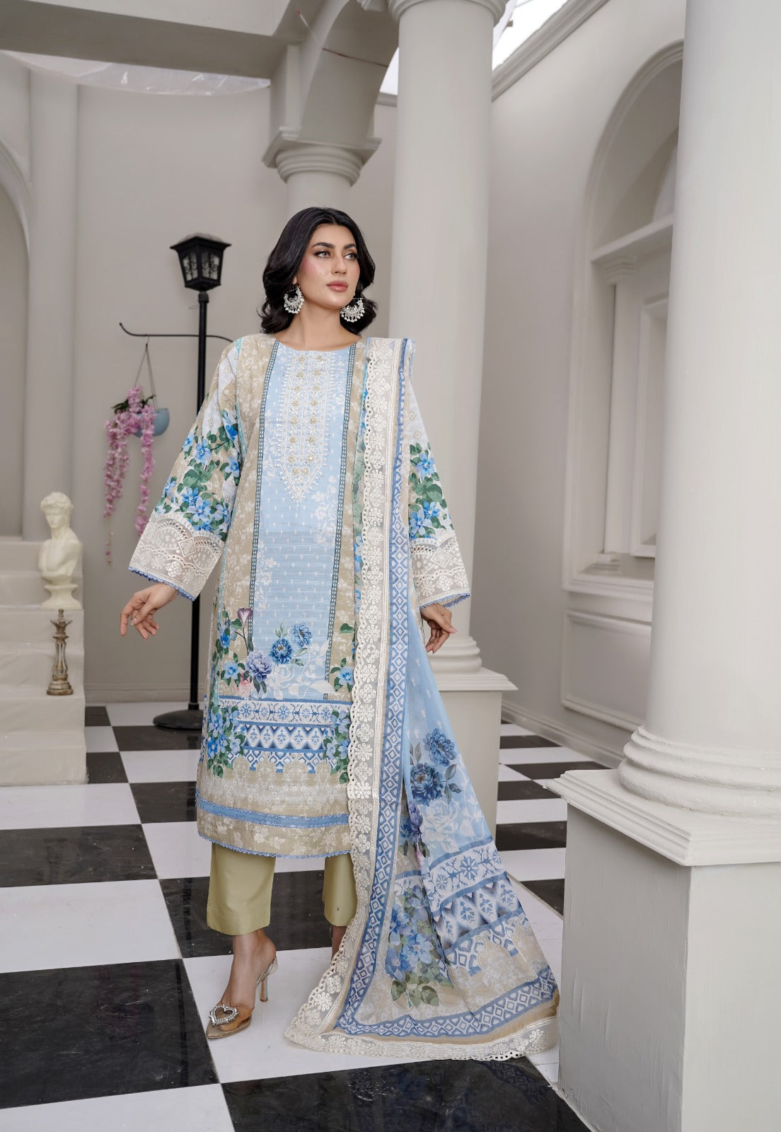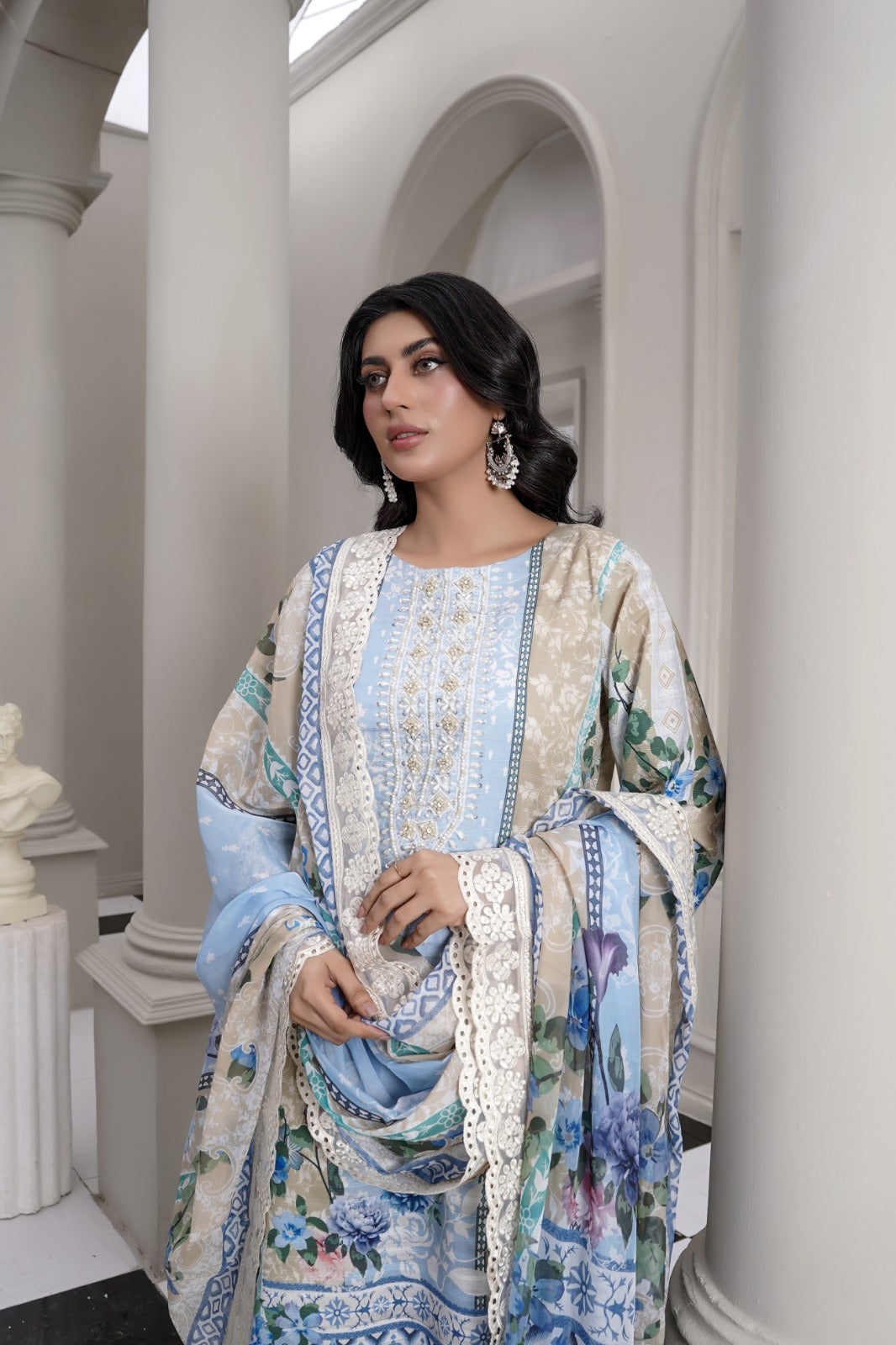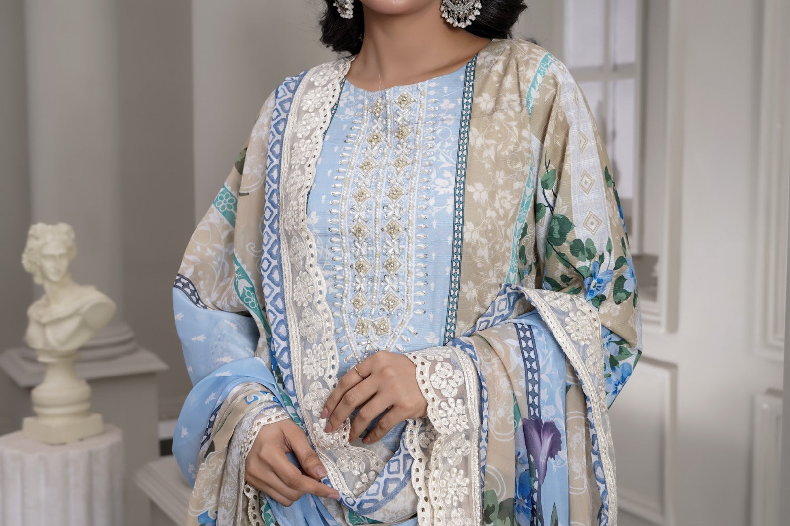 Elegant handwork lawn 3-piece suit featuring delicate embroidery on the neckline with beautifully printed lawn fabric. Paired with a matching lawn trouser and a soft printed dupatta, this outfit offers a graceful look—perfect for summer wear, festive gatherings, and daytime occasions.