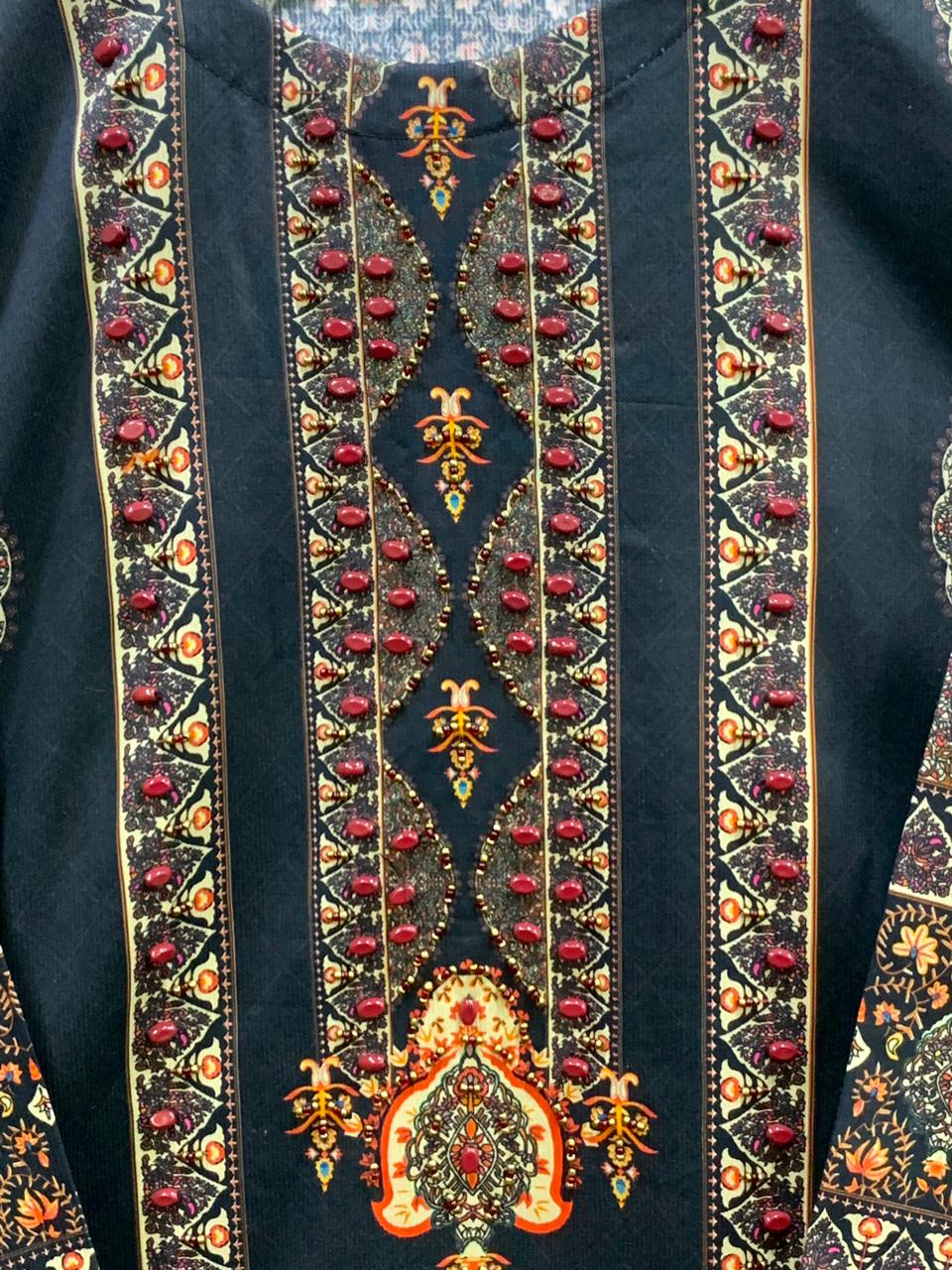 This stunning two-piece suit is crafted from premium Cotrai Cotton fabric, offering a breathable, comfortable texture that is ideal for all-day wear while maintaining its rich, detailed print.