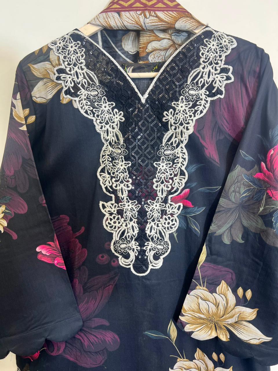 This bold black three-piece suit is crafted from premium Cotrai Cotton Fabric, showcasing large, vibrant floral prints in pink, white, and burgundy.