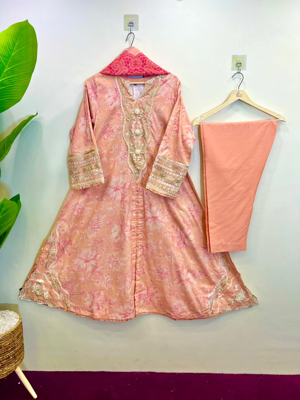 This soft peach/pink frock is crafted from premium Cotrai Cotton Fabric, featuring a subtle, all-over floral print for a delicate, feminine look.