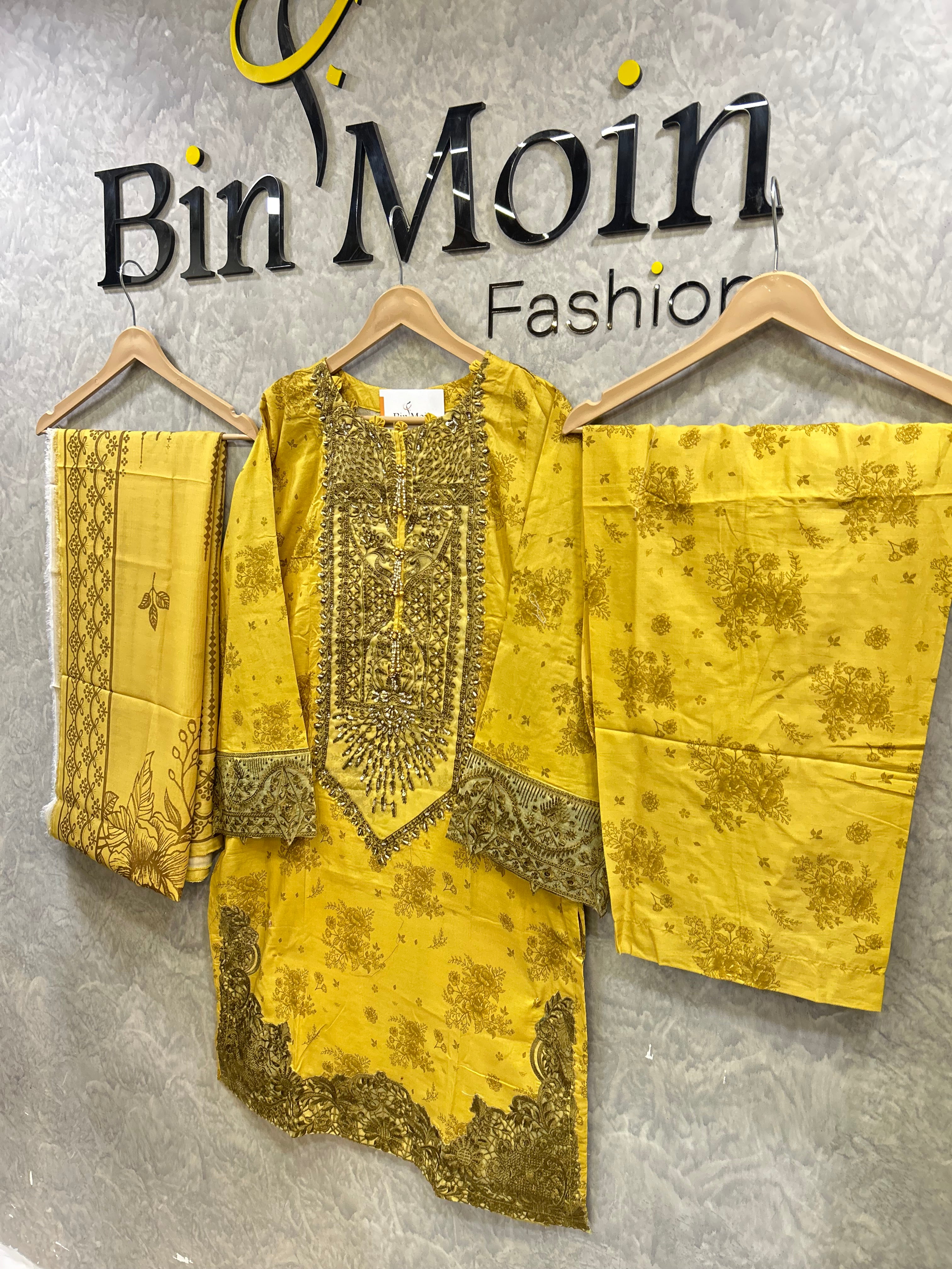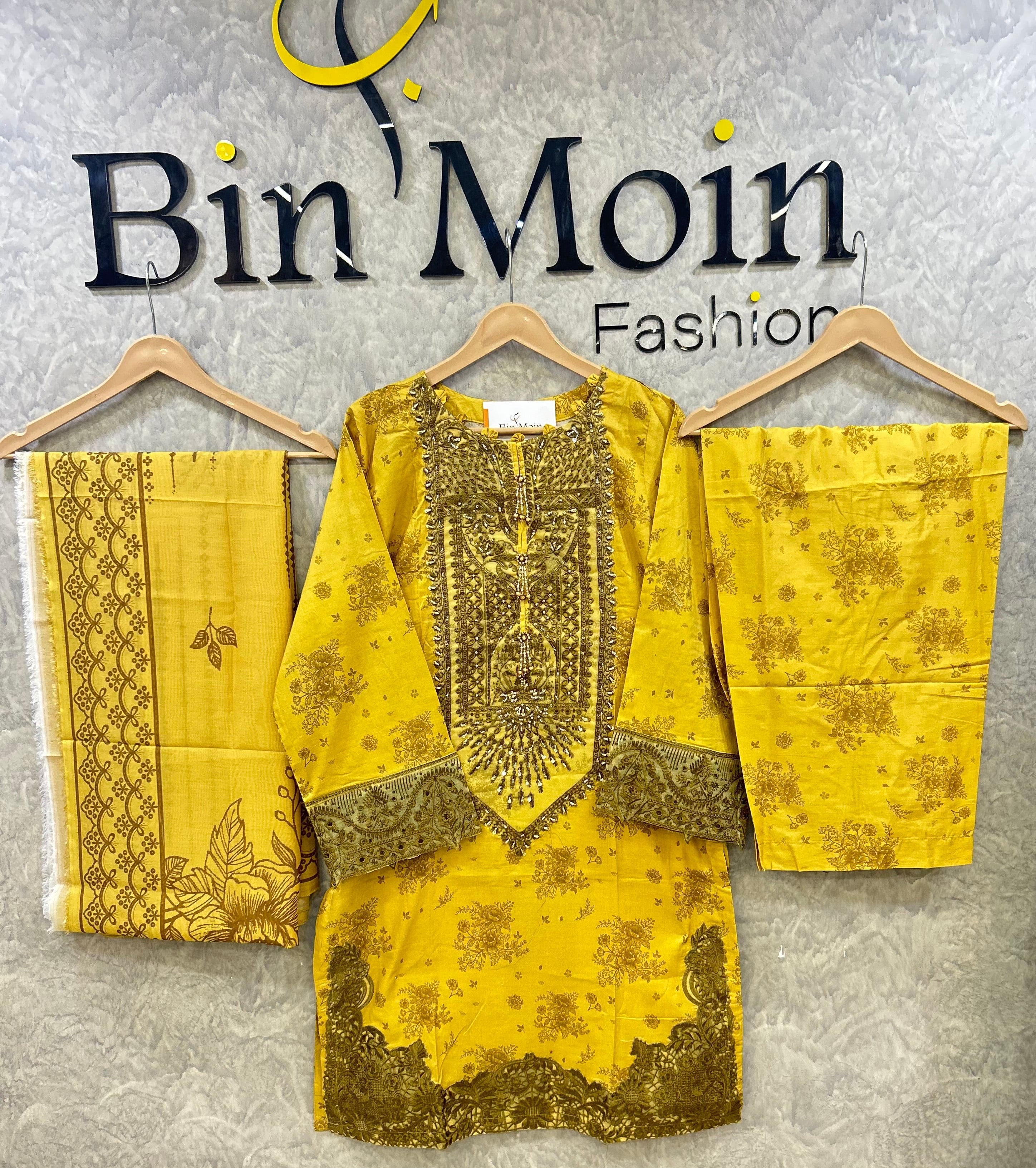 Elevate your festive and summer wardrobe with this luxury lawn 3-piece handwork suit, crafted in premium quality lawn fabric. The shirt features intricate hand embellishment on the neckline with delicate embroidery and fine detailing that adds a rich, elegant look. Beautifully printed lawn fabric with handwork highlights on sleeves and borders enhances its overall charm.
