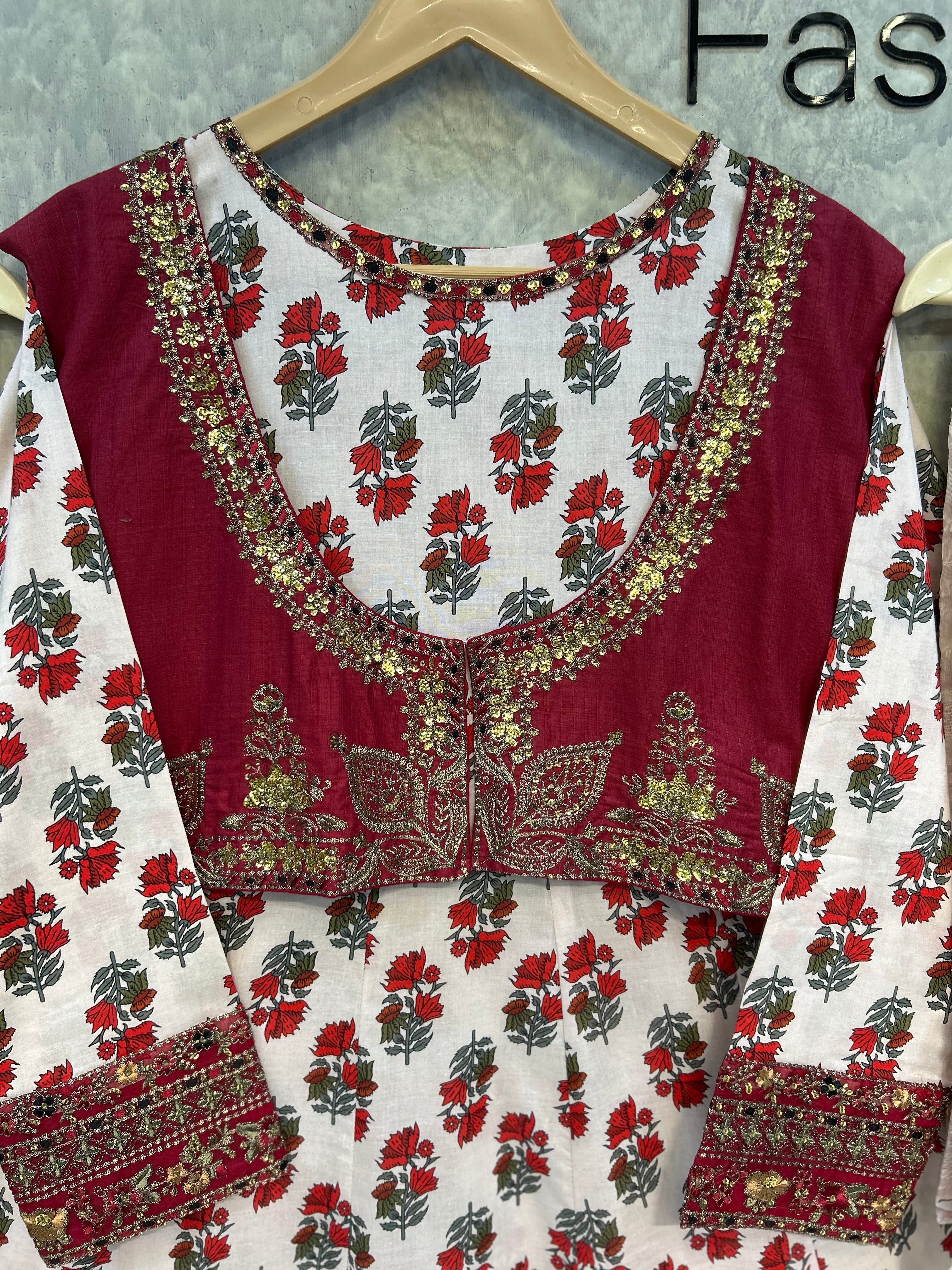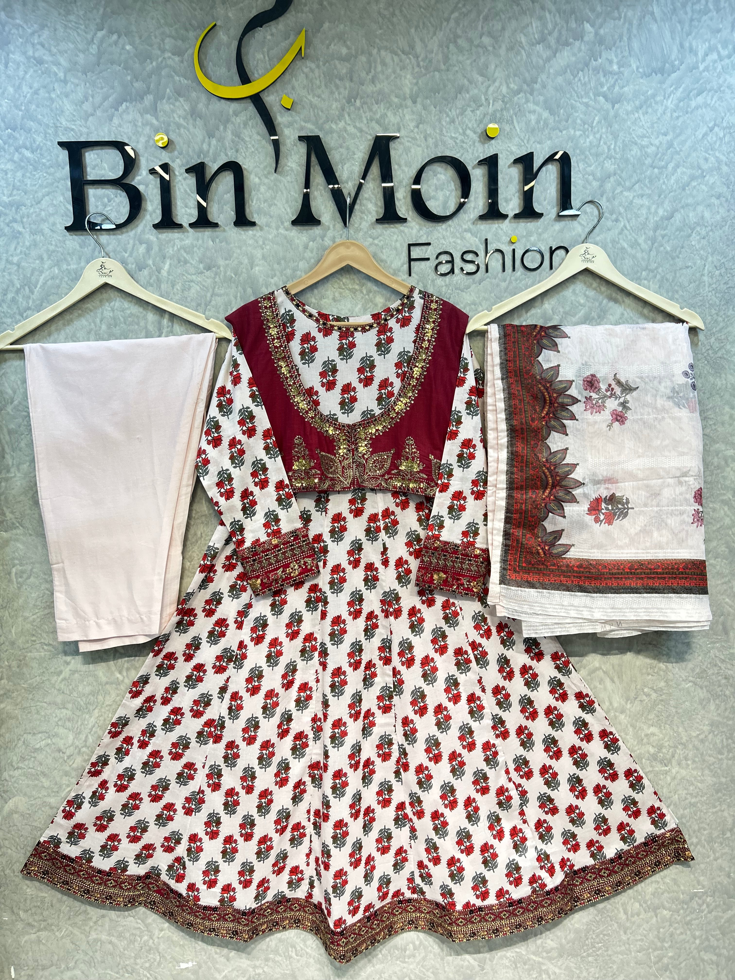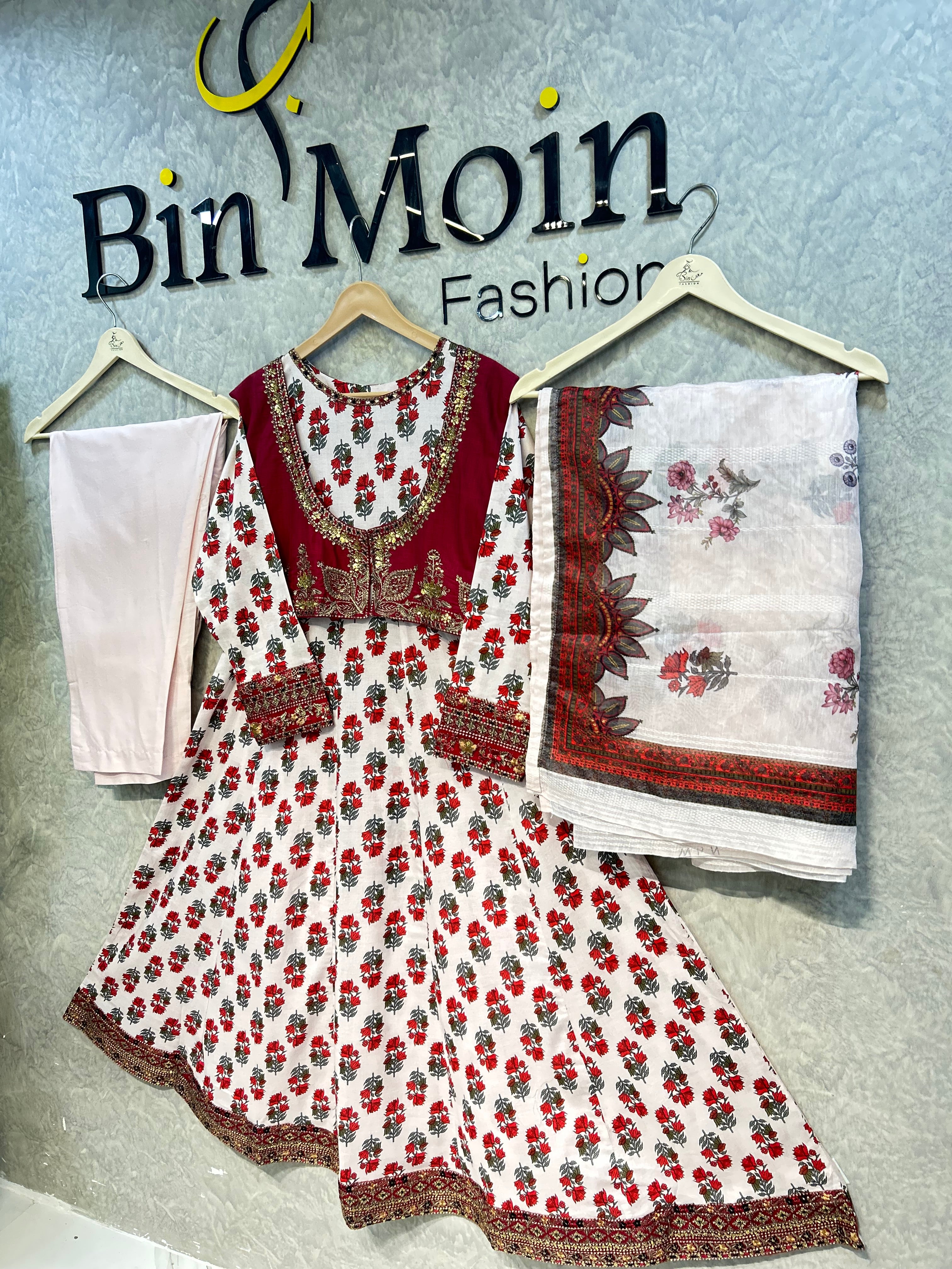 Celebrate Eid in style with this elegant 3 piece coti frock crafted from premium lawn fabric. Designed with beautiful embroidery and festive detailing, it includes a stylish frock, matching coti, and dupatta for a graceful traditional look. Perfect for Eid gatherings, parties, and summer festive wear.