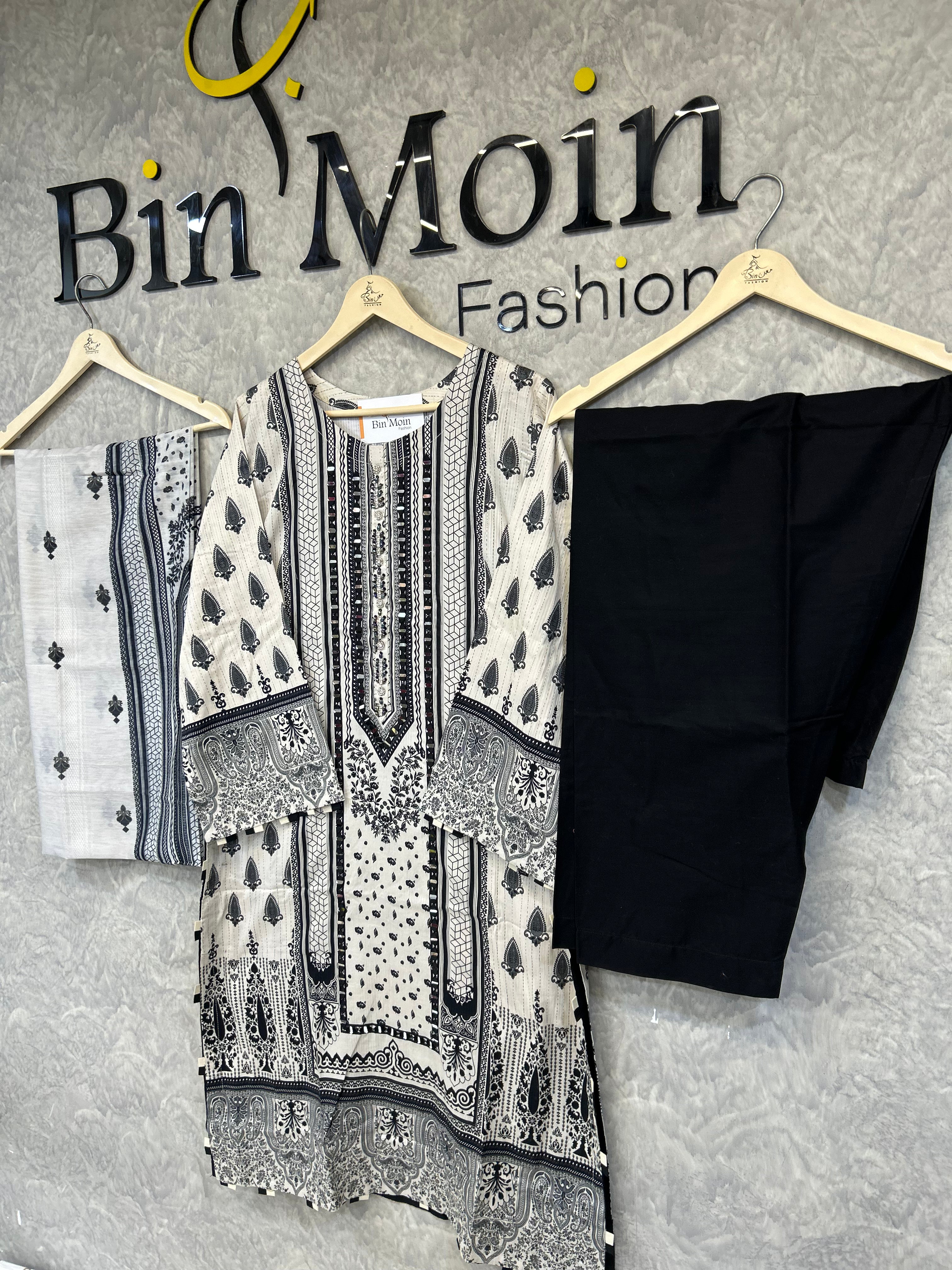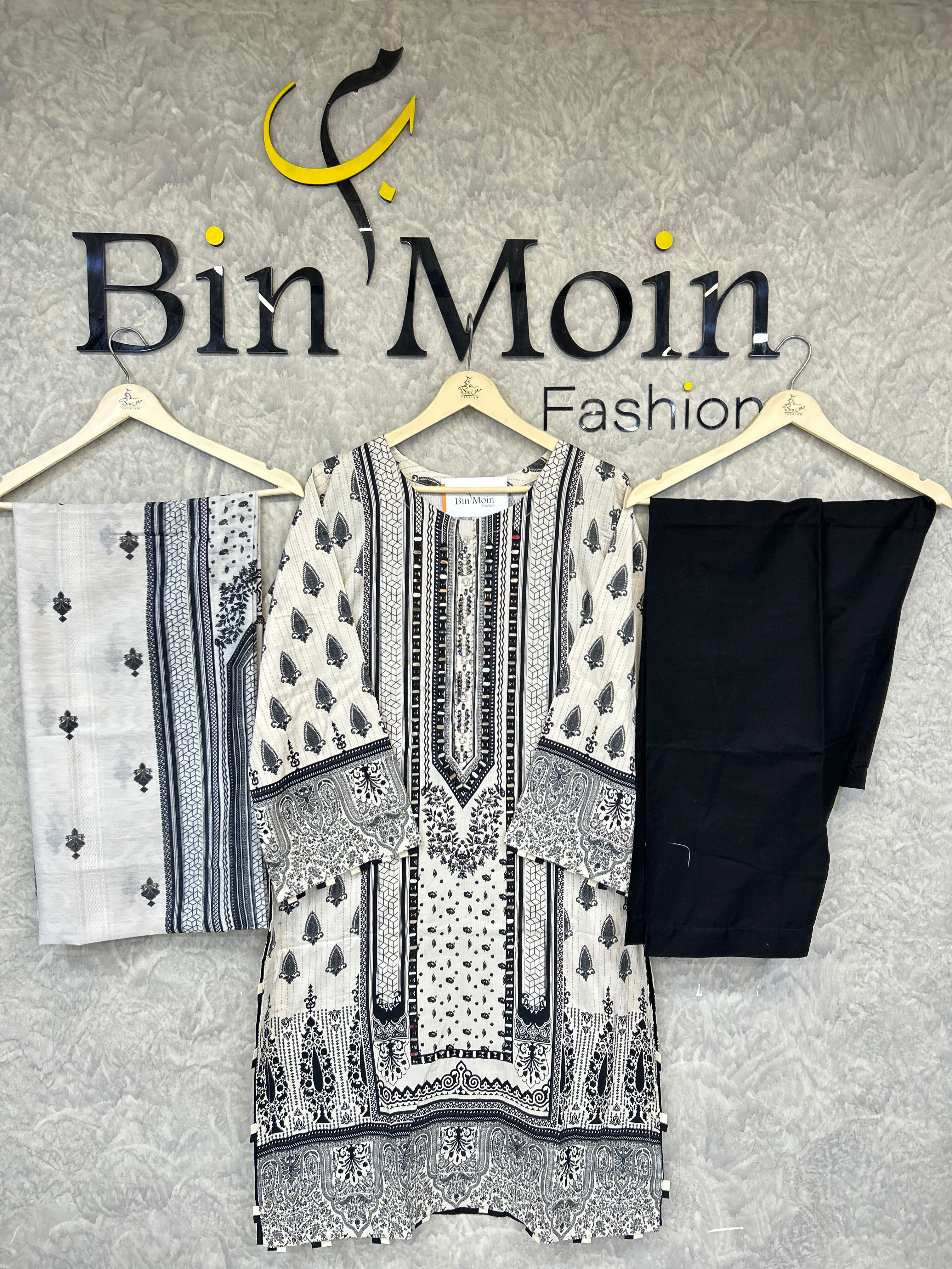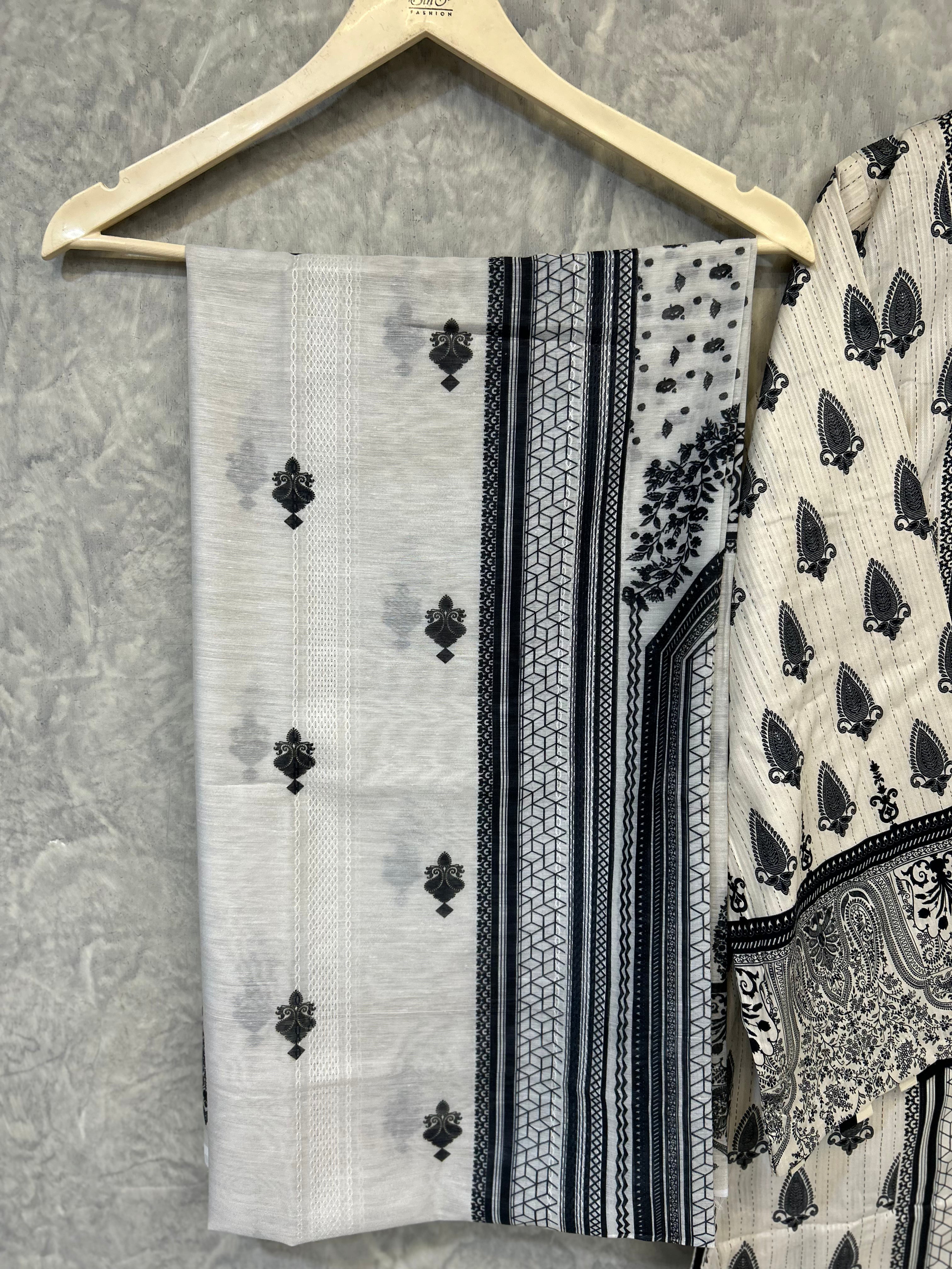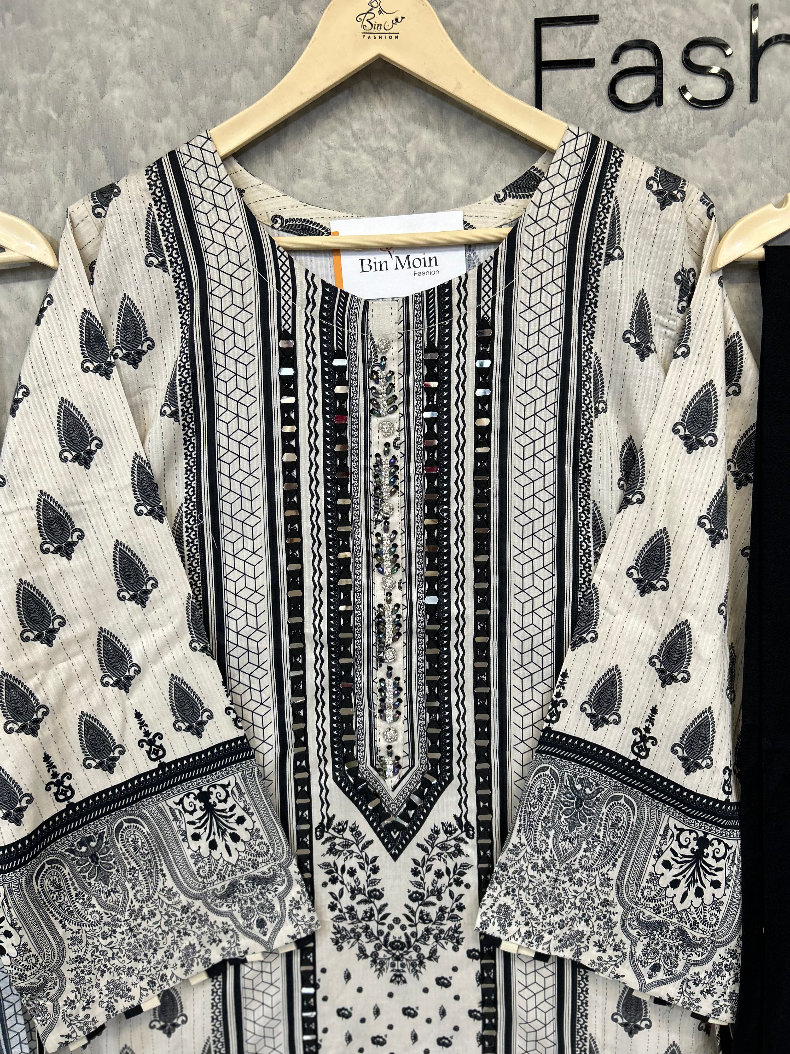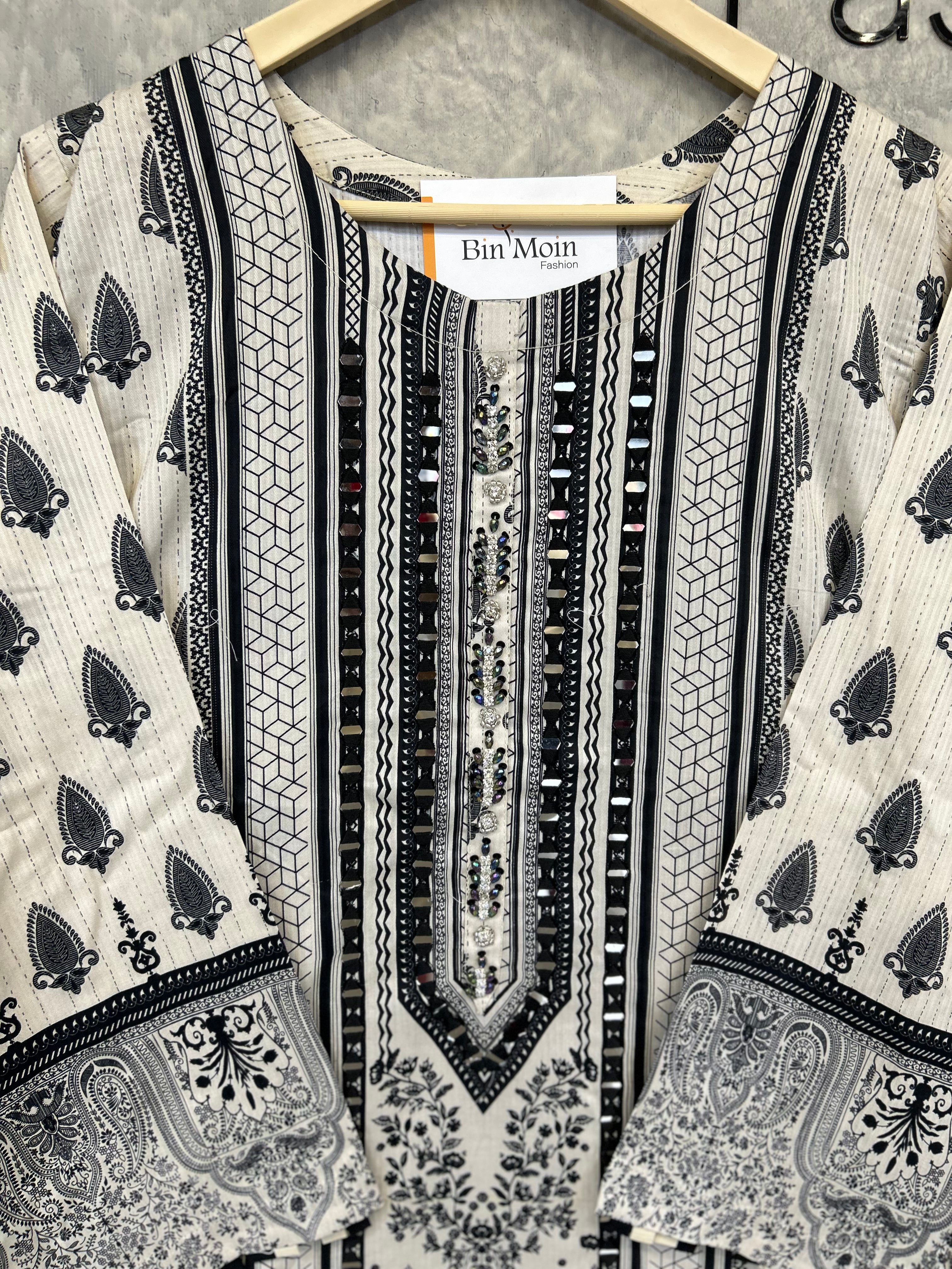 Elegant and timeless 3 piece mirror work lawn suit crafted from premium quality summer lawn fabric. Features a beautifully printed shirt with delicate mirror work detailing, paired with a comfortable plain lawn trouser and a graceful printed lawn dupatta. Perfect choice for casual wear, summer outings, and semi-formal gatherings.