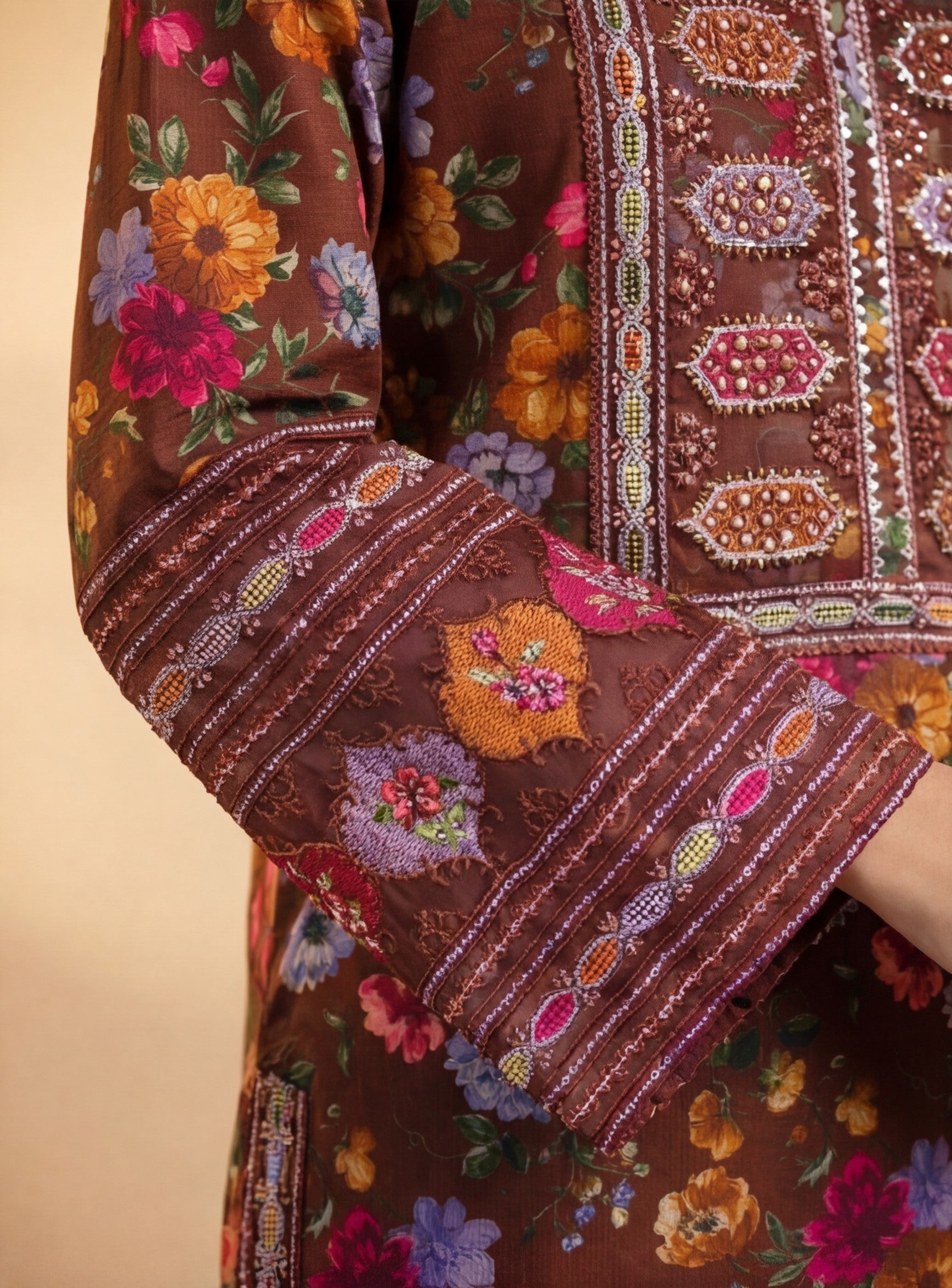 It features a rich Mocha Brown base, which is completely covered with a striking blend of colorful large-scale floral prints in hues of pink, blue, orange, and maroon, creating a vibrant focal point.
