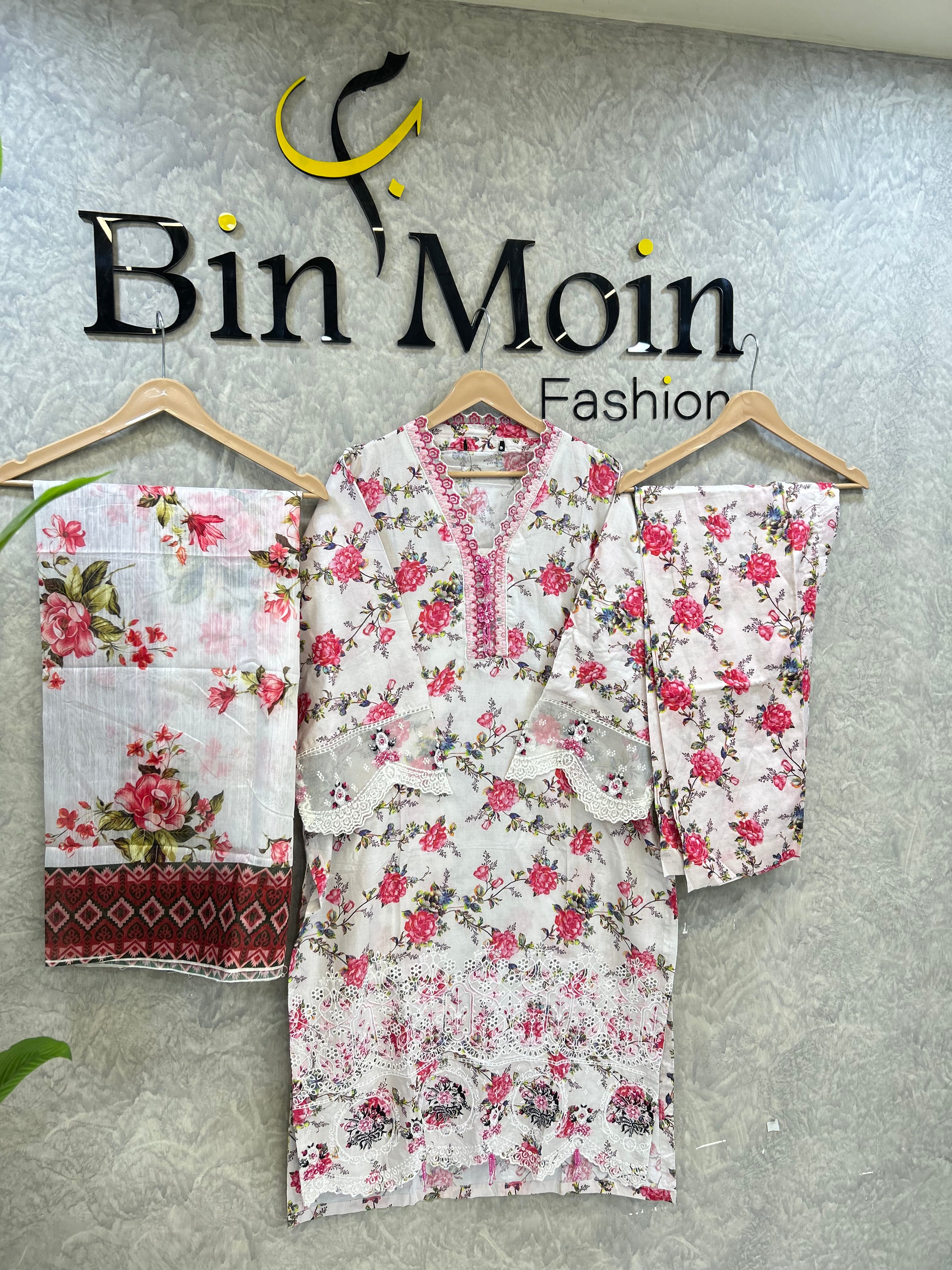 Step into a world of timeless charm with this breathtaking 3-piece floral ensemble. The shirt is beautifully adorned with a delicate pink rose print on a crisp white base, elevated by an exquisite pink embroidered V-neckline. Adding to its luxury are the sheer organza sleeve inserts and a heavy white lace border at the hem, which provide a modern, feminine touch to the traditional silhouette. Completed with a matching printed dupatta featuring a rich crimson border and coordinated floral trousers, this outfit is a refreshing choice for daytime festivities, spring gatherings, or elegant casual wear.