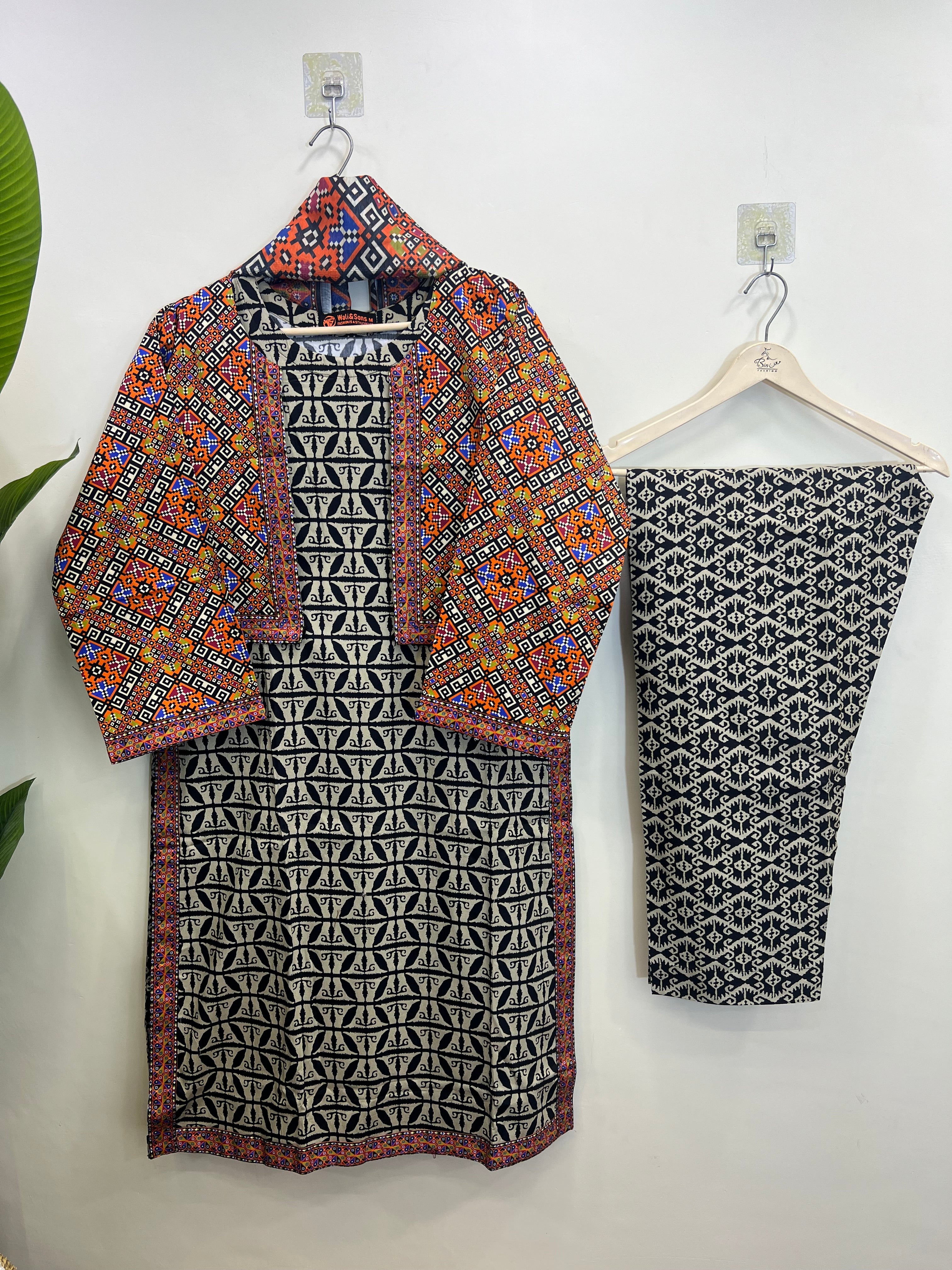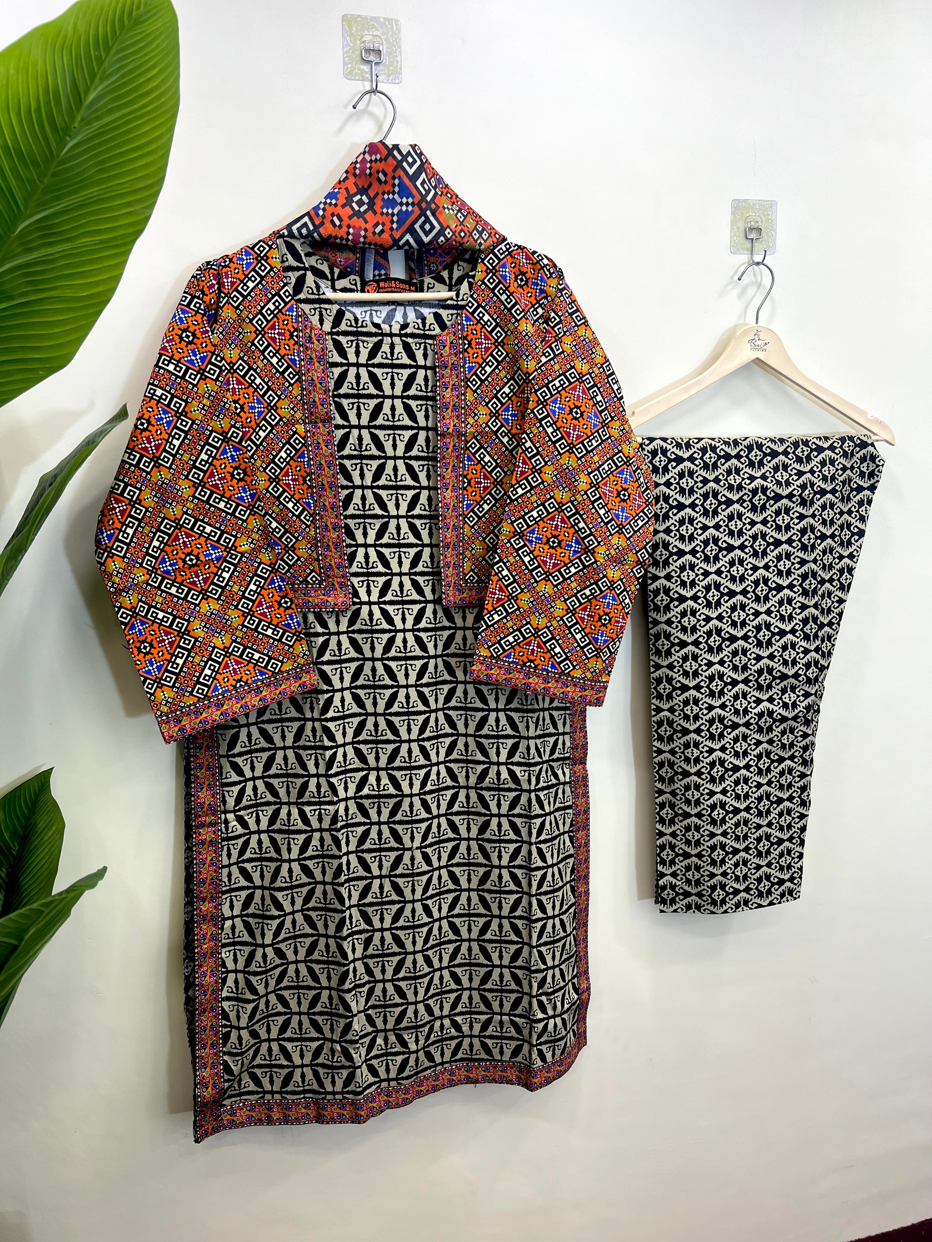 Step out in style with this vibrant Geometric Print Korraye Cotton 3-Piece Suit Fabric. Featuring a striking combination of traditional and tribal motifs in bold colours, this outfit is designed for comfort and maximum impact. It's the perfect statement piece for everyday elegance or festive gatherings.