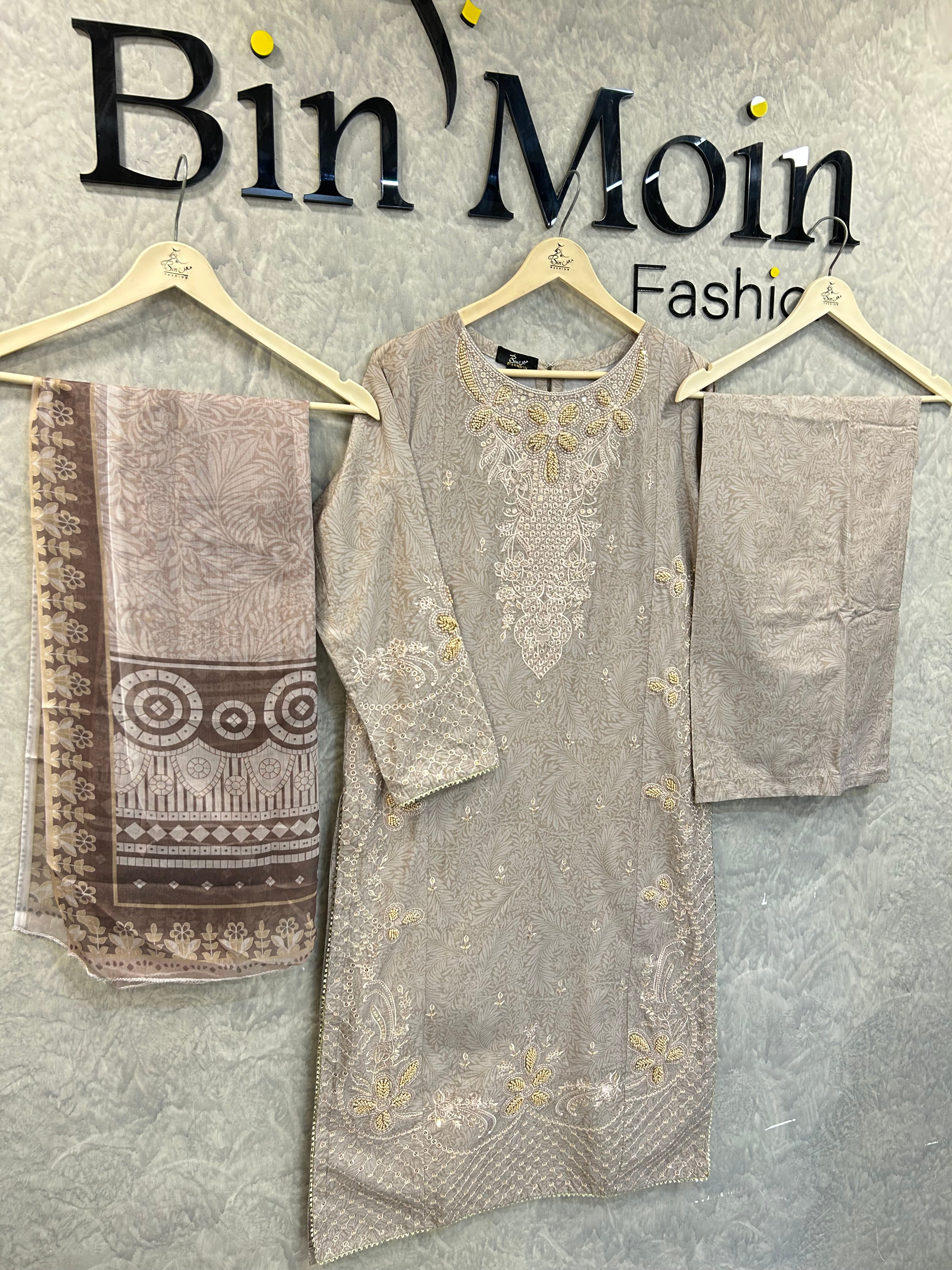Experience the height of luxury with the "Golden Sand" ensemble from Bin Moin Fashion. This sophisticated 3-piece suite is a masterclass in understated elegance, featuring a soft, sandy-beige Lawn fabric that provides a serene and breathable base for all-day comfort. The shirt is the centerpiece of the collection, boasting heavy tone-on-tone embroidery enriched with delicate golden thread work across the entire front and sleeves. The neckline is particularly ornate, featuring shimmering gold accents that eliminate the need for heavy jewelry. Paired with a beautifully printed dupatta in earthy brown and taupe tones and matching neutral trousers, this outfit is the perfect choice for festive gatherings or formal summer events where you want to radiate a refined, sun-kissed glow.