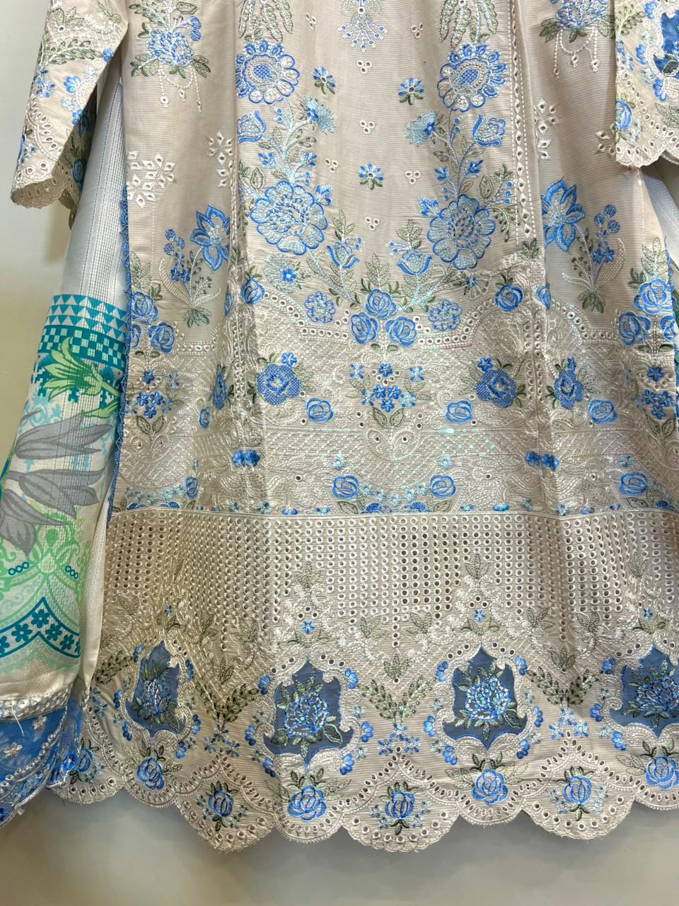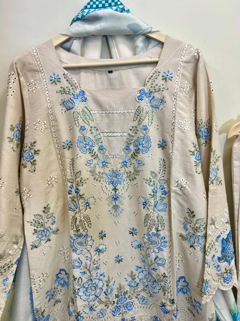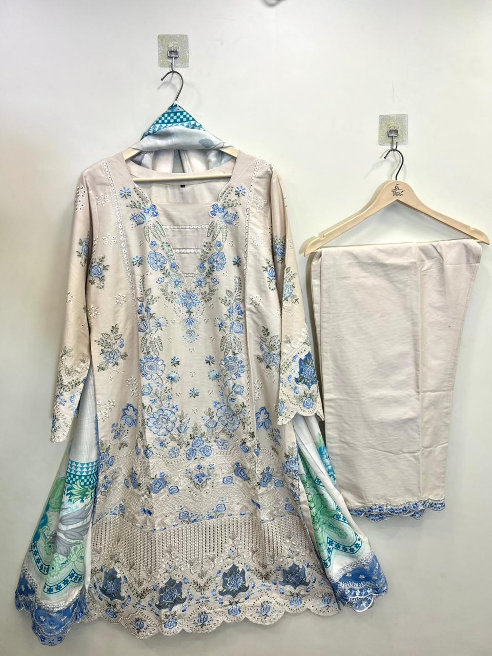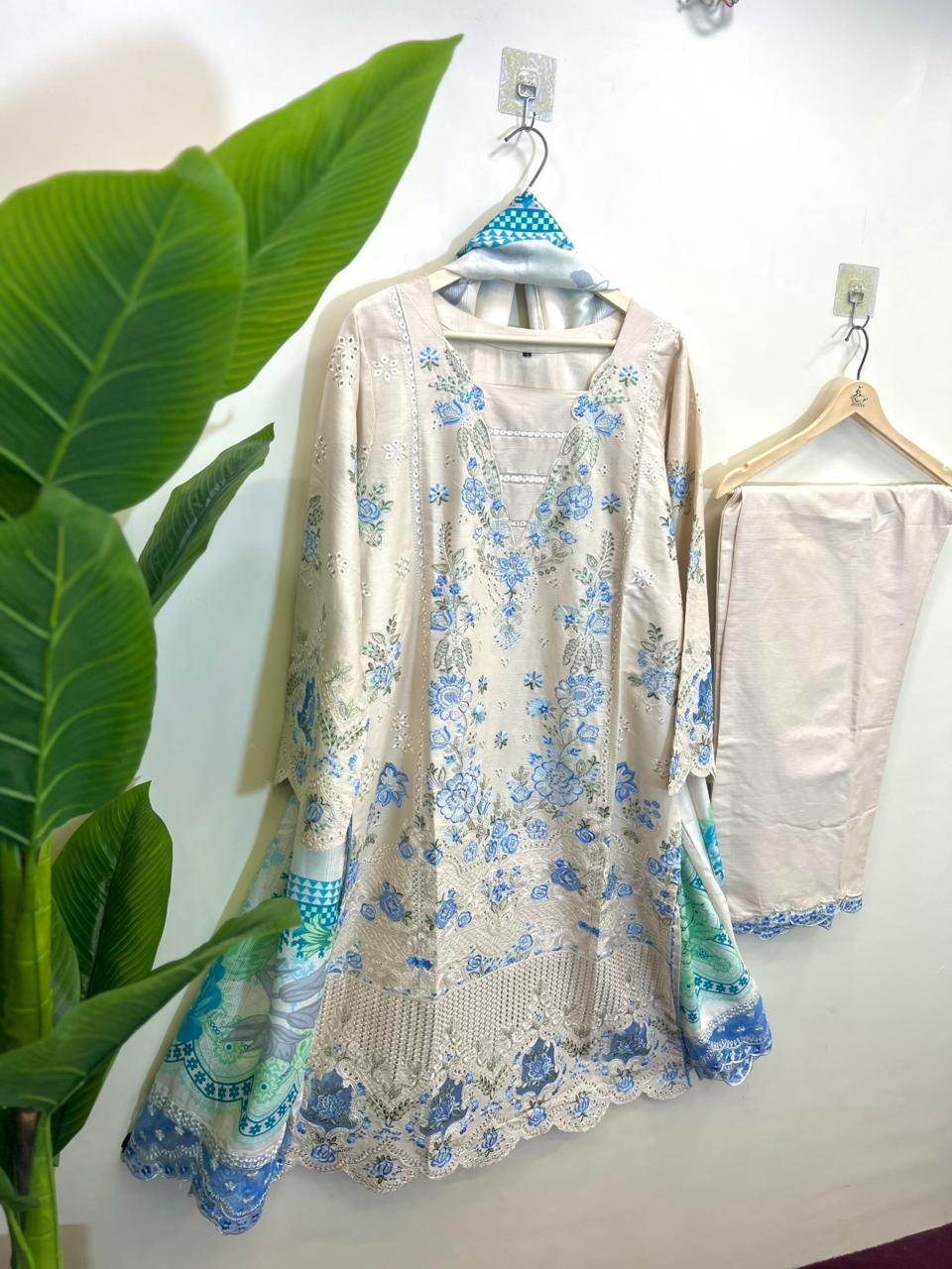 This elegant three-piece suit is crafted from premium Cotton Jacquard Fabric, featuring a light beige shirt adorned with intricate cutwork embroidery.