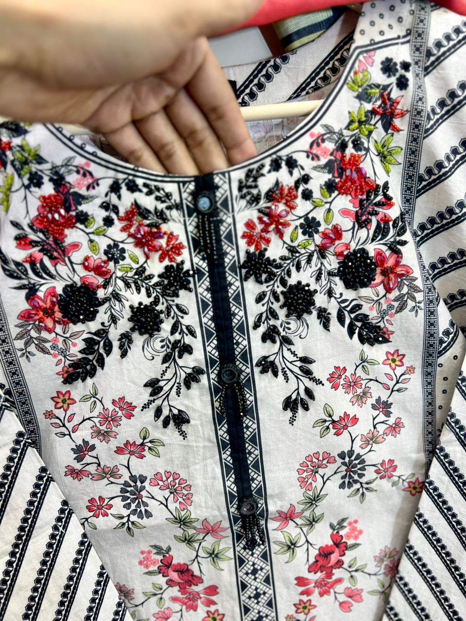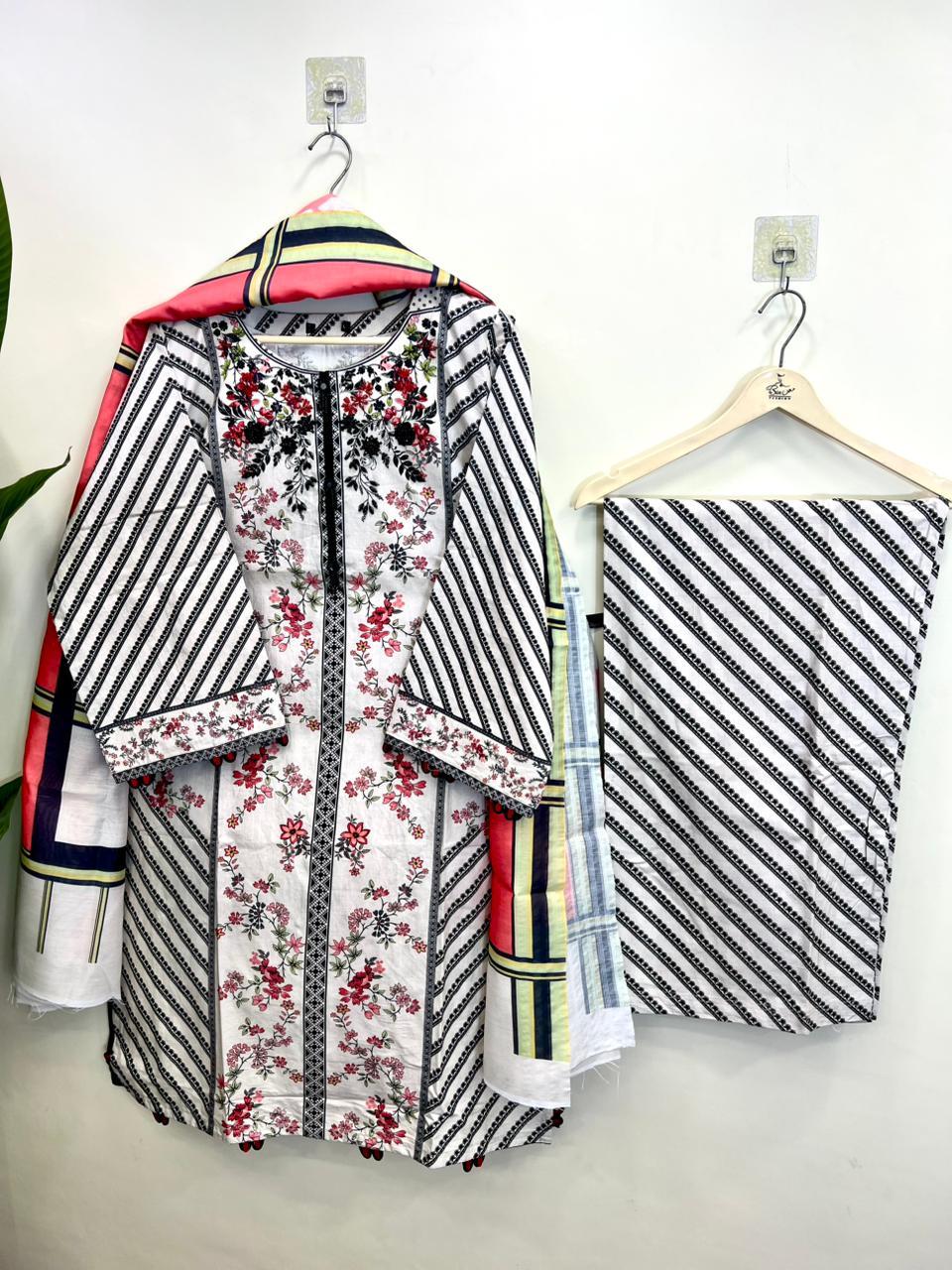 This stunning white suit is crafted from premium cotton fabric, featuring a bold mix of vertical stripes and floral prints.