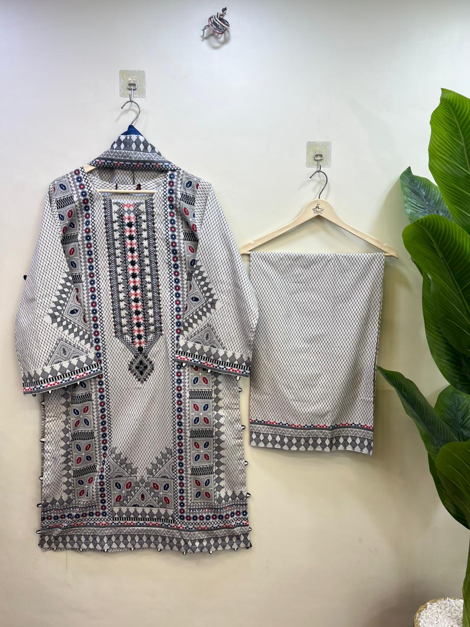 This stylish two-piece suit features a clean white and grey base adorned with intricate tribal/geometric prints.