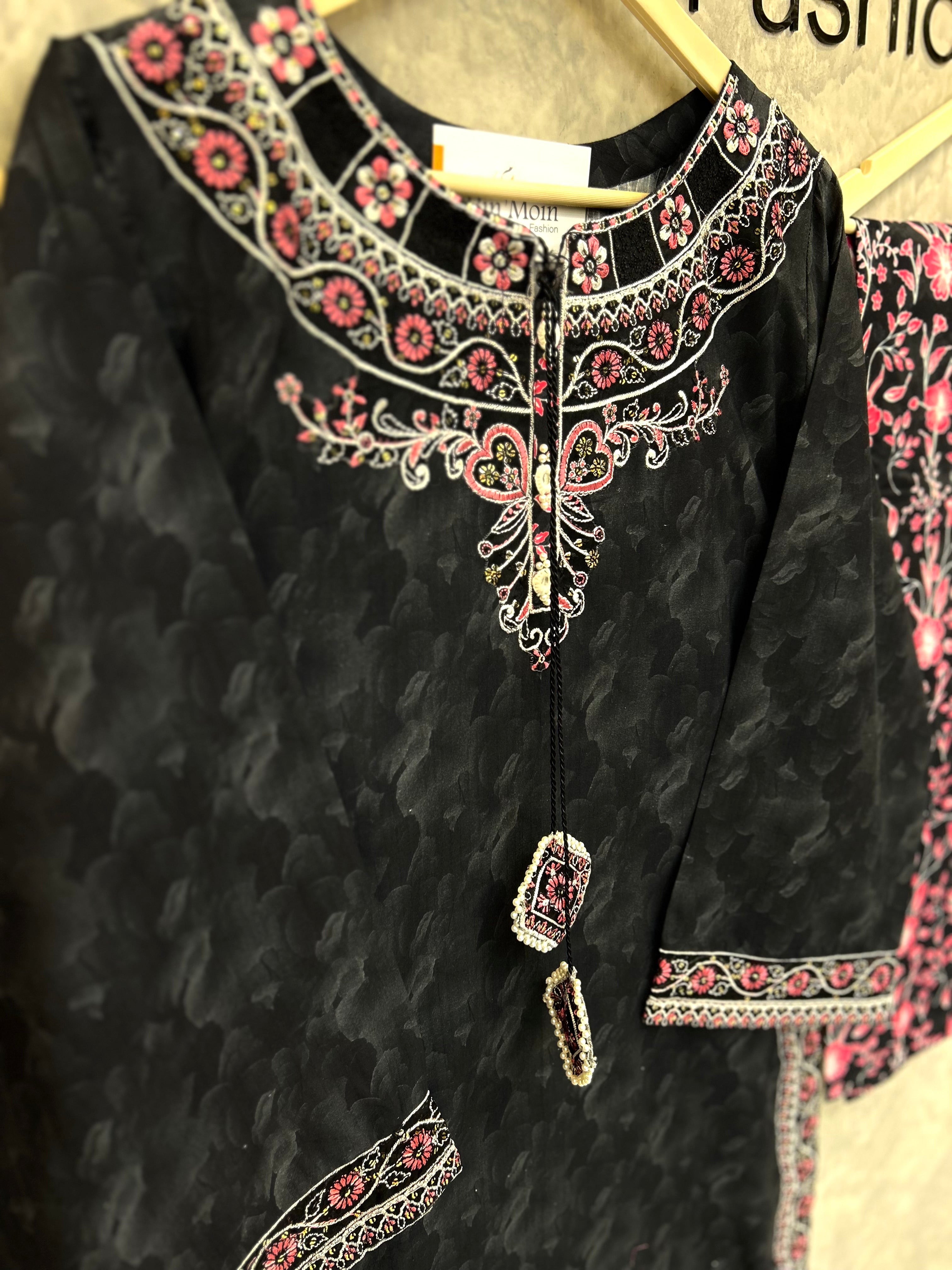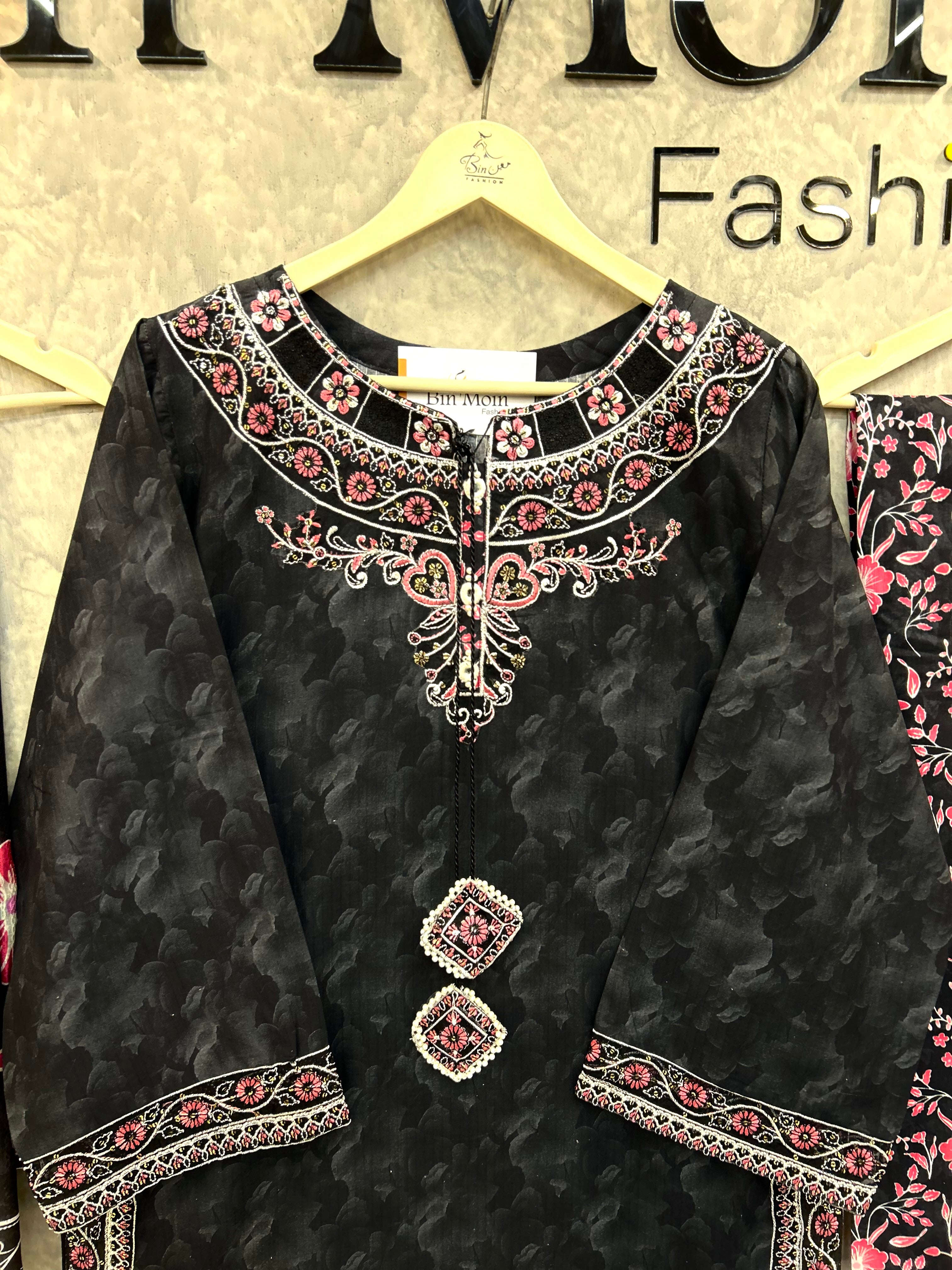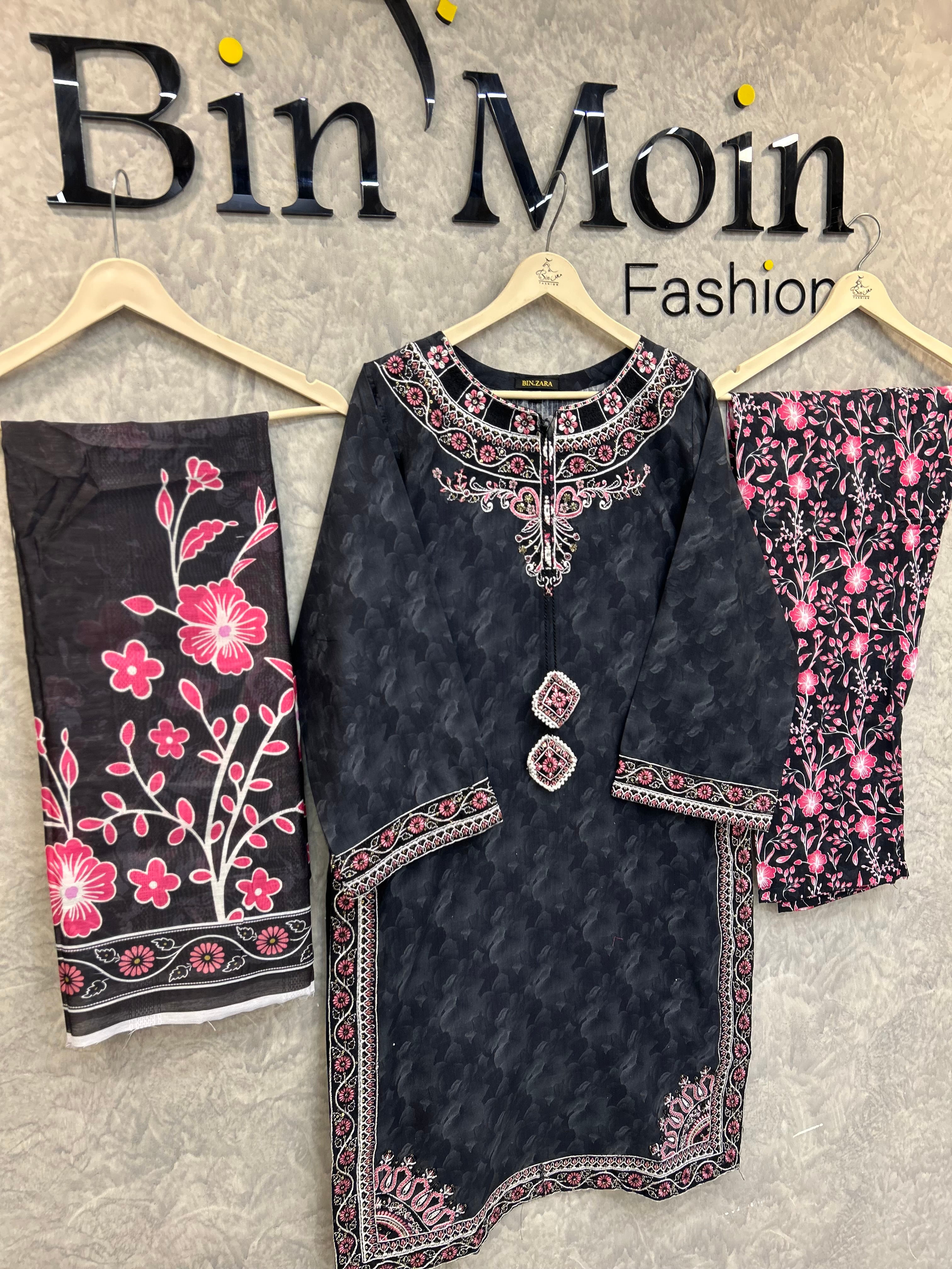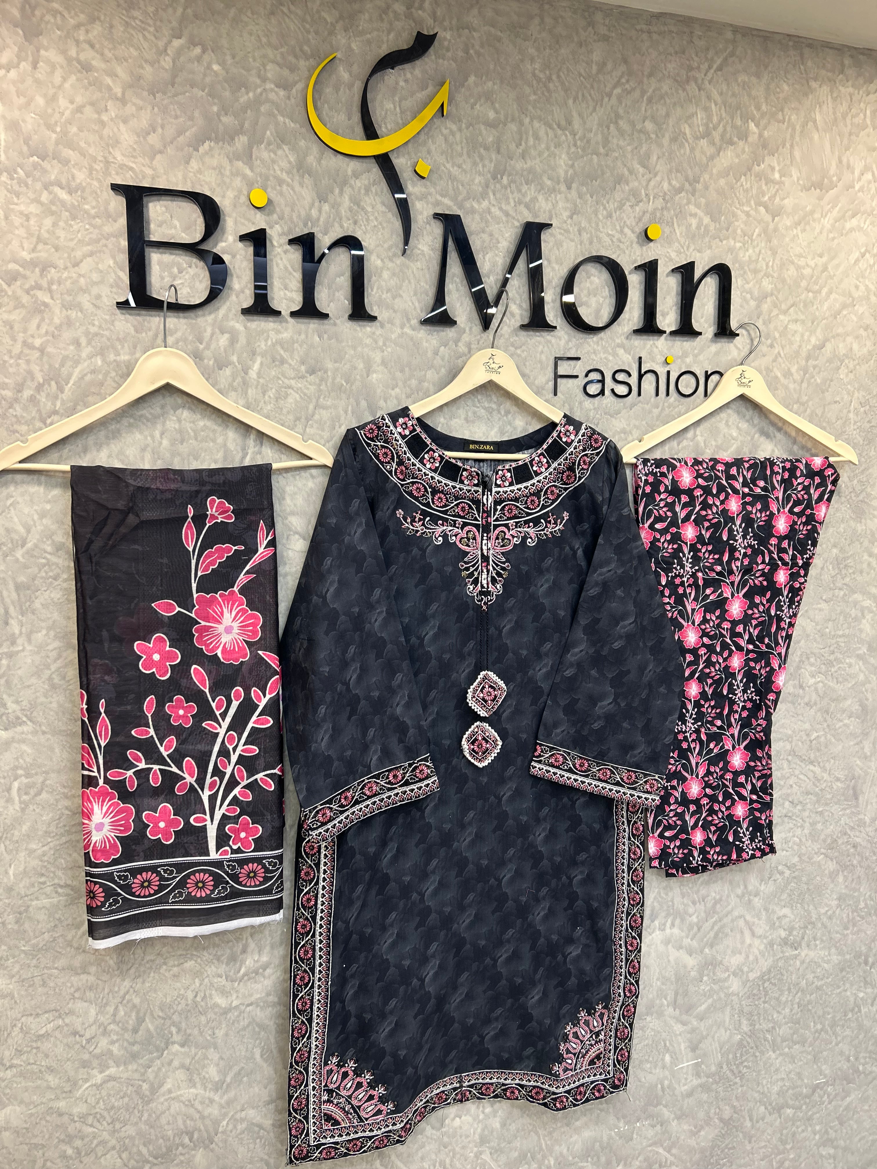 Embrace the allure of the night with the "Midnight Rose" ensemble from Bin Moin Fashion. This sophisticated 3-piece suit is meticulously crafted from premium, breathable Lawn fabric, offering a perfect blend of airy comfort and high-end style. The charcoal-black base serves as a dramatic canvas for the intricate pink and white embroidered neckline, which is beautifully accented by traditional hanging tassels for a touch of movement and grace. The shirt is finished with delicate floral borders along the hem and sleeves, perfectly mirroring the vibrant, full-floral print of the matching trousers. Complete with a flowing dupatta featuring elegant pink vines, this outfit is designed for the woman who carries an air of timeless mystery and effortless sophistication.