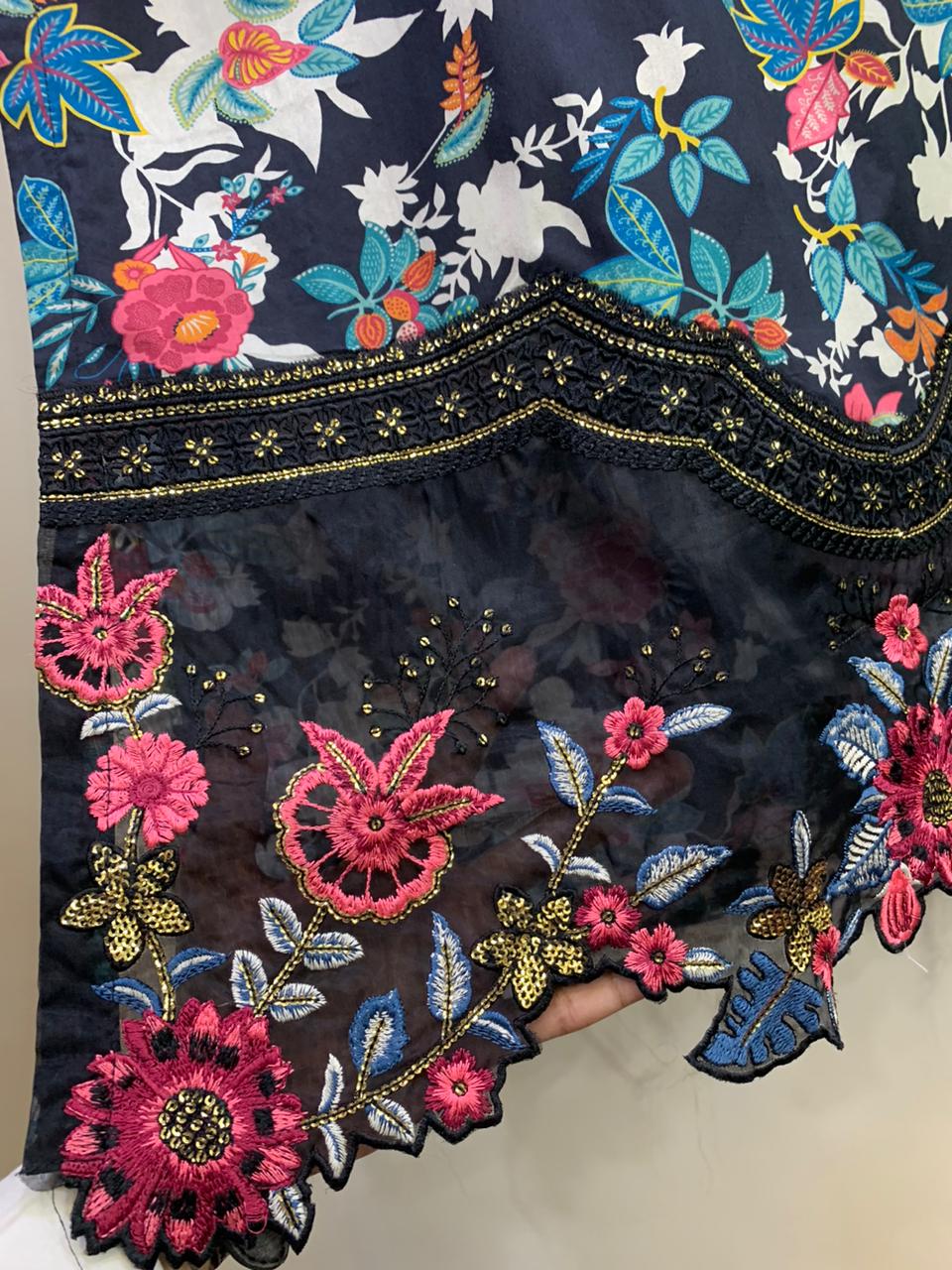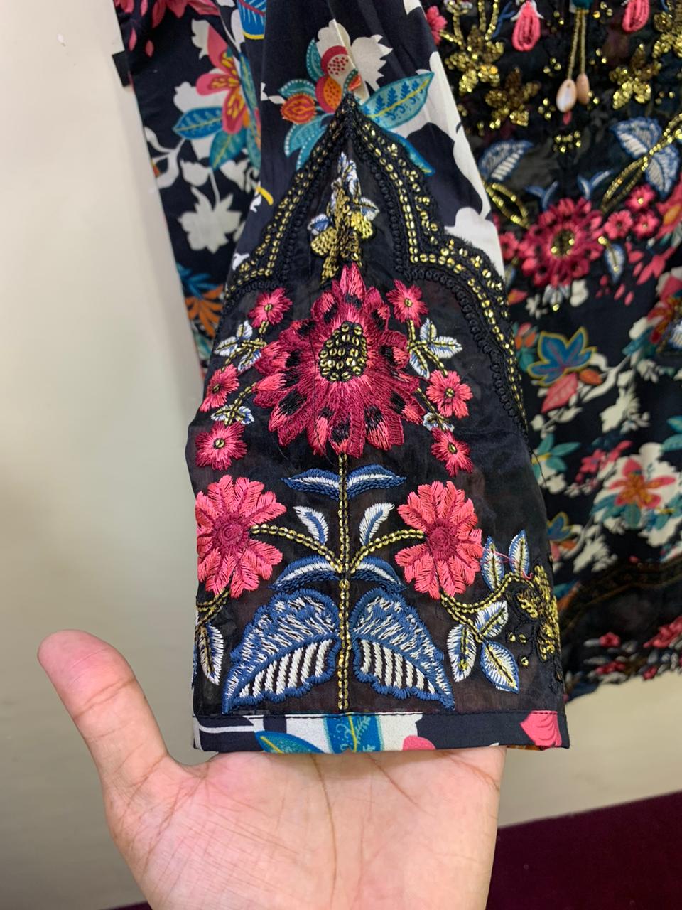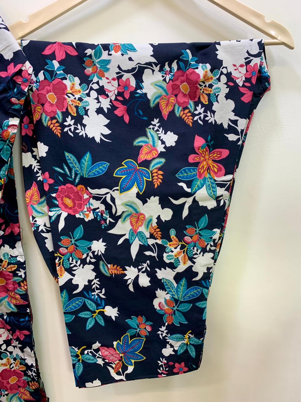 Paired with coordinating printed trousers that mirror the vibrant floral pattern, this creates a balanced and cohesive three-piece look (dupatta is implied to be similar or contrasting).