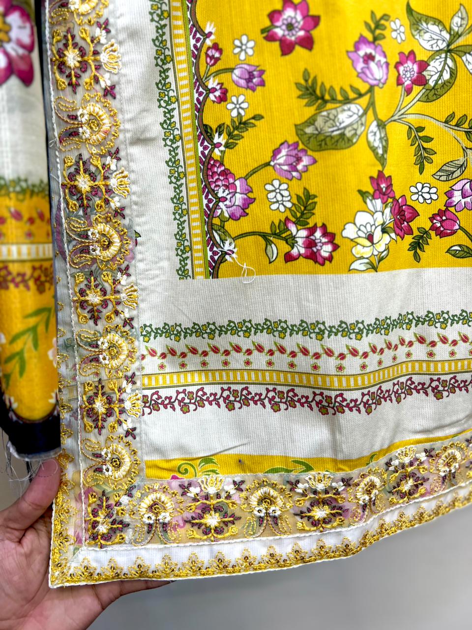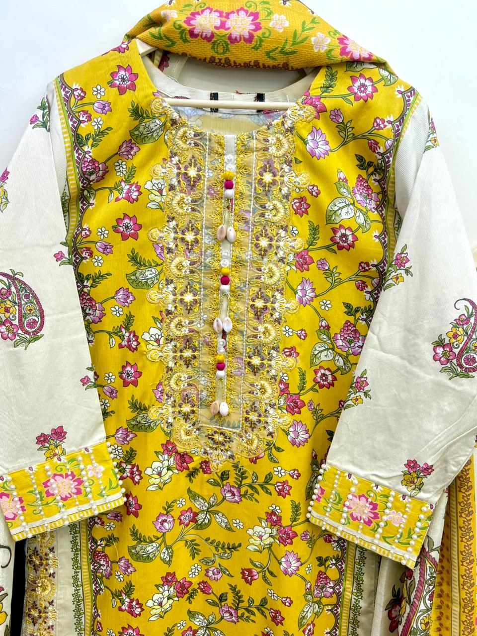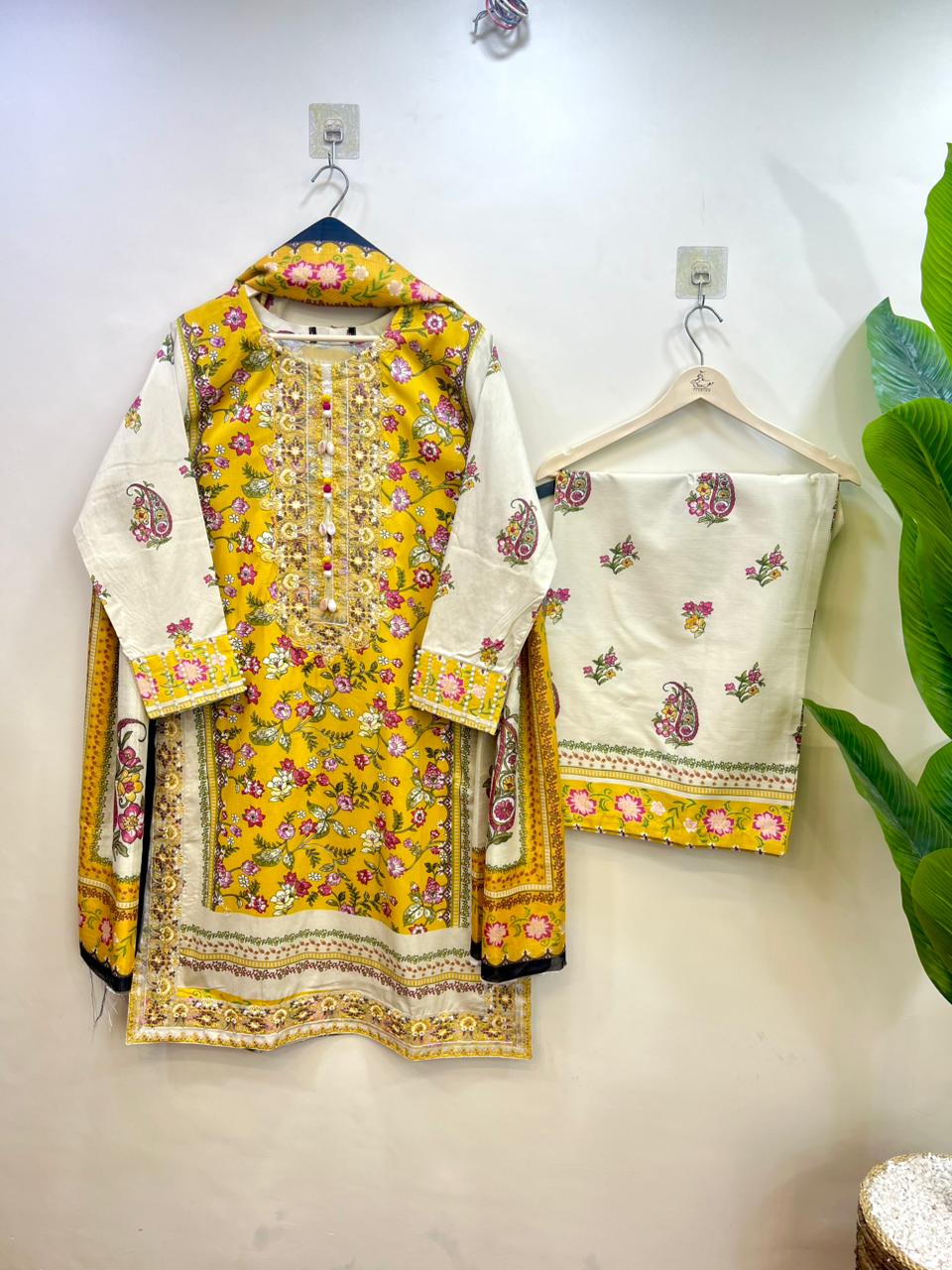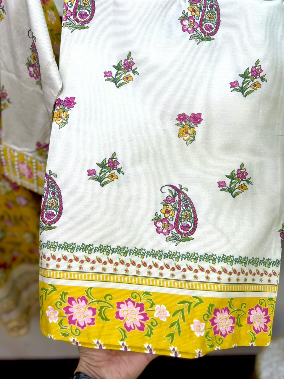 This striking three-piece suit is crafted from premium Cotrai Cotton Fabric, featuring a bright mustard yellow central panel beautifully adorned with pink floral prints.