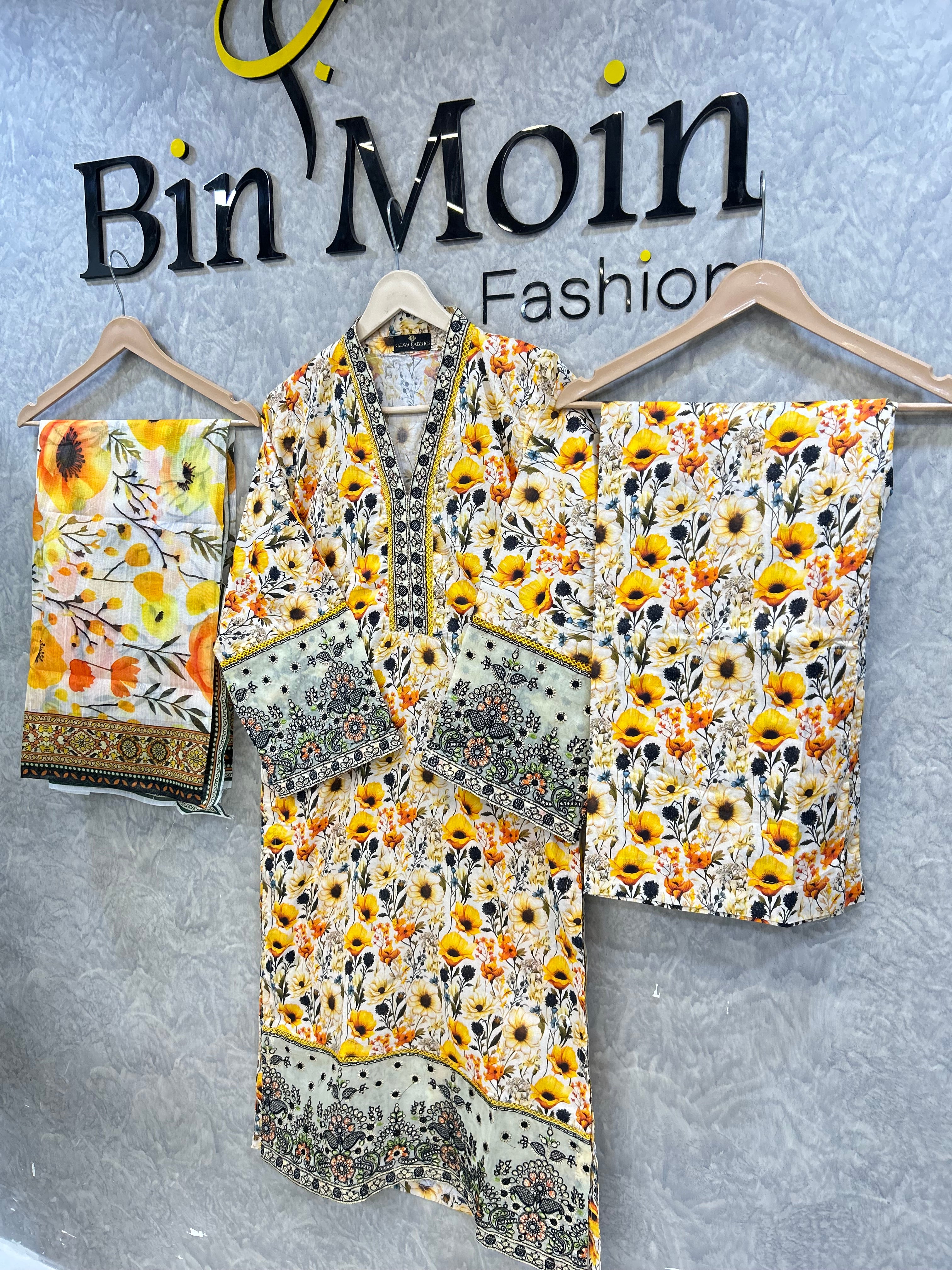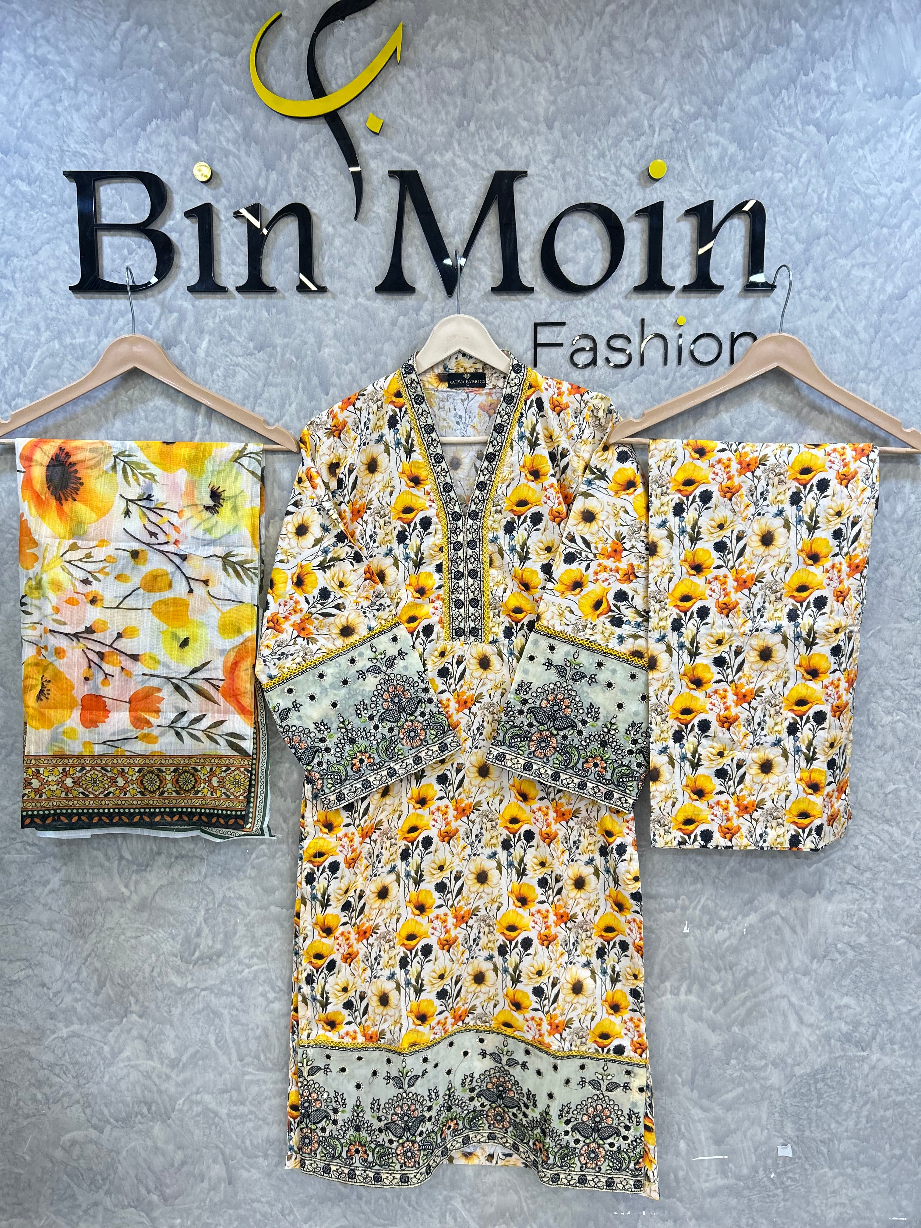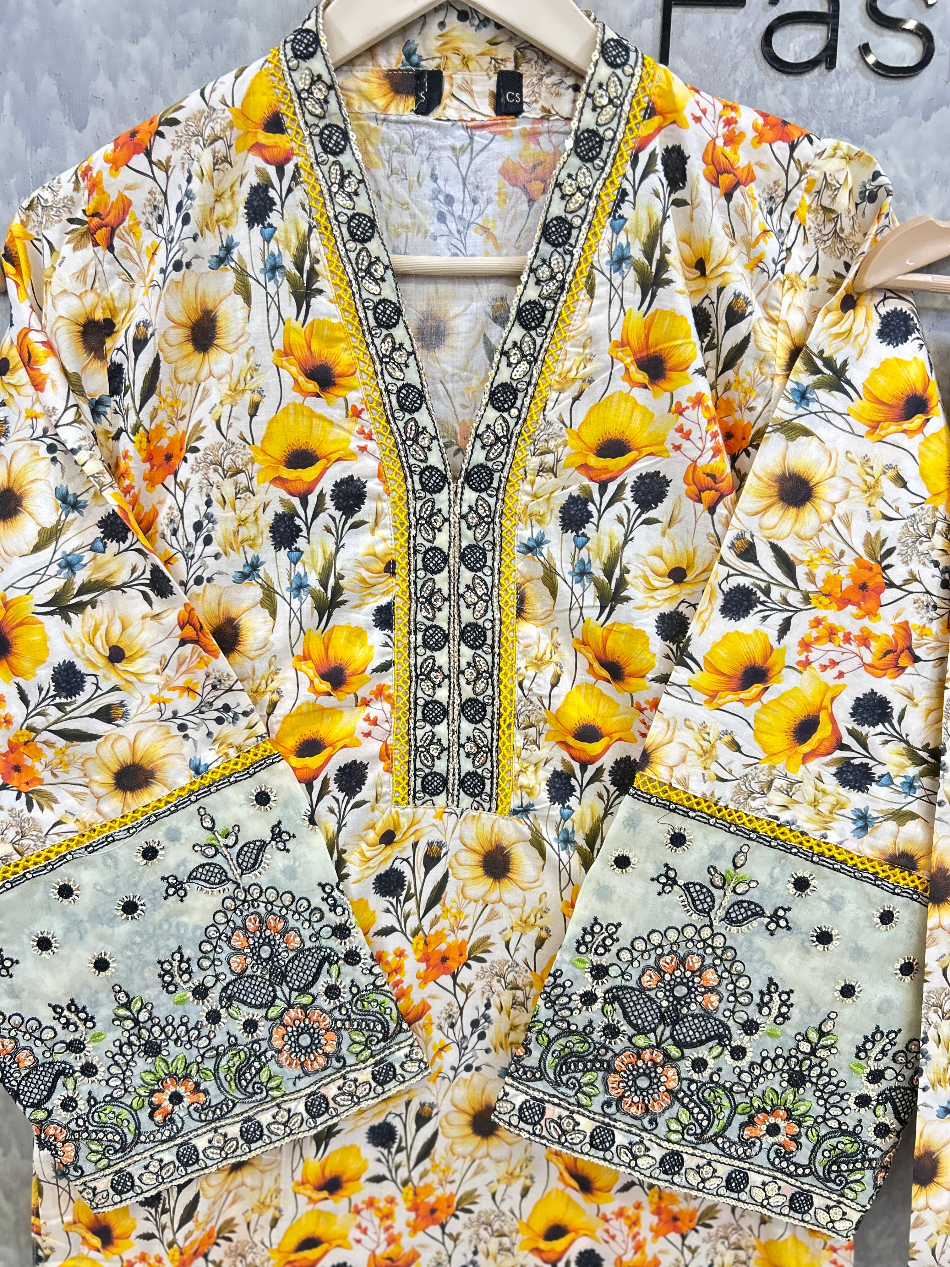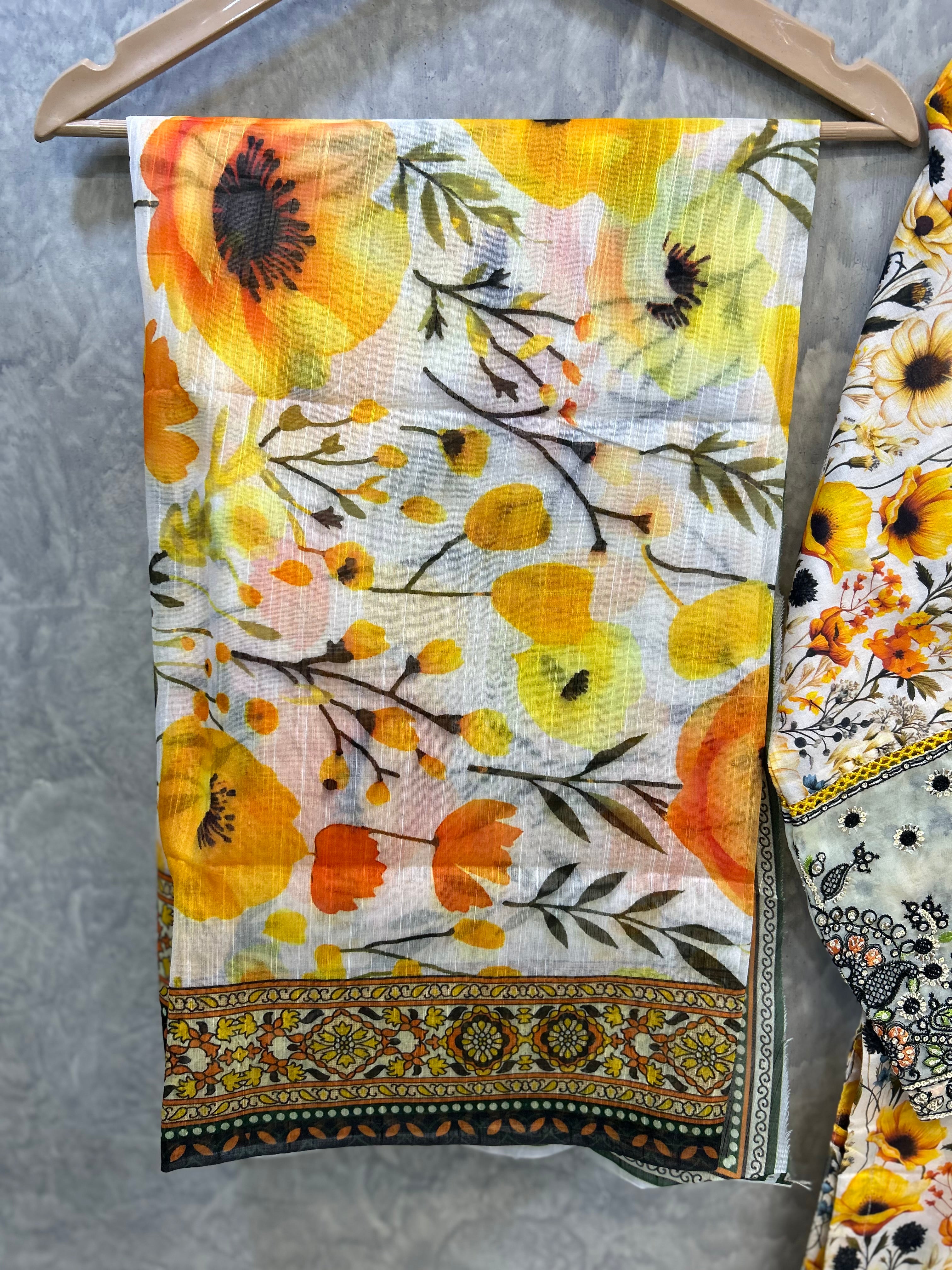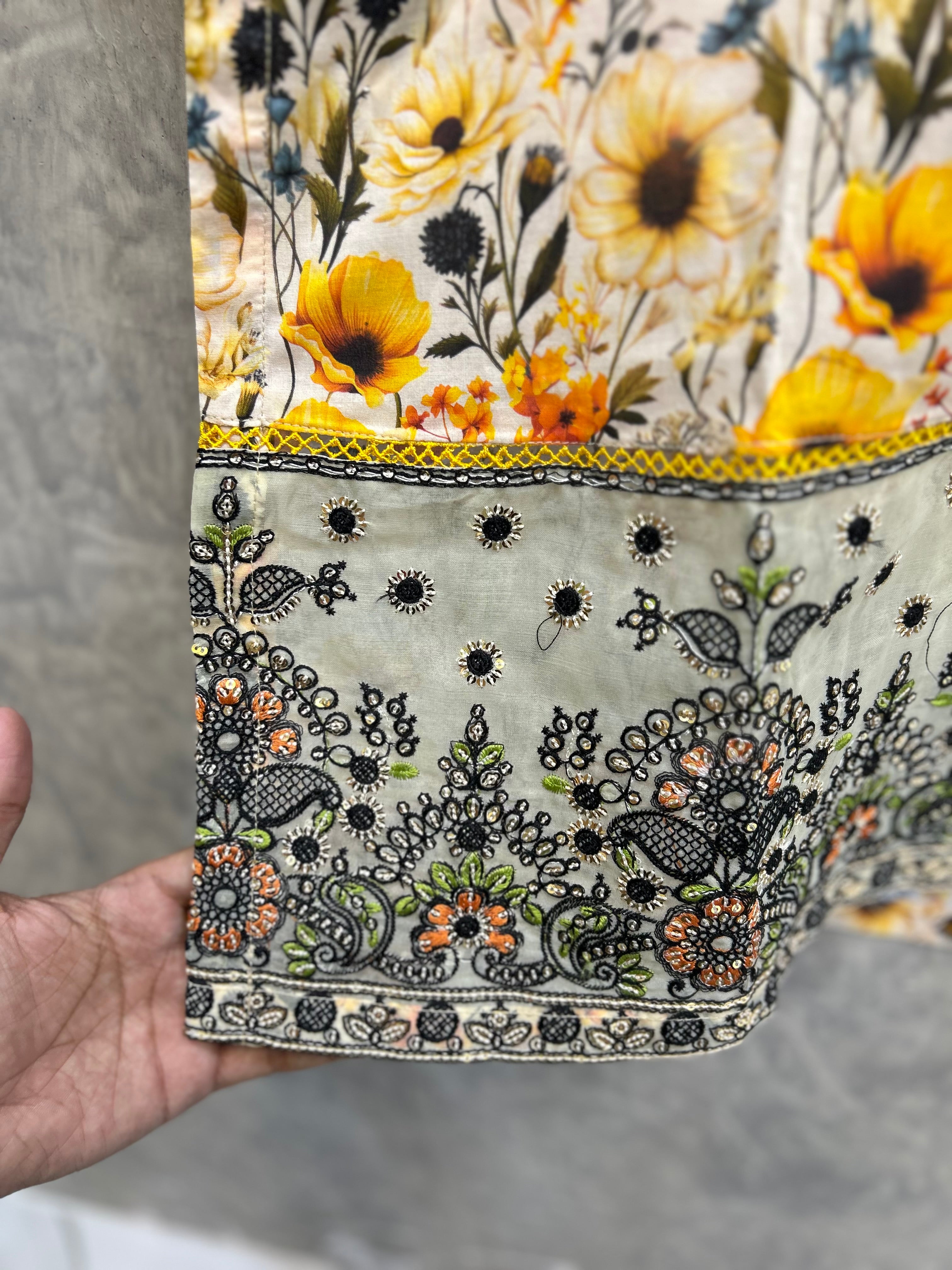 Experience effortless grace with this pastel mint 3-piece luxury ensemble. The shirt features an exquisite white lace-overlay neckline and delicate floral embroidery in soft pink tones. With intricate laser-cut lace detailing on the sleeves and a heavy scalloped lace hemline, this outfit offers a refined, high-end look. Paired with a floral-embroidered dupatta and classic matching trousers, it is the perfect choice for sophisticated daytime events or festive tea parties.